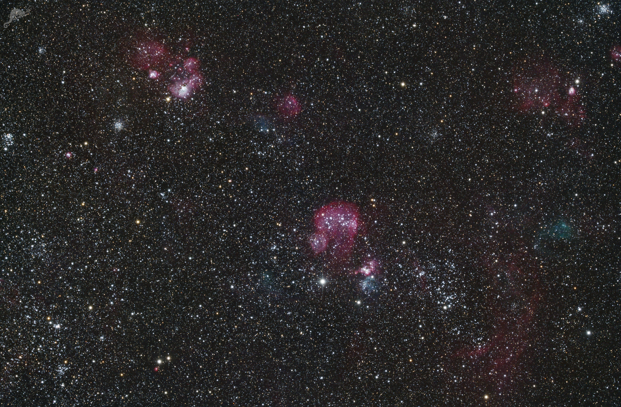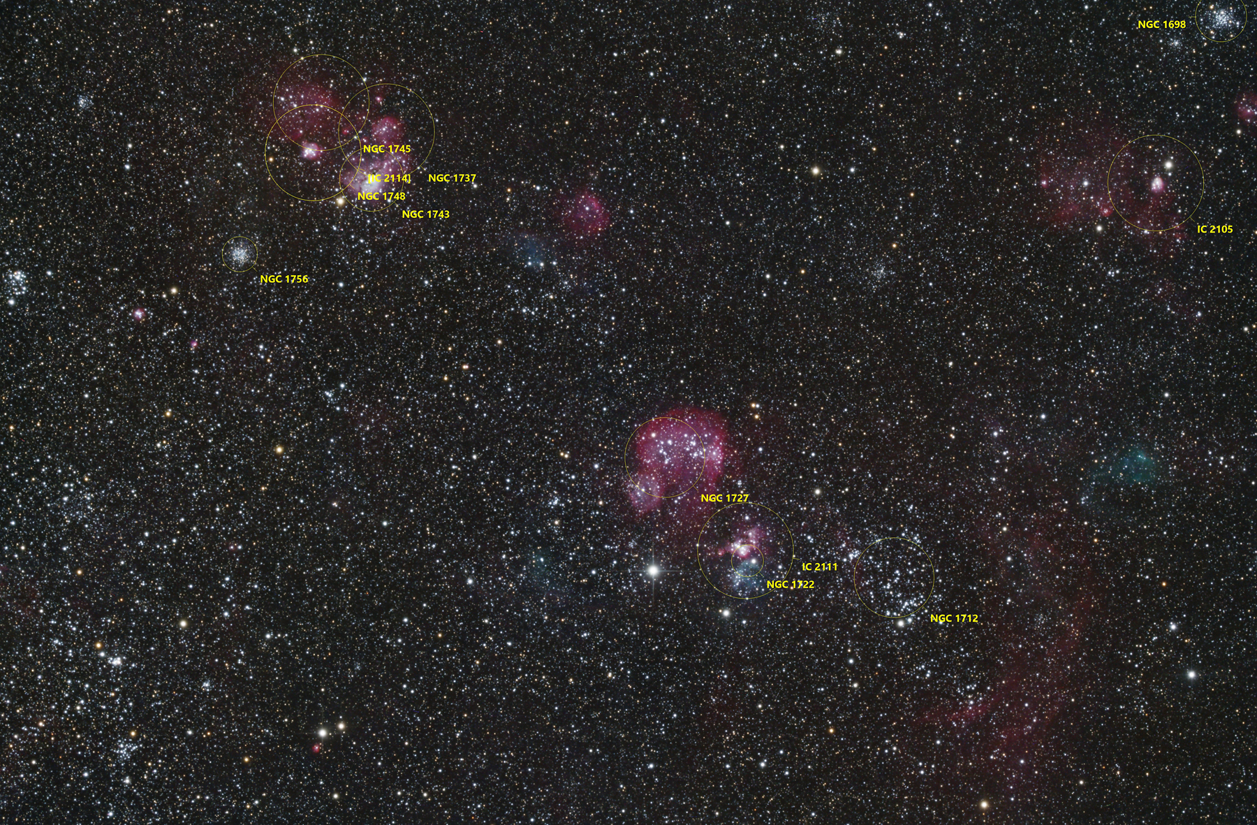 | Objektbeschreibung: NGC 1727 und NGC 1743 - Unser Bild zeigt die beiden großen und hellen Emissionsnebelgebiete NGC 1727 (Bildmitte) und NGC 1743 in der großen Magellanschen Wolke. Eingebettet in NGC 1727 liegt ein großer offener Sternhaufen. Die Sternentstehungsregionen in der Magellanschen Wolke sind deutlich größer als die in unserer Milchstraße. Des weiteren zeigt die Aufnahme weitere offene Sternhaufen wie z.B. NGC 1712, NGC 1722, NGC 1756 und NGC 1698 sowie weitere Nebelregionen und Sternhaufen, die offenbar nicht in den gängigen Katalogen erfasst sind. Alle diese Sternhaufen sind sehr jung und sicher zeitgleich entstanden. Object description NGC 1727 und NGC 1743 - Our image shows the two large and bright emission nebulae NGC 1727 (image center) and NGC 1743 in the Large Magellanic Cloud. Embedded in NGC 1727 is a large open star cluster. The star-forming regions in the Magellanic Cloud are significantly larger than those in our Milky Way. |