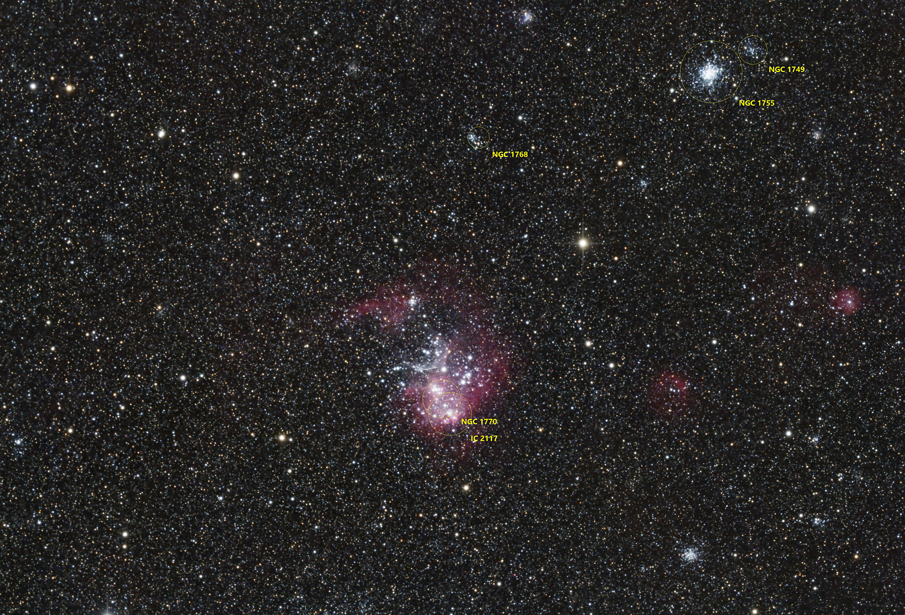 | Objektbeschreibung: NGC 2074 und NGC 2081 - in der Bildmitte liegt der helle Emissionsnebel NGC 1770, ein Teilbereich in der großen Magellanschen Wolke. Eingebettet in die H-II Region liegt ein großer, heller offener Sternhaufen. NGC 1755 - am oberen rechten Bildrand - ist ein außergewöhnliches Objekt. Klassifiziert als offener Sternhaufen mit sehr jungen Sternen erscheint er auf Grund seiner Konzentration fast wie ein Kugelsternhaufen. Und so wird er auch als so genannter "blauer Kugelsternhaufen" bezeichnet - eine Objektklasse, die es in unserer Milchstraße nicht gibt. Die Kugelsternhaufen in unserer Galaxie enthalten die ältesten Sterne, die wir kennen. In der Magellanschen Wolke bilden jedoch sehr junge, heiße und blaue Sterne solche kugelförmige Objektklasse. Im Jahr 2021 wurde der Sternhaufen mit dem Hubble Weltraumteleskop ausführlich untersucht. |