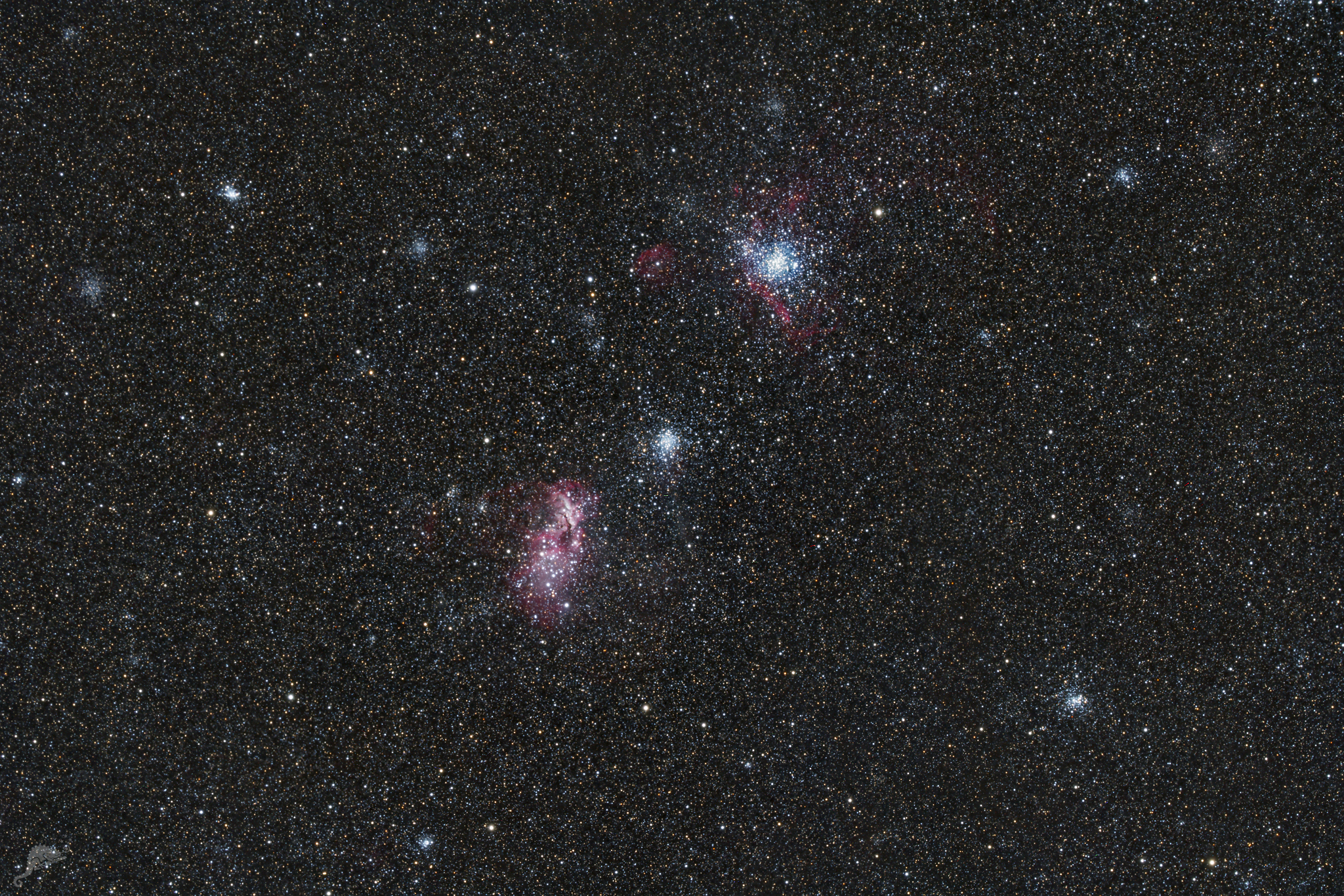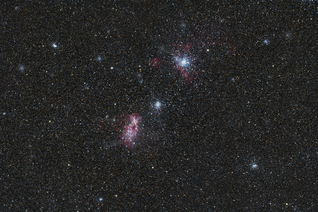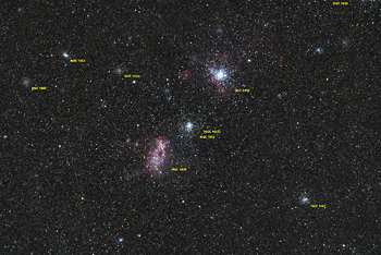 Objektbeschreibung: NGC 1850, NGC 1855 and NGC 1858 - Unser Bild zeigt eine weitere Detailansicht von Emissionsnebeln und Sternhaufen in der großen Magellanschen Wolke (LMC). Etwas unterhalb und links der Bildmitte liegt NGC 1855, eine H-II Sternentstehungsregion (N 105 A) in die ein sehr junger offener Sternhaufen eingebettet ist. Oberhalb und etwas rechts der Bildmitte liegt NGC 1850, eine weitere Sternentstehungsregion in der großen Magellanschen Wolke. Das Gebiet ist Teil der Superblase N 103, eines Supernovaüberrests ähnlich des Cirrus Nebels in unserer Milchstraße. Eingebettet in das Wasserstoffgas liegt ein außergewöhnliches Objekt. Es ist ein so genannter "blauer, kugelförmiger Sternhaufen" - eine Objektklasse, die es in unserer Milchstraße nicht gibt. Die Kugelsternhaufen in unserer Galaxie enthalten die ältesten Sterne, die wir kennen. In der Magellanschen Wolke bilden jedoch sehr junge, heiße und blaue Sterne solche kugelförmige Objektklasse. Schaut man genauer hin, handelt es sich sogar um einen Doppelsternhaufen. Die beiden Komponenten (siehe auch beschriftetes Bild unten) des Haufens sind beide relativ jung und bestehen aus einem kugelförmigen Hauptsternhaufen im Zentrum (NGC 1850) und einem noch jüngeren, kleineren Haufen (NGC 1850 A), der aus extrem heißen, blauen Sternen und schwächeren roten T-Tauri-Sternen besteht. Der Haupthaufen ist etwa 50 Millionen Jahre alt; der kleinere Haufen ist nur 4 Millionen Jahre alt. Ein ähnliches Objekt ist NGC 1755, von dem wir hier ein Bild zeigen. Neben 30 Doradus und NGC 1755 ist es der hellste Sternhaufen in der LMC. NGC 1850 überdeckt einen wahren Durchmesser von etwa 150 Lichtjahre. Eine detaillierte Studie des Hubble Teleskops finden Sie hier Annähernd in Bildmitte liegt der Kugelsternhaufen NGC 1854, der im NGC Katalog auch mit dem Eintrag 1855 geführt wird. Der Sternhaufen wurde mit dem Hubble Space Teleskop im Jahr 2016 intensiv untersucht. Weiterhin zeigt unser Bild einige weitere offene Sternhaufen, teilweise in keinem Katalog registriert. Geschätzt befinden sich in der großen Magellanschen Wolke etwa 60 Kugel- und um die 700 offene Sternhaufen. Object description Our image shows another detailed view of emission nebulae and star clusters in the Large Magellanic Cloud (LMC). Slightly below and to the left of the center of the image is NGC 1855, an H-II star forming region (N 105 A) in which a very young open star cluster is embedded. Above and slightly to the right of the center of the image is NGC 1850, another star-forming region in the Large Magellanic Cloud. The region is part of the super bubble N 103, a supernova remnant similar to the Cynus loop in our Milky Way. Embedded in the hydrogen gas lies an extraordinary object. It is a so-called "blue globular star cluster" - a class of object that does not exist in our Milky Way. The globular clusters in our galaxy contain the oldest stars that we know of. In the Magellanic Cloud, however, very young, hot and blue stars form such a globular object class. If you take a closer look, it is actually a double star cluster. The two components of the cluster are both relatively young and consist of a spherical main star cluster in the center (NGC 1850) and an even younger, smaller cluster (NGC 1850 A), which consists of extremely hot, blue stars and fainter red T Tauri stars. The main cluster is about 50 million years old; the smaller cluster is only 4 million years old. A detialed study of the the Hubble Space Telescope can be found here |