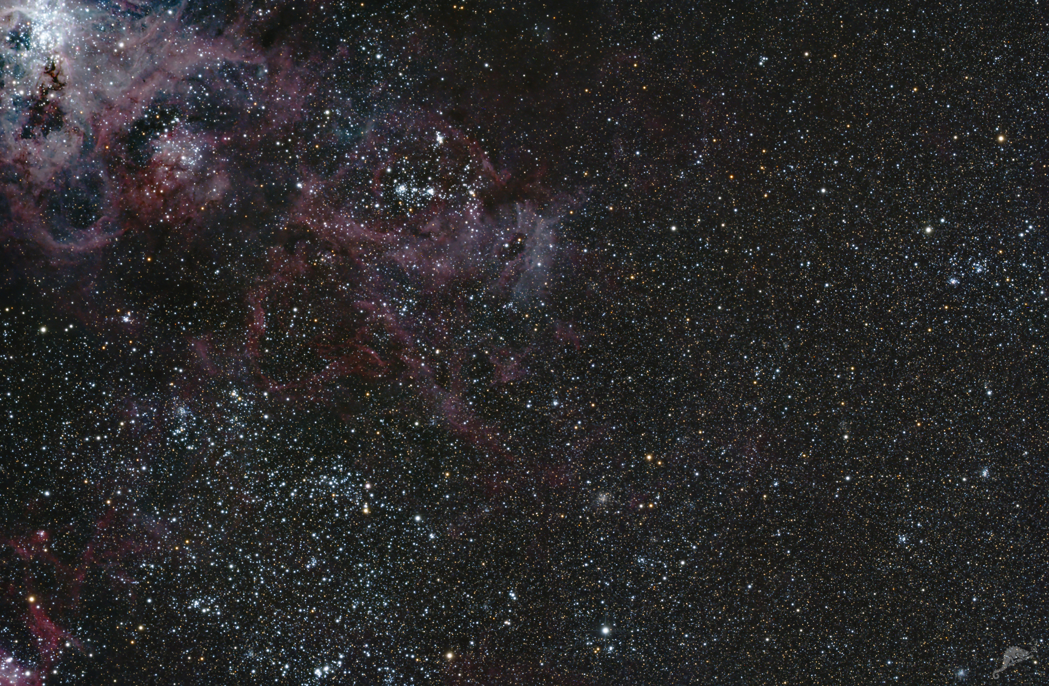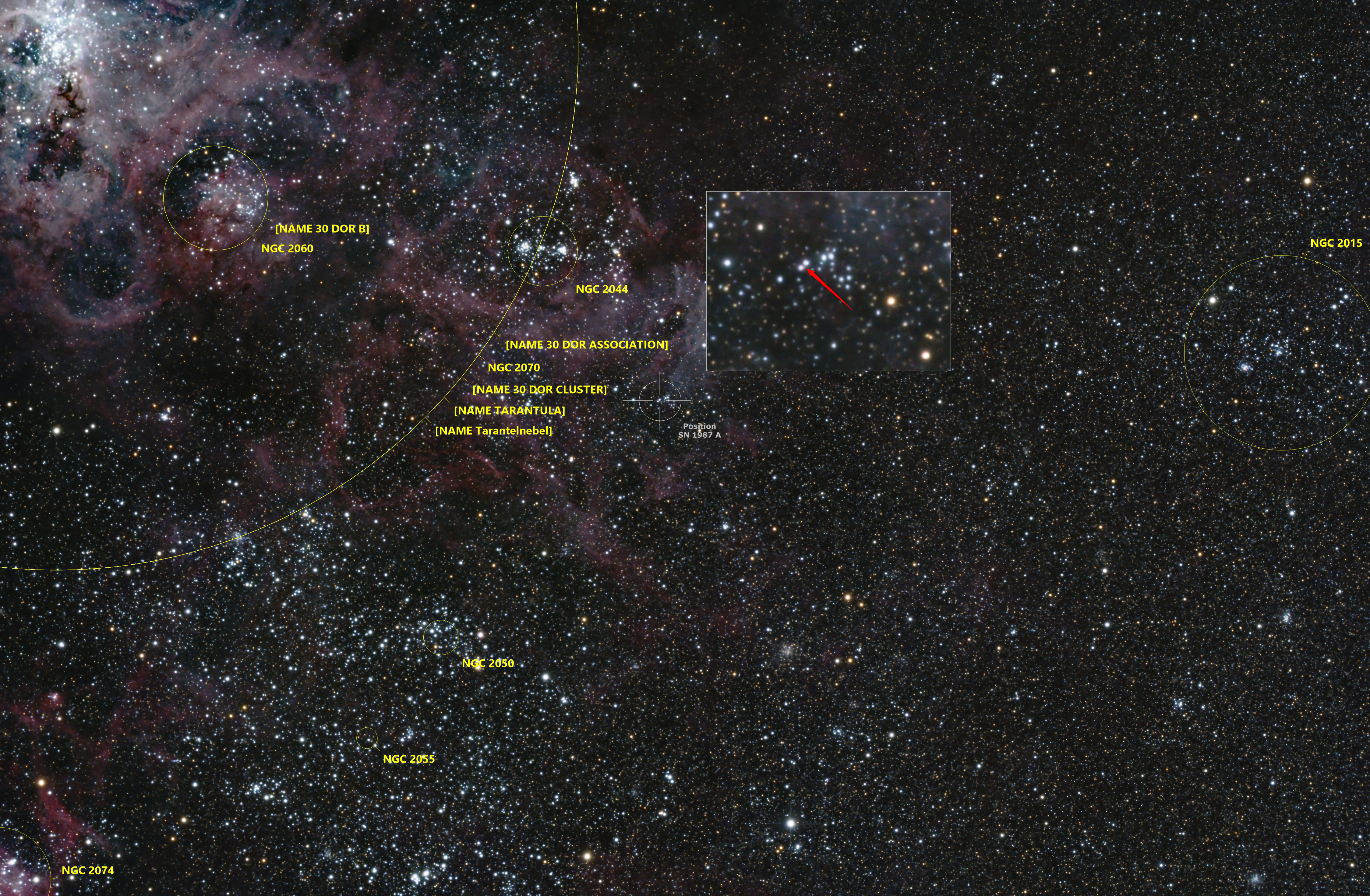| Objektbeschreibung: SN 1987 A - nachdem wir 2023 und 2024 einige der NGC Objekte mit unserem Planewave Astrographen mit längerer Brennweite im Detail aufgenommen hatten, kam die Idee auf, das Teleskop doch mal auf die Position der Supernova 1987 A zu positionieren, um zu schauen, ob mit einem Amateurteleskop Überreste der Explosion nach 37 Jahren nachzuweisen sind. Und tatsächlich zeigt sich auf unserem Bild ein schwaches rötliches Leuchten an der Position von SN 1987 A, siehe dazu unser beschriftetes Bild. SN 1987A war die erdnächste Supernova, die seit "Keplers" Supernova im Jahr 1604 beobachtet werden konnte. Sie war auch die erste Supernova, bei der der Vorgängerstern identifiziert werden konnte. Der mit seinem Kernkollaps die Explosion auslösende Stern war Teil eines Dreifachsternsystems. Er wurde bereits vor der Explosion von Nicholas Sanduleak in einem Verzeichnis von heißen blauen Sternen in Magellanschen Wolke klassifiziert. Alles weitere zu SN 1987 A ist hier zu finden. Object description SN 1987 A - After we had imaged some of the NGC objects in detail with our Planewave Astrograph with a longer focal length in 2023 and 2024, the idea came up to point the telescope at the position of supernova 1987 A to see if remains of the explosion could be detected with an amateur telescope after 37 years. And indeed, our image shows a faint reddish glow at the position of SN 1987 A, see our labeled image. |