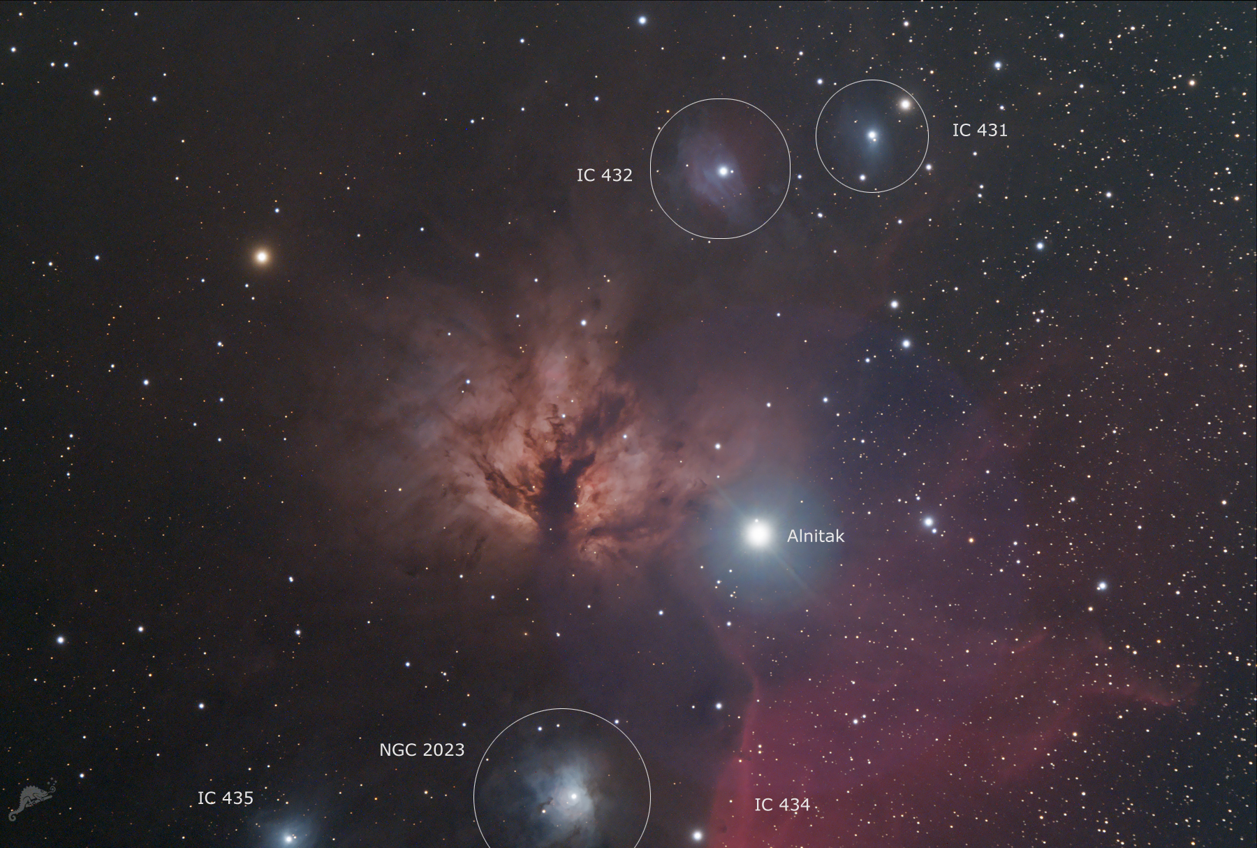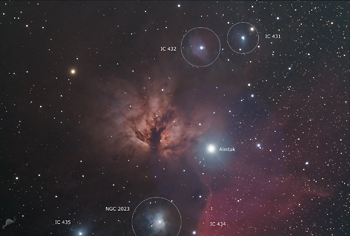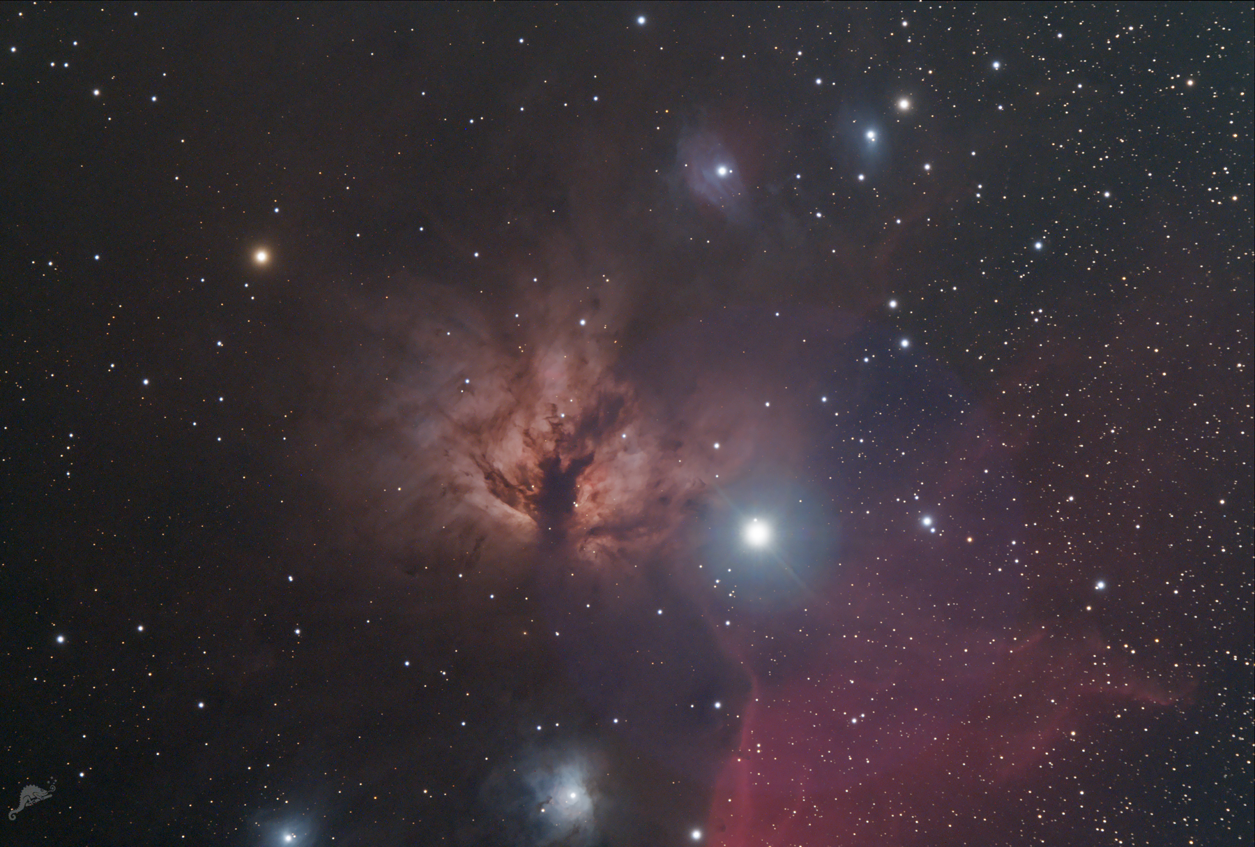| Objektbeschreibung: NGC 2024 - etwa 1.500 Lichtjahre vom Sonnensystem entfernt befindet sich NGC 2024, auch als der "Flammenebel" bezeichnet. Es ist ein Emissionsnebel und Teil des Orion-Komplexes, einem Sternentstehungsgebiet, zu dem unter anderem auch IC 434 mit dem Pferdekopfnebel und der Orion-Nebel gehören. Professionelle Infrarotbeobachtungen zeigen im Inneren (im sichtbaren Licht durch Dunkelwolken verdeckt) einen sehr jungen Sternhaufen bei dem viele Sterne von Akkretionsscheiben umgeben sind. Das Objekt wurde am 1. Januar 1786 von Friedrich Wilhelm Herschel entdeckt. Direkt westlich von NGC 2024 befindet sich der Gürtelstern Alnitak (Zeta Orionis). Es handelt es sich jedoch nur um eine scheinbare Nähe, denn Alnitak liegt nur etwa halb so weit von der Erde entfernt und somit besteht kein räumlicher Zusammenhang zwischen den beiden Objekten. Alnitak ist ein 3-fach Sternsystem, der Hauptstern ist ein blauer Überriese der Spektralklasse O9 mit einer Oberflächentemperatur von ca. 25.000 Kelvin. Sein Durchmesser entspricht etwa dem20-fachen unserer Sonne. Object description NGC 2024 - also known as the "Flame Nebula", is located around 1,500 light years from the solar system. It is an emission nebula and part of the Orion Complex, a star-forming region that also includes IC 434 with the Horsehead Nebula and the Orion Nebula. Professional infrared observations show a very young star cluster in the interior (obscured by dark clouds in visible light) in which many stars are surrounded by accretion disks. The object was discovered by Friedrich Wilhelm Herschel on January 1, 1786. |