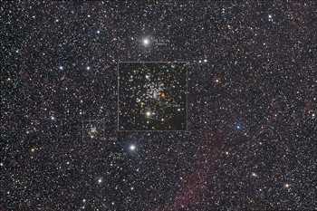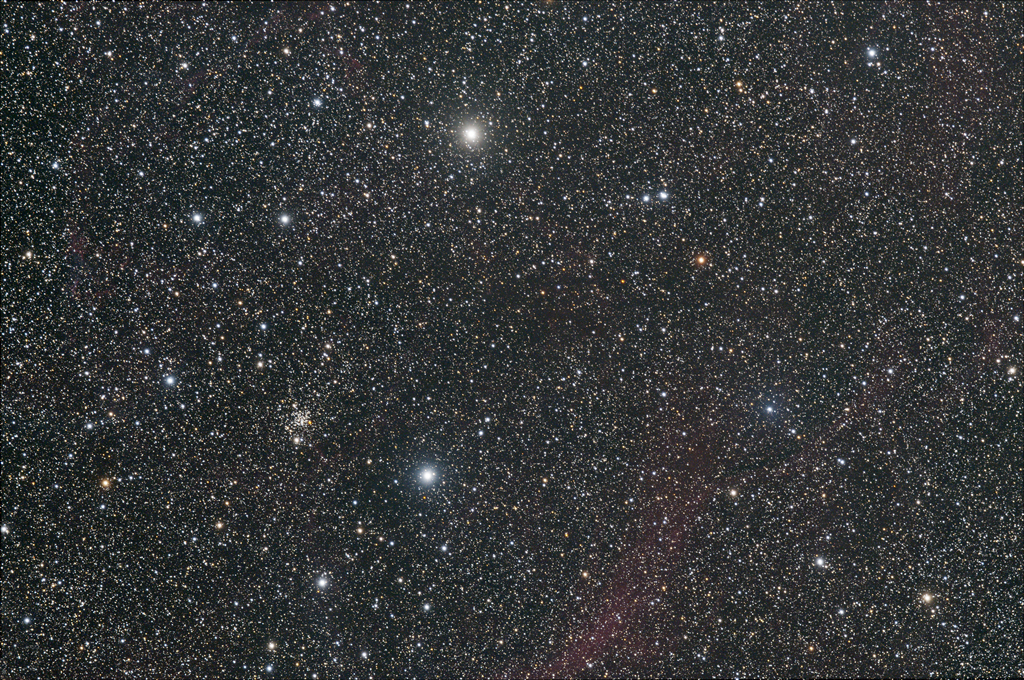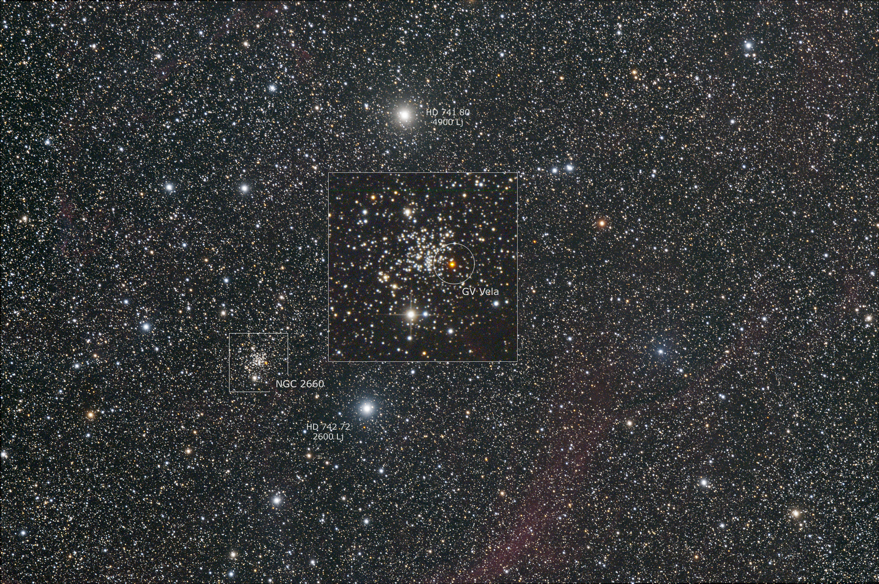 | Objektbeschreibung: NGC 2660 - unser Bild zeigt NGC 2660, seiner Konzentration erscheint er wie ein Kugelsternhaufen, ist jedoch im NGC Katalog als offener Sternhaufen katalogisiert. Er ist etwa 9.200 Lichtjahre vom Sonnensystem entfernt und wird nach Trumpler der Klasse I 3 m zu geordnet. Entdeckt wurde der Sternhaufen am 29. Dezember 1834 von John Herschel. Interessant ist der rötliche Stern GV Vela, etwa 60 Bogensekunden westlich am Rand des Sternhaufens. Es ist ein Carbon Stern des Typs N - irregulär veränderlich - des Spektraltyps K. GV Vela ist mit annähernder Sicherheit ein Mitglied von NGC 2660. Eine ausführliche Untersuchung von NGC 2660 ist hier zu finden, ein Bild des Hubble Teleskops hier. Object description NGC 2660 - Our image shows NGC 2660, its concentration makes it appear like a globular cluster, but it is cataloged as an open star cluster in the NGC catalog. It is about 9,200 light years away from the solar system and is classified as class I 3 m according to Trumpler. The star cluster was discovered by John Herschel on December 29, 1834. |