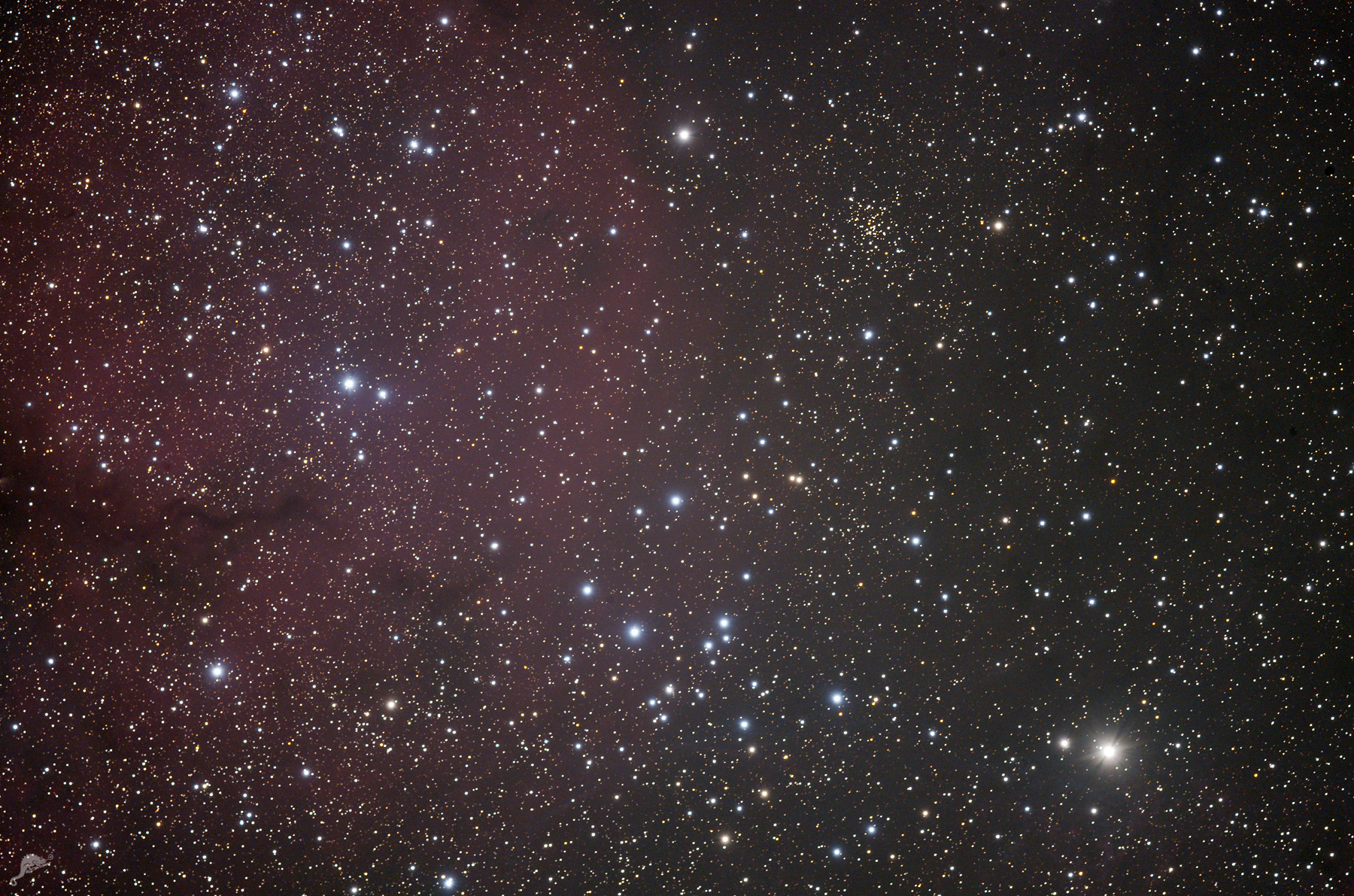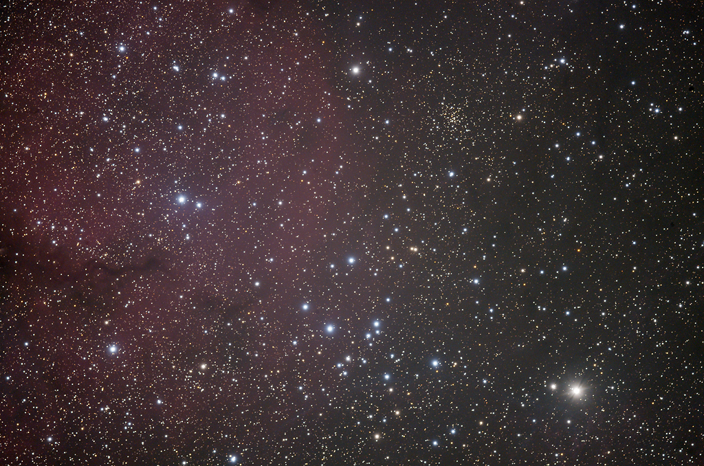 | Objektbeschreibung: NGC 2671, Trumpler 10 und RCW 33 im Sternbild Vela - unser Bild zeigt einen Ausschnitt im Sternbild Vela. Die rötliche H-II Region ist als RCW 33 katalogisiert, sie ist Teil einer großen Sternentstehungsregion, auch bekannt als GUM 15. Das Bild zeigt 2 offene Sternhaufen: oberhalb der Bildmitte, etwas nach rechts versetzt NGC 2671 und unterhalb der Bildmitte Trumpler 10. Tr 10 ist nur etwa 1300 Lichtjahre von der Erde entfernt und das Alter der Sterne wird auf etwa 50 Millionen Jahre geschätzt. NGC 2671 ist mit einer Entfernung von etwa 5.400 Lichjahren deutlich weiter vom Sonnensystem entfernt. Er beinhaltet etwa 40 hellere Sterne und wird nach Trumpler der Klasse I 3 p zugeordnet. Ein Mosaik der GUM 15 Region zeigen wir hier. Object description |
