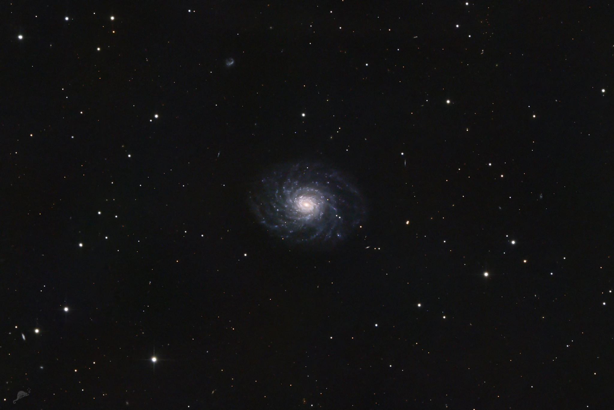 | Objektbeschreibung: NGC 3486 - unser Bild zeigt die "Struwelpeter" Galaxie im Sternbild kleiner Löwe. Sie ist ein extremer Sonderfall dieser Objektklasse, denn während die meisten Galaxien zwei Spiralarme ausgebilden, gibt aber auch solche, bei denen sich die Arme weiter außen aufsplitten. NGC 3486 zeigt von innen heraus eine Vielzahl von Spiralarmen. Der vergleichsweise kleine, hellere Kern geht über in eine sehr weiträumigen Spiralstruktur, deren Helligkeit schnell abnimmt. Klassifiziert ist sie als eine Balkenspirale vom Typ SBc. Sie ist etwa 30 Millionen Lichtjahre vom Sonnensystem entfernt und wurde am 11. April 1785 von William Herschel entdeckt. Object description NGC 3486 - Our image shows the "Struwelpeter" galaxy in the constellation of Leo Minor. The galaxy is an extreme special case of this object class. While most galaxies form two spiral arms, there are also some where the arms split further out. NGC 3486 shows a multitude of spiral arms from the inside. The comparatively small, brighter core merges into a very extensive spiral structure whose brightness decreases rapidly. It is classified as a barred spiral of type SBc. It is about 30 million light years away from the solar system and was discovered by William Herschel on April 11, 1785. |