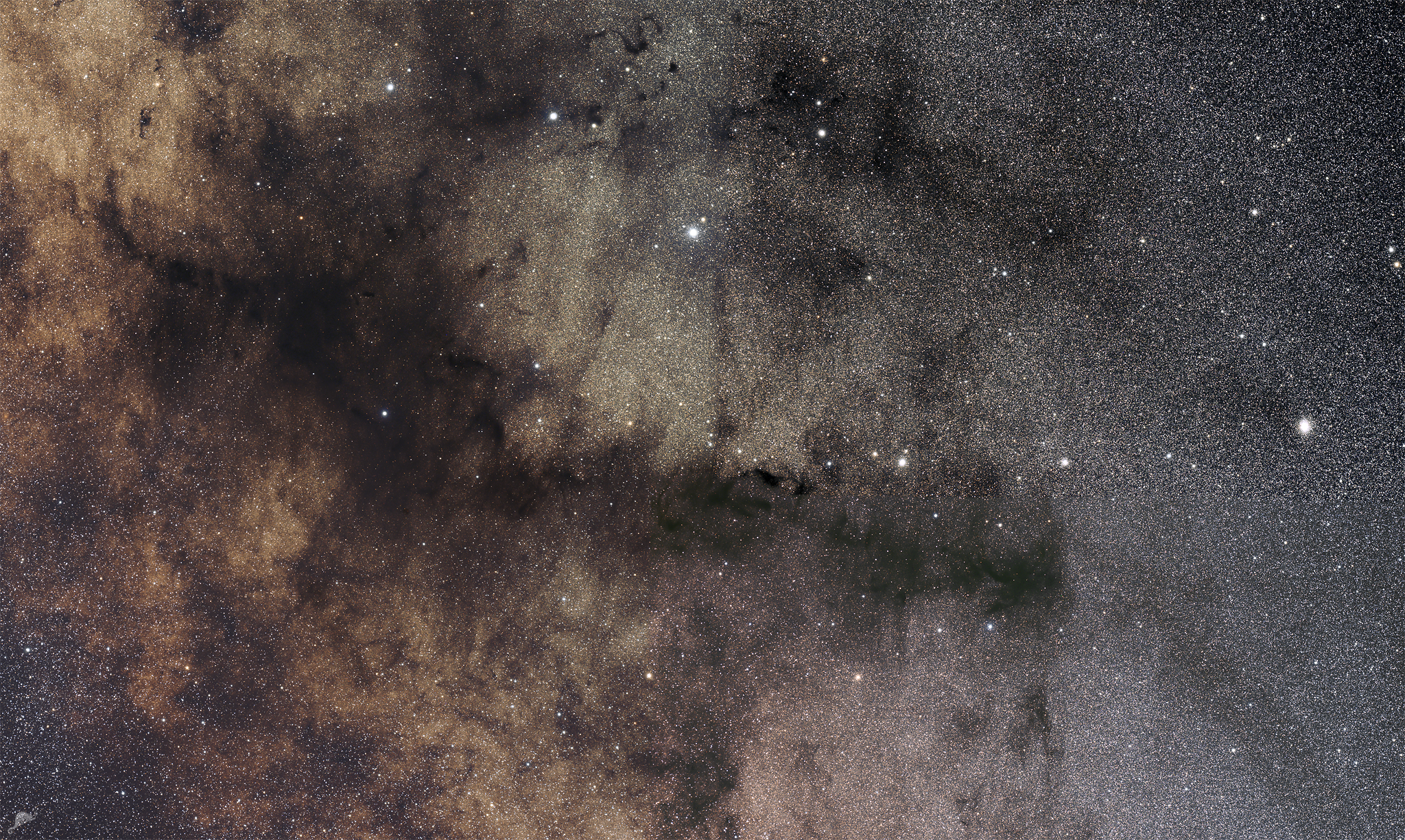 | Objektbeschreibung: LDN 42 (Barnard 78), der Pfeifennebel - unser Bild zeigt ein Mosaik, bestehend aus 4 Segmenten, des "Pfeifennebels". Er ist ein Dunkelwolkenkomplex aus Dunkelwolken. Aufgrund seiner charakteristischen Form hat er den gängigen Namen "Pfeifennebel" erhalten. Im linken Teil des Bildes ist der Pfeifenkopf und der Pfeifenrauch zu sehen, bestehend aus Barnard 78, bzw. LDN 42 (Lynds Dark Nebula). Der "Rauch" besteht aus den Dunkelwolken LDN 79, 80 und 87 (siehe auch das beschriftete Bild weiter unten). Der hellste Stern nördlich der Bildmitte ist 44 Ophiuchus. Im rechten Bildteil ist der "Stiehl der Pfeife" zu sehen, bestehend aus den Katalogbezeichnungen Barnard 579/76-67 und 77. In diesem Bereich wird deutlich sichtbar, wie unterschiedlich dicht diese Dunkelwolken sein können. In den dichtesten Bereichen solcher Wolken kollabiert Staub und Gas und neue Sterne entstehen. Oben in Bildmitte steht der Schlangennebel (Barnard 72) und der sehr dichte Bereich von Barnard 86. Das gesamte Bildfeld überdeckt in etwa 64 Quadratgrat. Ein weiteres Mosaik, südlich des Pfeifennebels zeigen wir hier. Einen detaillierten Blick auf den Schlangennebel und Barnard 86 finden Sie hier. Object description LDN 42 (Barnard 78), the pipe nebula - Our image shows a mosaic consisting of four segments of the "Pipe Nebula." It is a complex of dark clouds. Due to its characteristic shape, it has been given the common name "Pipe Nebula." The left part of the image shows the pipe head and pipe smoke, consisting of Barnard 78 and LDN 42 (Lynds Dark Nebula), respectively. The "smoke" consists of the dark clouds LDN 79, 80, and 87 (see also the labeled image below). The brightest star north of the center of the image is 44 Ophiuchus. The right-hand part of the image shows the "Stem of the Pipe," consisting of the catalog designations Barnard 579/76-67 and 77. |