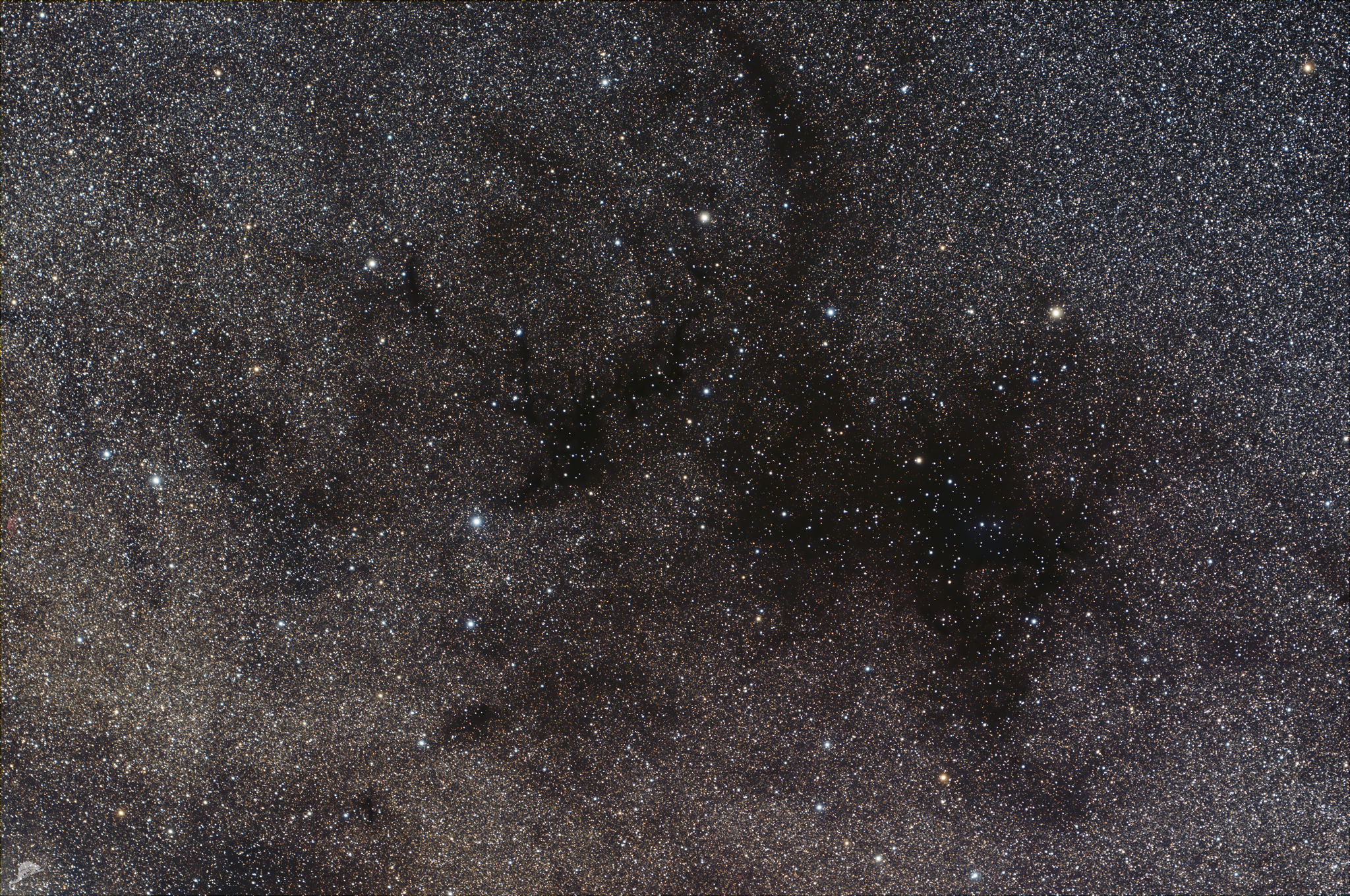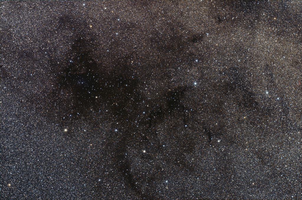 | Objektbeschreibung: Sandquist 169 - Unser Bild zeigt den Dunkelwolkenkomplex Sandquist 169 im Sternbild Circinus . Er liegt direkt südöstlich von alpha Centauri inmitten der südlichen Milchstraße. Es ist die drittgrößte Dunkelwolke des Sandquist Kataloges, der 1977 publiziert wurde. Zusammen mit einigen weiteren östlich liegenden Dunkelwolken wird die Region auch als die Circinuswolke bezeichnet. Innerhalb der dichtesten Partien findet aktuell Sternentstehung - vornehmlich von Massearmen Sternen - statt. Im infraroten Licht lassen sich mindesten 6 Herbig-Haro Objekte beobachten. Die Gesamtmasse der Dunkelwolke wird auf etwa 50.000 Sonnenmassen geschätzt. Sie liegt ungefähr 2.300 Lichtjahre vom Sonnensystem entfernt und hat diagonal einen wahren Durchmesser von etwa 2 Lichtjahren. Object description Sandquist 169 - Our image shows the dark cloud complex Sandquist 169 in the constellation Circinus. It lies direct southeast of Alpha Centauri in the middle of the southern Milky Way. It is the third largest dark cloud in the Sandquist catalog, which was published in 1977. Together with several other dark clouds to the east, the region is also known as the Circinus Cloud. Star formation is currently taking place within the densest parts, primarily of low-mass stars. At least six Herbig-Haro objects can be observed in infrared light. The total mass of the dark cloud is estimated at about 50,000 solar masses. It is located about 2,300 light-years from the solar system and has a true diameter of about 2 light-years diagonally. |