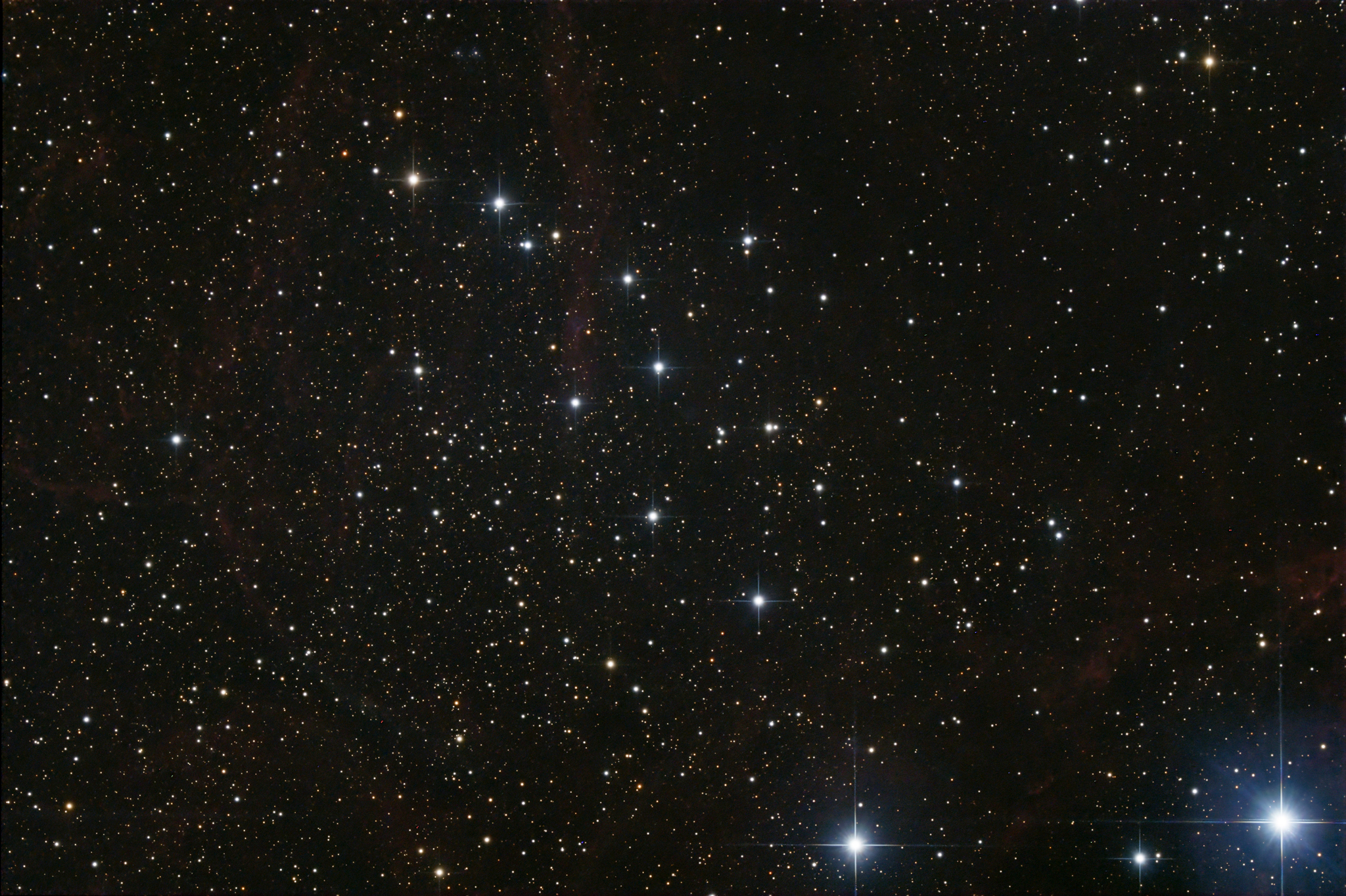 | Objektbeschreibung: Van den Bergh Hagen 34 - Van den Berg Hagen 34 - unser Bild zeigt den offenen Sternhaufen Van den Bergh Hagen 34 zusammen mit einigen sehr lichtschwachen Filamenten des Vela Supernovaüberrestes. Über den Sternhaufen sind im Internet so gut wie keine Informationen zu finden. Die hellen Sterne im Feld rechts unten sind HD 72 350 und HD 72 127. Eine Widefieldansicht, zusammen mit dem offenen Sternhaufen Pismis 4 zeigen wir hier. Der Sternhaufen befindet sich in der gleichen Sichtlinie wie Filamente des Vela Supernova-Überrest - am Himmel nur unweit der Position des Vela Pulsars entfernt - aber mit einer Entfernung von knapp 2.000 Lichtjahren deutlich weiter entfernt als der Vela Pulsar und deren Filamente, die nur etwa 800 Lichtjahre vom Sonnensystem entfernt sind. Sidney van den Bergh, ein kanadischer Astronom, beschäftigte sich mit Sternen, die mit Reflexionsnebeln assoziiert sind. Dazu untersuchte er Abzüge des Palomar Sky Survey. Van den Bergh fasste seine Objekte in einem eigenen Katalog mit 159 Einträgen zusammen, den er 1966 im Astronomical Journal veröffentlichte. Object description Van den Bergh Hagen 34 - Our image shows the open star cluster Van den Bergh Hagen 34 together with some very faint filaments of the Vela supernova remnant. There is virtually no information about this star cluster on the Internet. The bright stars in the lower right field are HD 72 350 and HD 72 127. Here we show a wide-field view together with the open star cluster Pismis 4. The star cluster is located in the same line of sight as filaments of the Vela supernova remnant - not far from the position of the Vela pulsar in the sky - but at a distance of almost 2,000 light-years, it is significantly further away than the Vela pulsar and its filaments, which are only about 800 light-years from the solar system. Sidney van den Bergh, a Canadian astronomer, studied stars associated with reflection nebulae. To do this, he examined prints from the Palomar Sky Survey. Van den Bergh compiled his objects in a separate catalog with 159 entries, which he published in the Astronomical Journal in 1966. |