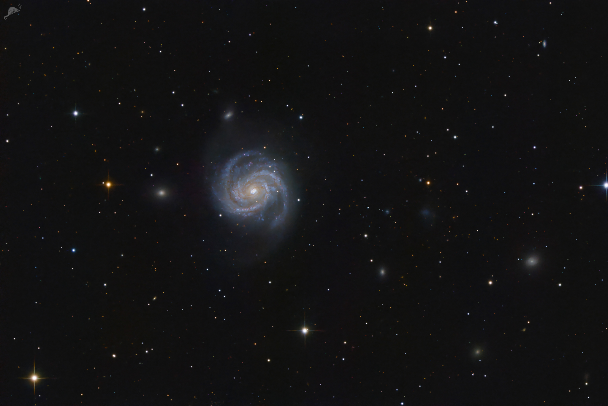 | Objektbeschreibung: Messier 100 - unser Bild zeigt als Hauptobjekt die Galaxie Messier 100. Sie ist eine aktive Balken-Spiralgalaxie mit ausgedehnten Sternentstehungsgebieten vom Hubble-Typ SBbc im Sternbild Haar der Berenike. M 100 ist ein Teil des Virgo Galaxienhaufens, liegt aber nicht zentral sondern am nördlichen Rand des Haufens. Ihre Entfernung zum Sonnensystem beträgt ungefähr knapp 70 Millionen Lichtjahre. Sie ähnelt in Masse und Größe unserer Milchstraße. M 100 ist die zentrale Galaxie einer kleinen Galaxiengruppe, die als Holm 387 katalogisiert ist und zu der vornehmlich Zwerggalaxien gehören. Links oben im Bild zeigen sich auffällig viele lichtschwache gelbliche Objekte. Es sind sehr weit entfernte Galaxie, die zum Galaxienhaufen Zwicky 5113. |