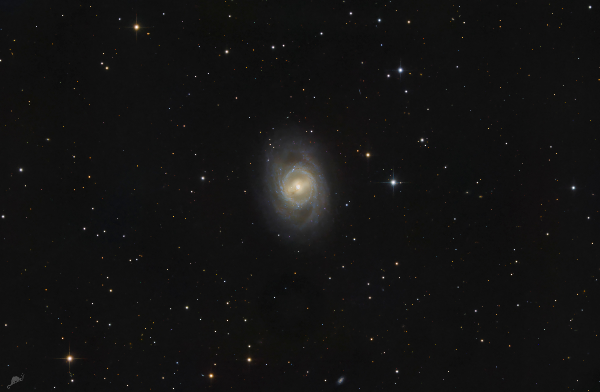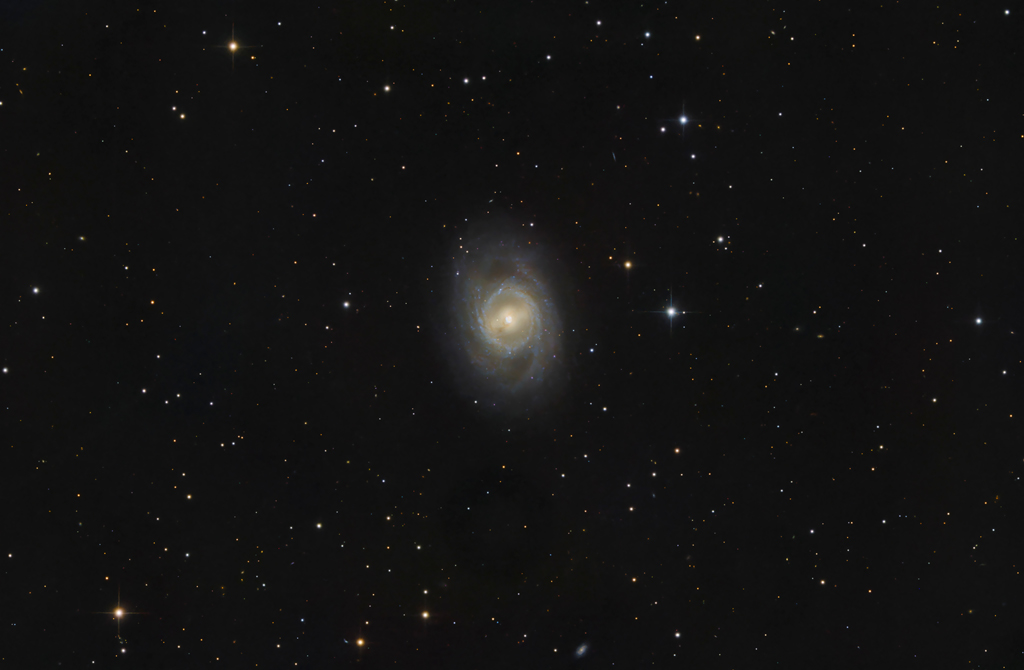 | Objektbeschreibung: Messier 95 - ist ein wunderschönes Beispiel für den Prototyp einer Balken Spiralgalaxie im Sternbild Löwe. Wir blicken nahezu senkrecht auf die Rotationsachse der Galaxie und können so den zentralen Balken sehen, der die beiden Hauptspiralarme mit einander verbindet. Sie wird nach der Hubble Sequenz als Typ SB(r)b und zudem als Starburstgalaxie klassifiziert. M95 ist etwa 30 Millionen Lichtjahe vom Sonnensystem entfernt und am 20. März 1781 von dem französischen Astronomen Pierre Méchain entdeckt. Object description Messier 95 - is a beautiful example of the prototype of a barred spiral galaxy in the constellation Leo. We are looking almost perpendicular to the galaxy's axis of rotation and can therefore see the central bar connecting the two main spiral arms. It is classified as type SB(r)b according to the Hubble sequence and also as a starburst galaxy. M95 is about 30 million light-years away from the solar system and was discovered on March 20, 1781, by the French astronomer Pierre Méchain. |