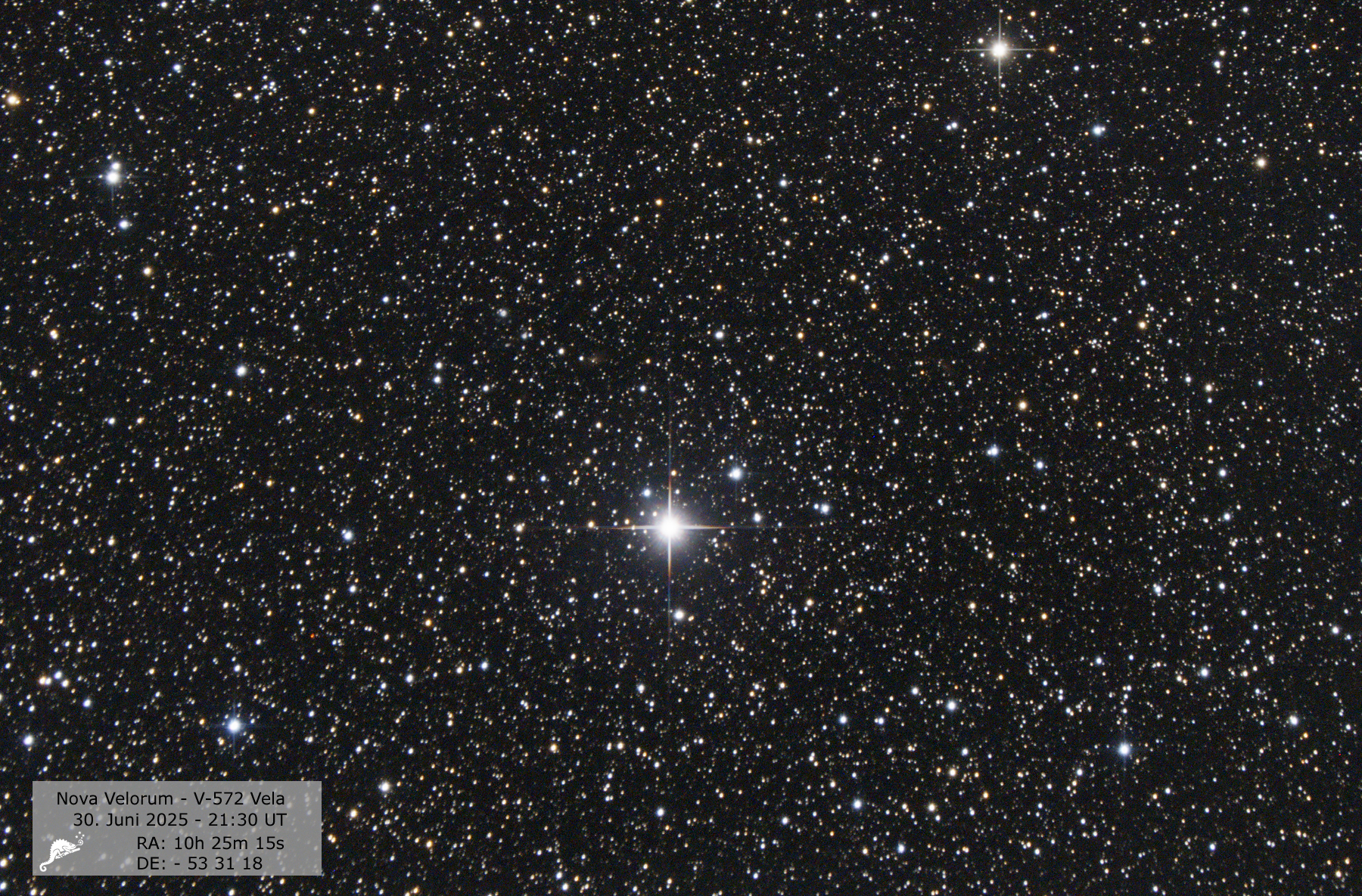 | Objektbeschreibung: Nova Velorum - zeigt unser Bild, aufgenommen am 30. Juni mit unserem PlaneWave Astrographen. Entdeckt am 25. Juni, zeigt unser Bild die Nova zum Zeitpunkt ihrer größten Helligkeit bei etwa 4mag8, somit war die Nova mit bloßem Auge im Sternbild Segel des Schiffs sichtbar. Alle Novae sind Doppelsternsysteme bei denen Materie von einem roten Riesenstern auf Grund von Gravitation auf einen Weißen Zwergstern fließt, bis eine kritische Grenze erreicht wird und die Materie "thermonuklear zündet". Das besondere an der Nova Velorum: etwa zeitgleich war am Himmel die Nova Lupi 2025 (V-462- Lupi) am Himmel sichtbar, von der wir hier ein Bild zeigen. Object description Nova Velorum - shows our image, taken on June 30 with our PlaneWave astrograph. Discovered on June 25, our image shows the nova at its maximum brightness of approximately 4-mag-8, making it visible to the naked eye in the constellation Vela. All novae are binary star systems in which matter flows from a red giant star to a white dwarf star due to gravity until a critical limit is reached and the matter "thermonuclearly ignites." What is special about Nova Velorum is that at around the same time, Nova Lupi 2025 (V-462-Lupi) was visible in the sky, a picture of which we show here. |