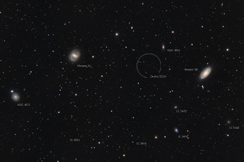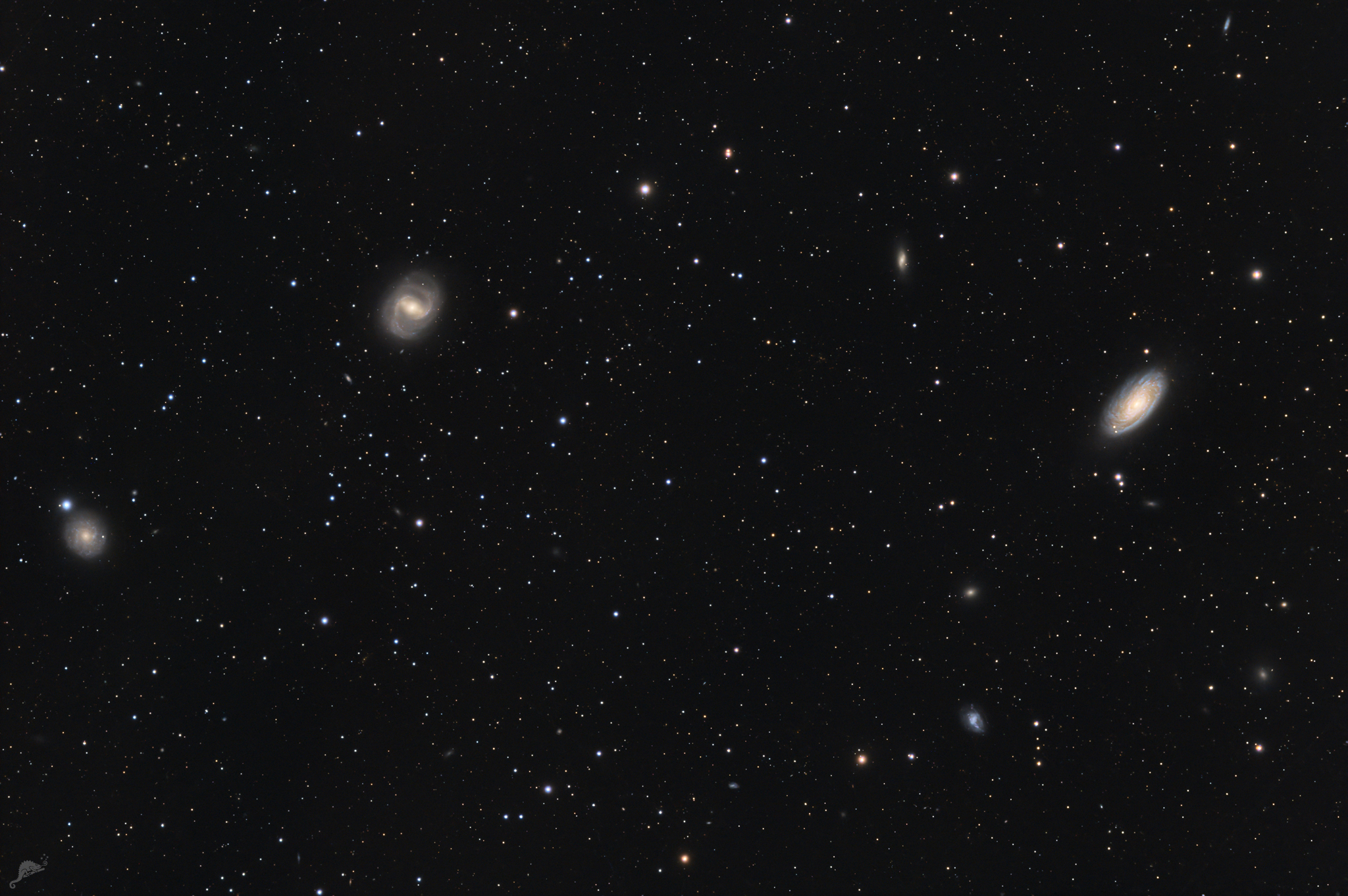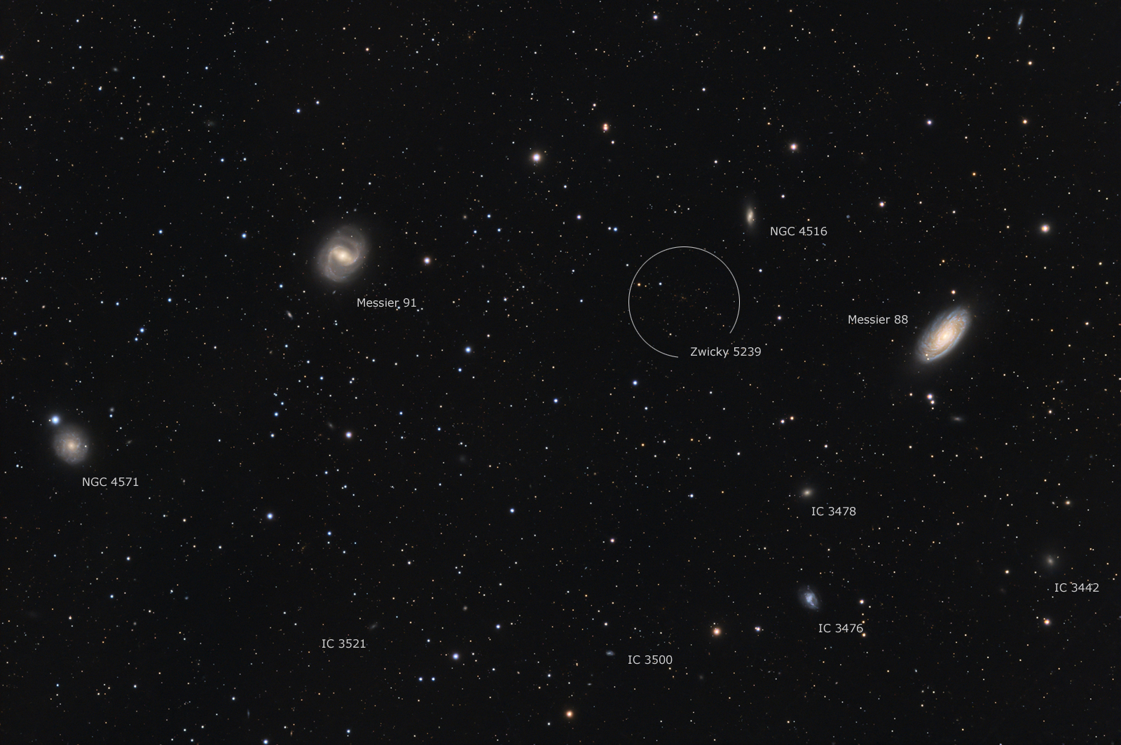 | Objektbeschreibung: Unser Bild zeigt eine Widefieldansicht mit den 3 Galaxien Messier 88, Messier 91 und NGC 4571 im Sternbild Haar der Berenice. Messier 88 ist als aktive Seyfert Galaxie und Messier 91 als klassischen Balkenspirale klassifiziert. NGC 4571 ist eine spiralförmige Zwerggalaxie mit ausgedehnten Sternentstehungsgebieten vom Hubble-Typ Sc. Alle 3 Galaxien sind ein Teil des Virgo Galaxienhaufens und zwischen 50 und 60 Millionen Lichjahre vom Sonnensystem entfernt. Südöstlich der kleinen unscheinbaren Galaxie NGC 4516 befindet sich in vielen hundert Lichtjahren Entfernung der Galaxienhaufen Zwicky 5239. Wir zeigen hoch aufgelöste Bilder von Messier 88 hier, von Messier 91 hier und von NGC 4571 hier. |