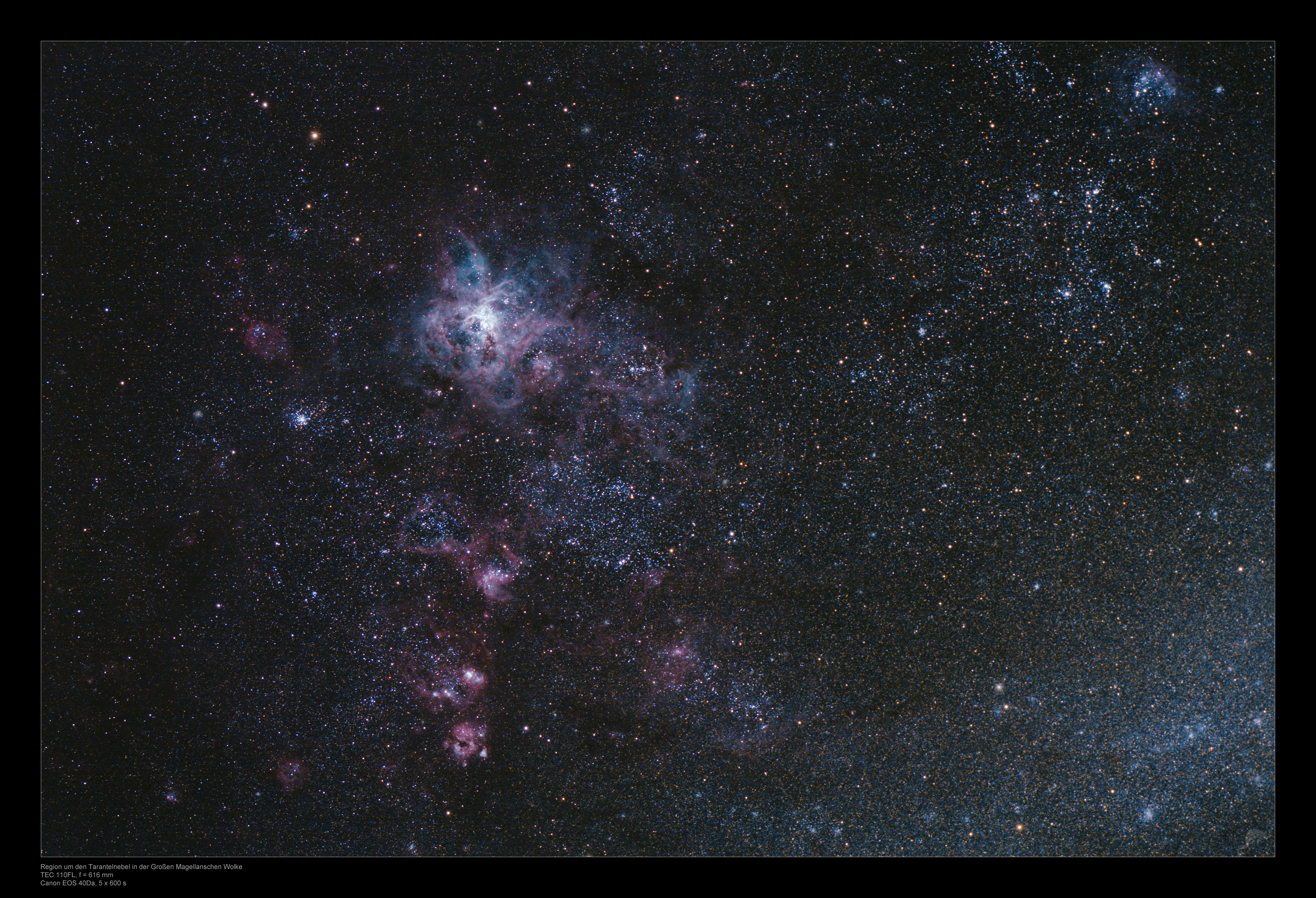 | Objektbeschreibung: ESO 56-115, die Große Magellansche Wolke (GMW) kann bereits mit kürzeren Brennweiten in eine Unmenge von Einzelsternen aufgelöst werden. Die Aufnahme zeigt einen kleinen Teil der Galaxie und enthält neben dem bekannten Tarantelnebel (NGC 2070) viele weiteren Nebelgebiete und Sternhaufen. Eine Detailansicht des innersten Teils des Tarantelnebels wurde mit dem CDK17 am gleichen Abend aufgenommen. Im Kernbereich von NGC 2070 eingebettet liegt ein sehr junger offener Sternhaufen mit der Bezeichnung 30 Doradus oder R 136. Diese Sterne regen den gesamten Nebelkomplex zum Leuchten an. Er beinhaltet einige der jüngsten und massereichsten bekannten Sterne. Der kompakte Sternhaufen Hodge 301, südlich von 30 Doradus, trägt einen Teil zur Ionisation des Nebelkomplex bei. R136 und ist ein Mehrfachsternsystem, bestehend aus einigen der massereichsten Sternen die bekannt sind. Einige der zentralen Sterne des Sternhaufens sind auch Wolf Rayet Sterne. Der Stern mit der Bezeichnung R 136 a1 ist Teil eines ganzen Clusters von jungen, massereichen und extrem heißen Riesensternen und nur ca. 1 Million Jahre alt. Mit 256 Sonnenmassen und einer Größe von 35-fachem Sonnendurchmesser ist er der größte bislang bekannte Einzelstern. Zwei weitere gigantische Sterne mit zusammen 150 Sonnenmassen stehen ebenfalls im Kernbereich von R 136. |