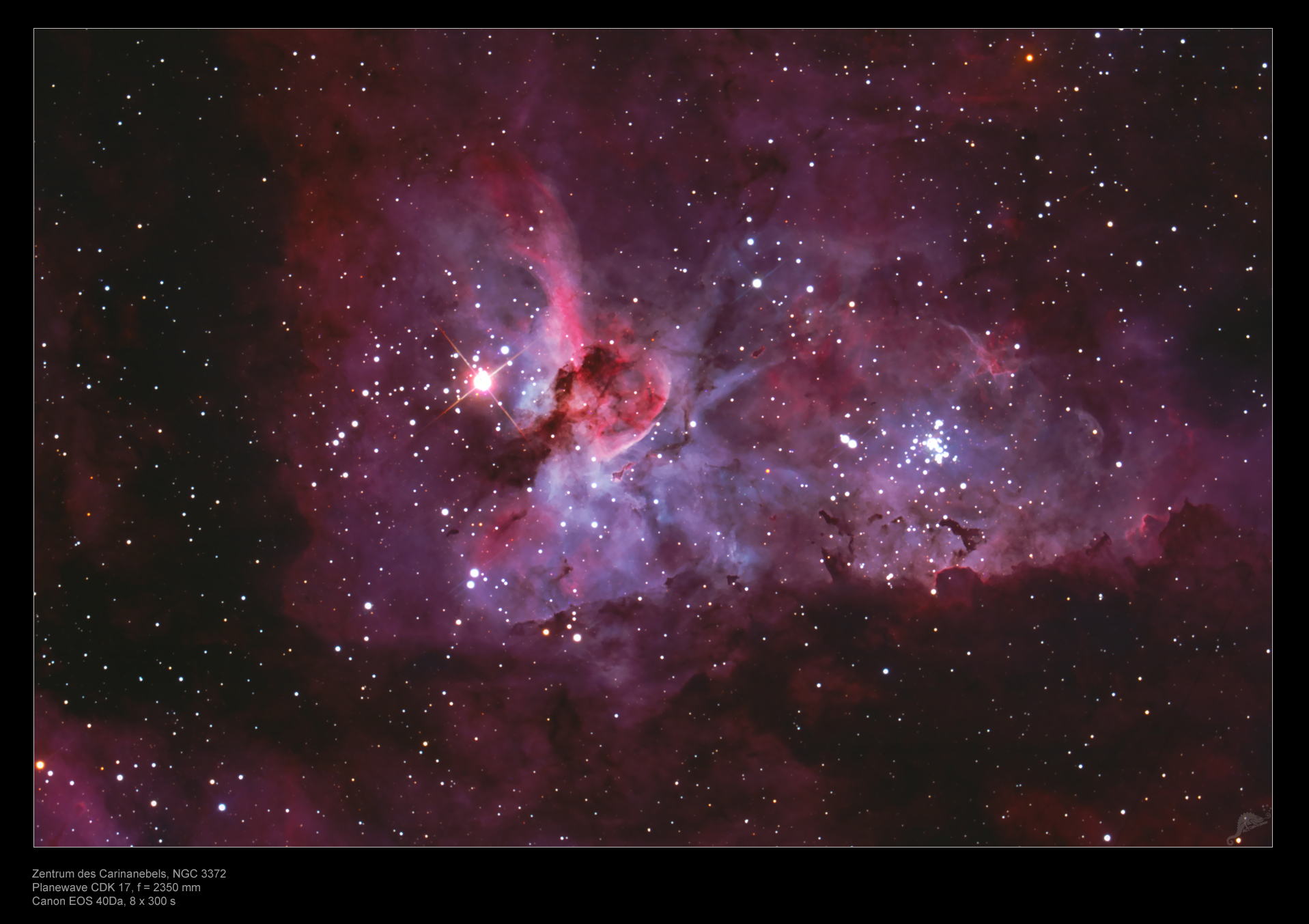 | Objektbeschreibung: Die Aufnahme zeigt den Zentralteil des hellen und großen Carina-Nebels im Sternbild Schiffskiel. Im Vergleich zu unserem großen Weitwinkelmosaik, zeigt sich hier die ganze Pracht der feingliedrigen hellen und dunklen Nebelpartien rund um Eta Carinae (hellster Stern im Bild) und dem Schlüssellochnebel. Visuell ist der Nebelkomplex bereits in später Abenddämmerung sichtbar. Der Carina-Nebel ist ein riesiges Sternentstehungsgebiet, in der sich seit ungefähr zwei Millionen Jahren Sterne bilden. Er enthält genügend "Material" zur Bildung von ca. einer Million Sterne unterschiedlicher Größe. Im 19. Jahrhundert schrieb der Astronom John Herschel während seiner Beobachtungen am Südhimmel: "... Es ist auch nicht einfach, mit Worten einen vollen Eindruck von der Schönheit und Erhabenheit des Schauspiels zu vermitteln ... so wie es durch solch herrliche und endlose Sternprozession eingeleitet wird, für die es eine Art Höhepunkt bildet ..." Eta Carina ist einer der rätselhaftesten und instabilsten Sterne die man kennt und hat eine sehr interessante Geschichte. Man schätzt, dass Eta mit etwa fünf Millionen Sonnenleuchtkräften strahlt. Seine Geschichte beginnt im Jahr 1677, als Edmond Halley eine erste Durchmusterung der Sterne des Südhimmels vornahm. Halley notierte den Stern mit einer Helligkeit der 4. Größenklasse und vermerkte keine weiteren Besonderheiten. Spätere Beobachter des Südhimmels bemerkten jedoch, dass der Stern heller schien, als Halley ihn beschrieben hatte. 1837, während seiner Beobachtungen am Südhimmel, entdeckte John Herschel, dass Eta Carinae immer heller wurde. Sechs Jahre später - im Jahr 1843 - war der Stern fast so hell wie Sirius und somit der zweithellste Stern überhaupt. Da man die Entfernung von Eta Carinae sehr genau kennt, konnte man errechnen, dass der Stern 1843 rund fünfmillionenmal leuchtkräftiger als unsere Sonne war. Anschließend sank die Helligkeit bis heute (1998) auf etwa 8. Größenklasse herab. In den 60er Jahren, als sich die Infrarotastronomie etablierte, bemerkte man, dass Eta Carinae bei einer Wellenlänge von 20 Mikron das hellste Einzelobjekt am Himmel ist. Zusammen mit seiner optischen Strahlung hat der Stern heute eine immer noch millionenfach höhere Leuchtkraft unsere Sonne. Was wir heute direkt beobachten können, ist eigentlich nicht mehr der Stern selbst. Weitere Bilder von uns und weiterführende Informationen zu Eta Carina sind hier zu finden. |