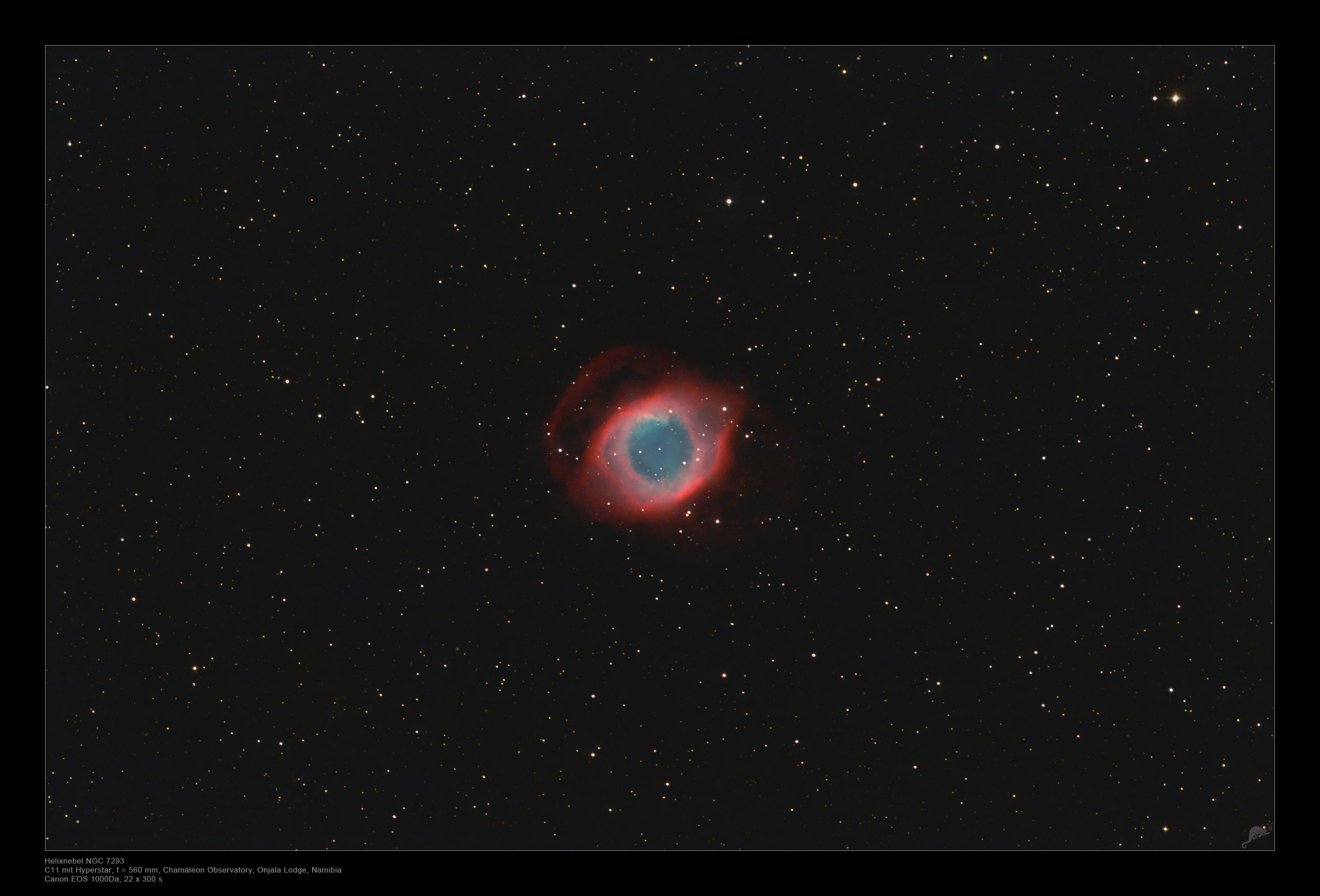 | Objektbeschreibung: Der Helix-Nebel im Sternbild Wassermann ist mit einer Entfernung von knapp 700 Lichtjahren einer der nächsten Planetarischen Nebel. Die Nebelhülle wurde etwa vor 11000 Jahren vom Zentralstern in der Endphase seines Sternlebens ins All abgegeben. Heute kann man die Überreste des Sterns als bläulichen Weißen Zwerg in der Mitte des Nebels erkennen, welcher durch seine sehr hohe UV-Strahlung die Gasmassen zum Leuchten anregt. Der Durchmesser des hellsten Teils des Helix-Nebels beträgt etwa 3.5 Lichtjahre, dies entspricht einem halben Monddurchmesser. Weiterhin gibt es eine äußere, schwächere Hülle, die mit einem Durchmesser von 6 Lichtjahren fast so groß wie der Mond am Himmel erscheint. Teile der äußeren Hülle konnten bereits in diesem Bild, bei einer moderaten Belichtungszeit von nur knapp 2 Stunden, abgebildet werden. Die volle Ausdehnung der äußeren Schale wird am Besten in langbelichteten Aufnahmen im Licht der H-alpha Wasserstofflinie sichtbar. |