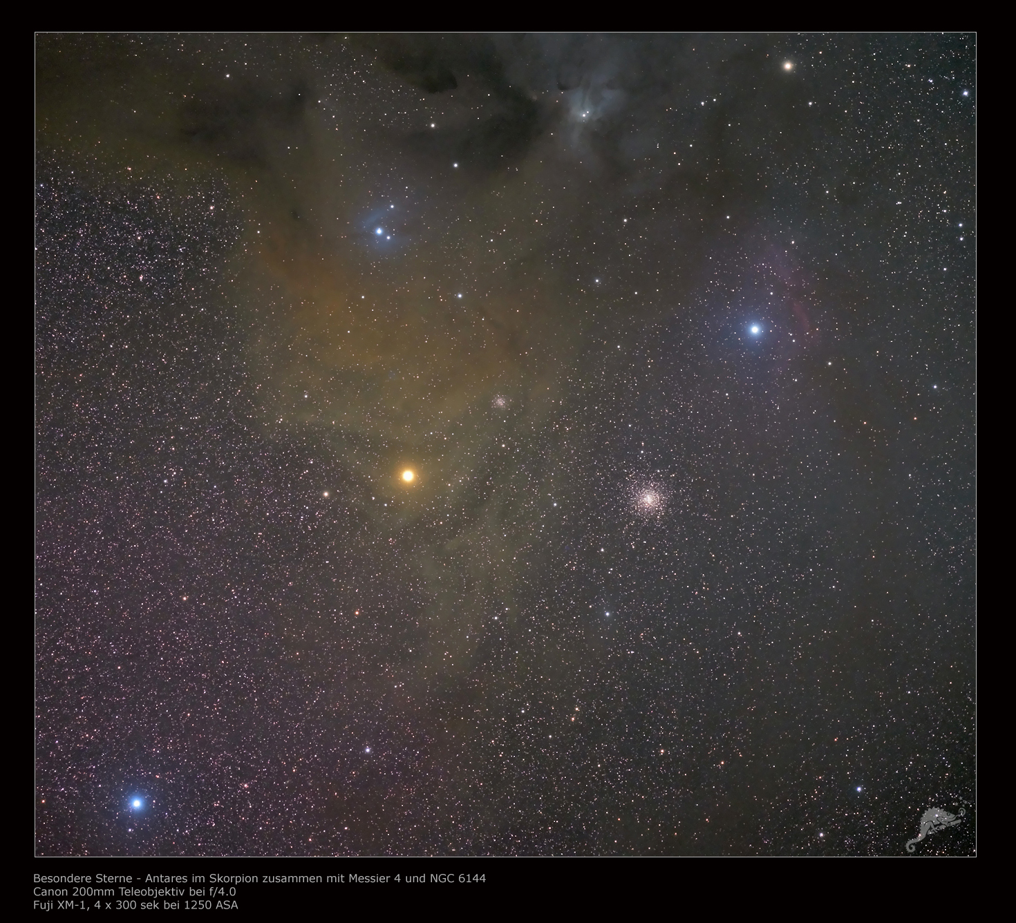 Scorpio Bilddaten 29.09.2019 - 4 x 300 sek., Fuji XM-1 bei 1250 ASA, uncooled Telescope: Canon 200 Teleobjektiv at f/4.0 Location: Chamäleon Observatory, Onjala Lodge, Namibia Image processing: DeepSkyStacker, Photoshop CS2 |