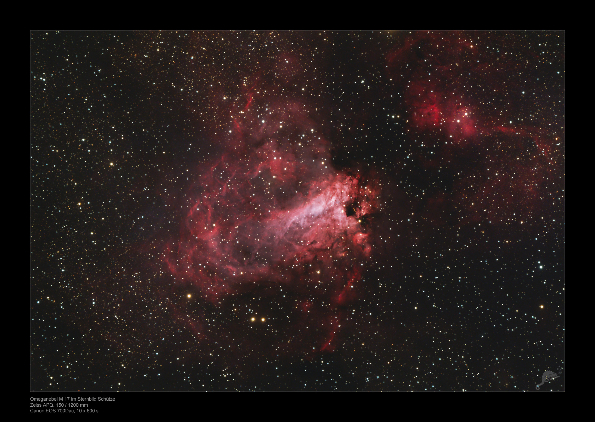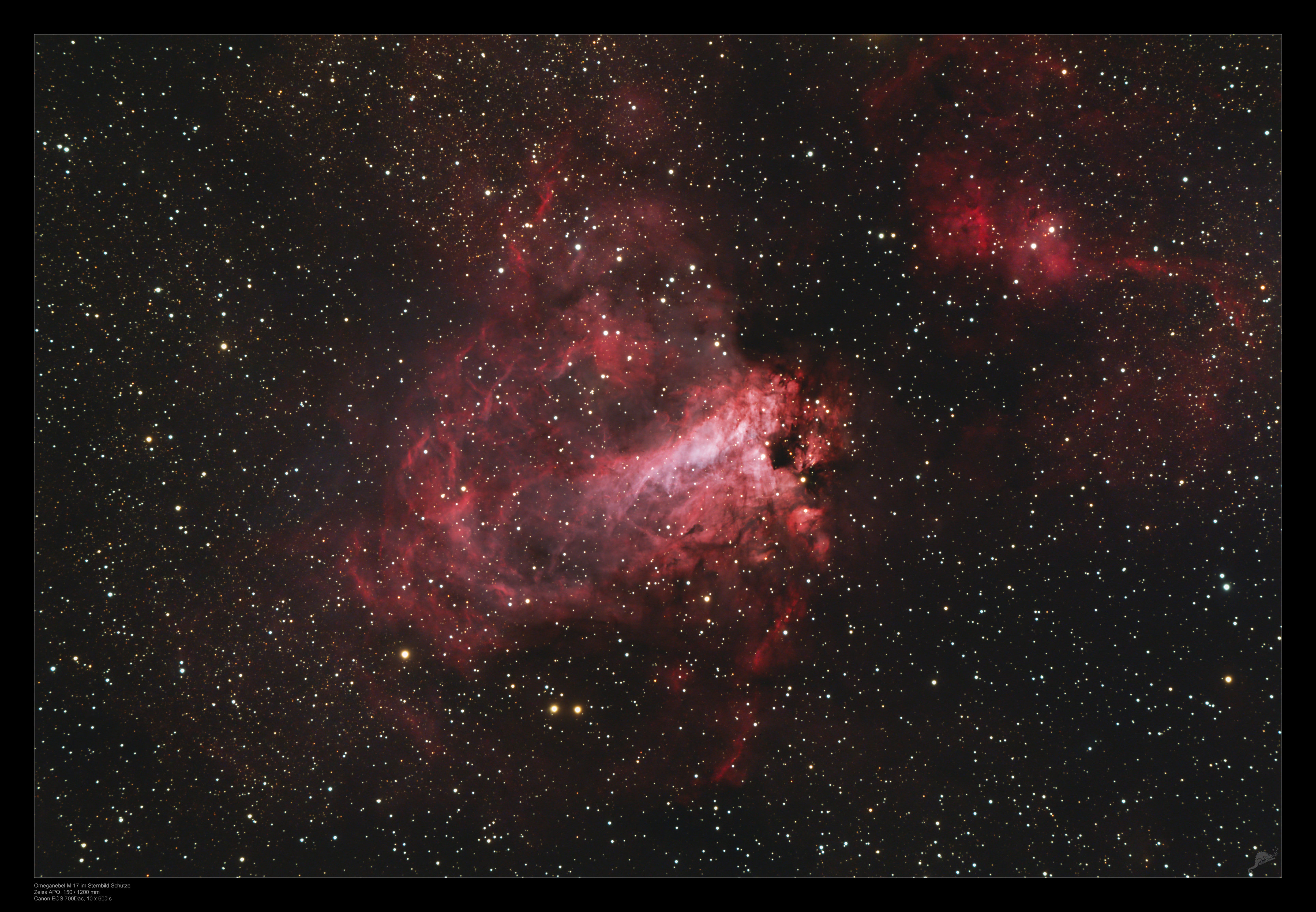 Dunkelwolke am rechten Rand auch als Omega- oder Hufeisennebel bekannt. Wenn