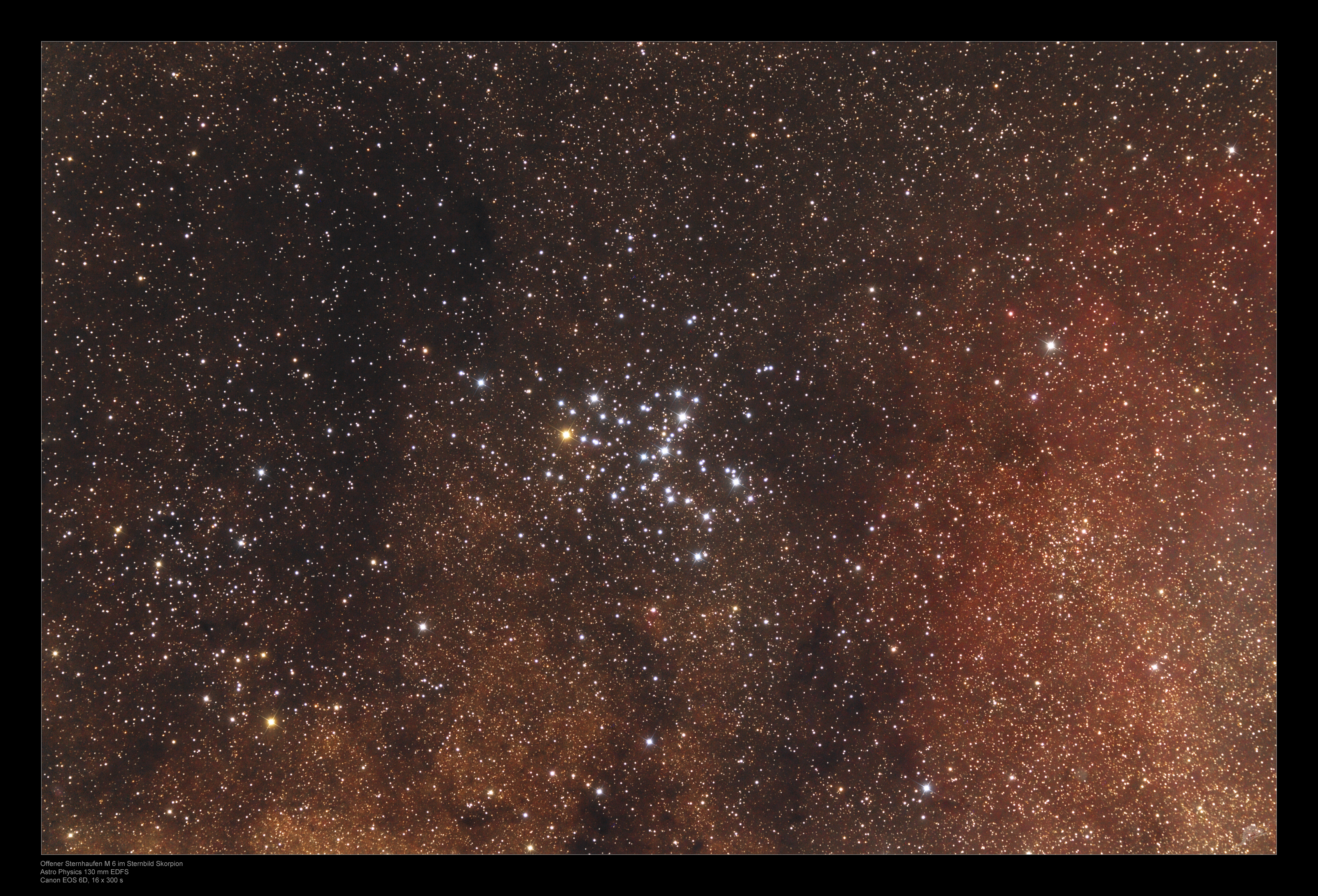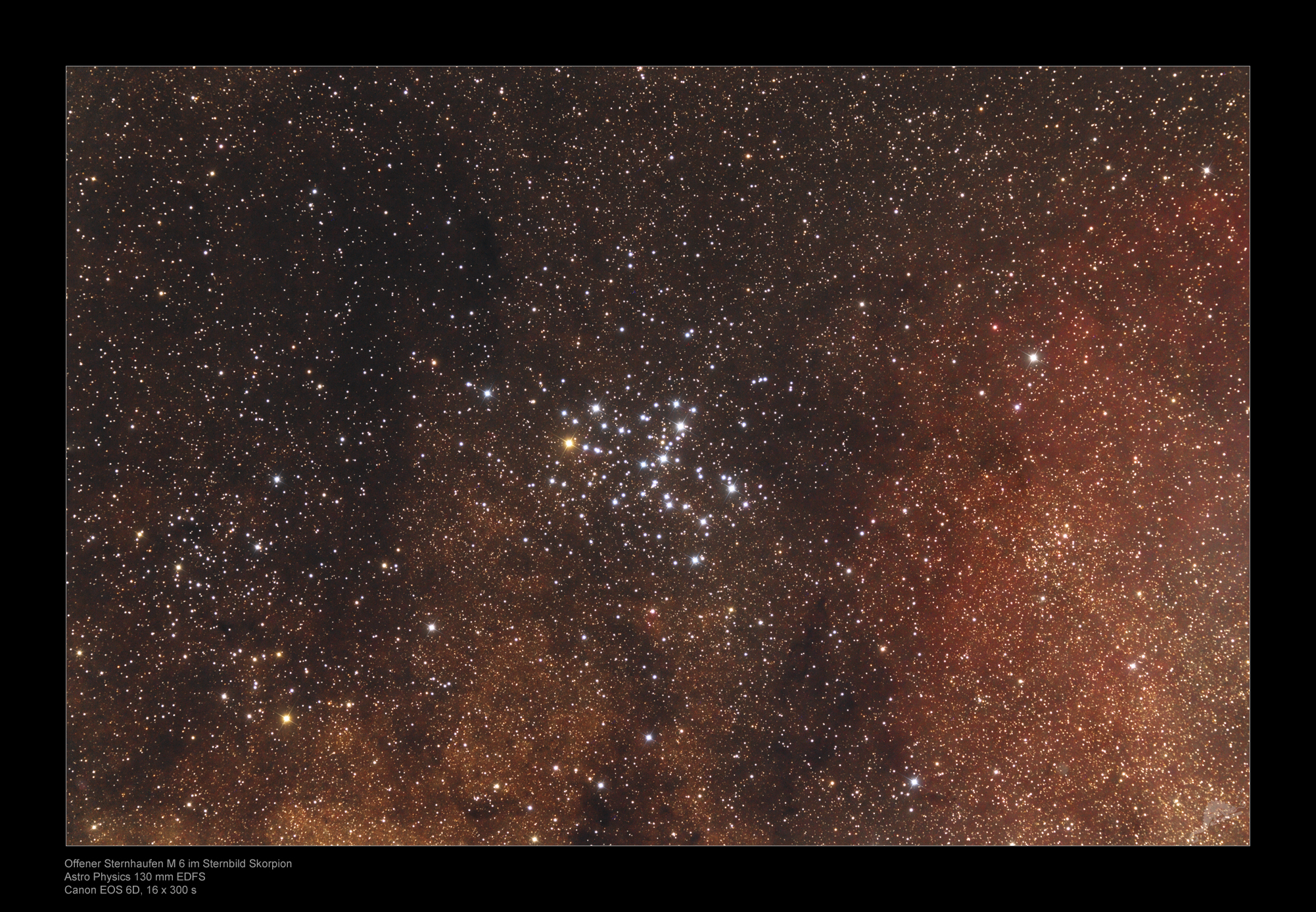 | Objektbeschreibung: Der offene Sternhaufen M 6 befindet im Sternbild Skorpion und ist rund 1600 Lichtjahre von der Erde entfernt. Der Durchmesser des Haufens beträgt 12 Lichtjahre. Am Himmel erscheint uns M 6, mit einem scheinbaren Durchmesser von 25 Bogenminuten, fast so groß wie der Mond. Aufgrund seines visuellen Eindrucks im Teleskop wird er auch als Schmetterlingshaufen bezeichnet. Das Alter von M6 wird auf 95 Millionen Jahre geschätzt. Auffällig ist der Kontrast zwischen den heißen blauen Sternen der Spektralklasse B und dem einzelnen orangenen Stern BM Scorpii mit der Spektralklasse K. BM Scorpii ist ein halbregelmäßig veränderlicher Riesenstern mit Helligkeitsschwankungen zwischen 5.5 mag und 7 mag. Im rechten Bildteil befindet sich die große rötlich leuchtende HII-Region LBN 1117. Auch wenn die Kamera nicht für den Astroeinsatz im roten Spektralbereich modifiziert wurde, konnte dieser schwächere Emissionsnebel abgebildet werden. |