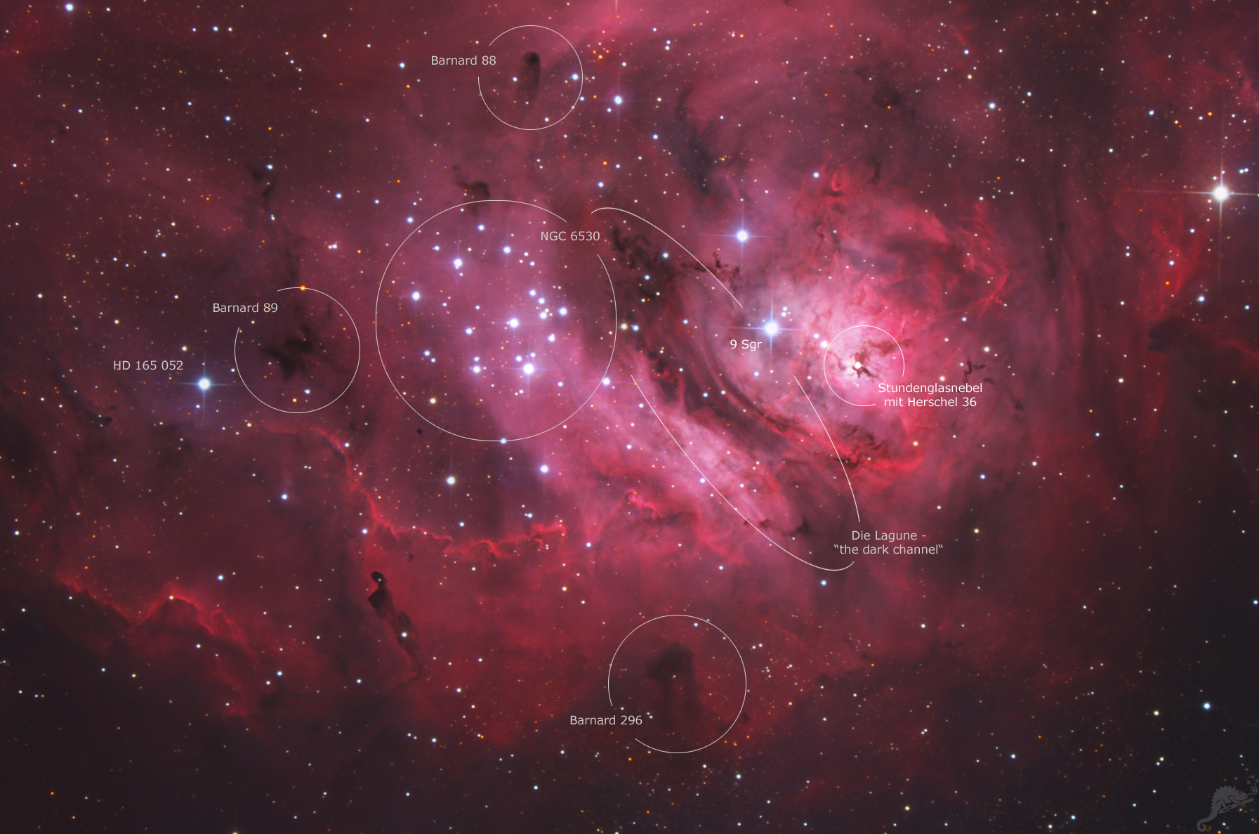 | Objektbeschreibung: Der Lagunennebel ist ein großes Sternentstehungsgebiet, bestehend aus Emissions- und Reflexionsanteilen, zudem enthält die Region mehrere dunkle protostellare Wolken - so genannte Globulen - deren Durchmesser bei etwa 10.000 AE liegen. Messier 8 liegt im Sternbild Schützen, rund 1.5 Grad südlich des Trifidnebels (Messier 20). Die Entfernung zu M 8 beträgt rund 4000 Lichtjahre und der Nebel nimmt etwa die Fläche des Vollmondes am Himmel ein. Physikalisch hat er eine Ausdehnung von etwa 55 x 35 Lichtjahren. Der Emissionsnebel wird durch ein dunkles Staubband grob in eine östliche- und eine westliche Region unterteilt. Im östlichen Teil befindet sich der junge offene Sternhaufen NGC 6530 und im westlichen, helleren Teil liegt der so genannte "Stundenglasnebel" (Katalogbezeichnung G5.97-1.17). Diesem Staubband - dem "dark channel" - verdankt die Nebelregion auch seinen Namen, der aus einer detaillierten Studie von John Herschel stammt, die im Jahr 1847 publiziert wurde. Die Ionisationsenergie, die große Teile des Wasserstoffgases zum Leuchten anregt, stammt hauptsächlich von 3 Sternen: HD 165 052, 9 Sgr und 36 Herschel. Natürlich steuern auch die jungen, heißen Sterne von NGC 6530 ihren Teil zur Ionisation des Lagunennebels bei. HD 165 052 ist ein spektroskopischer Doppelstern der Spektralklassen O 6.5 und O 7.5. Er ionisiert hauptsächlich den östlichen Teil des Lagunennebels. 9 Sagittarius ist ebenfalls ein spektroskopischer Doppelstern der Spektralklassen O 3.5 (Hauptstern) und O 5 (Begleitstern). Herschel 36, Zentralstern des Stundenglasnebels, ist ein 3-fach System. Die beiden Hauptsterne bilden ein spektroskopisches Paar der Spektralklassen O 9 und B 0.5. Der Begleitstern zum engen Paar steht in 3.5" Abstand und hat die Spektralklasse O 7.5. Herschel 36 erscheint mit einer Helligkeit der 10. Größenklasse lichtschwach im Vergleich zu 9 Sgr und HD 165 052, er ist jedoch durch eine hohe Absorption von Nebelmassen stark geschwächt. 9 Sgr und Herschel 36 ionisieren hauptsächlich den westlichen Teil von Messier 8. |