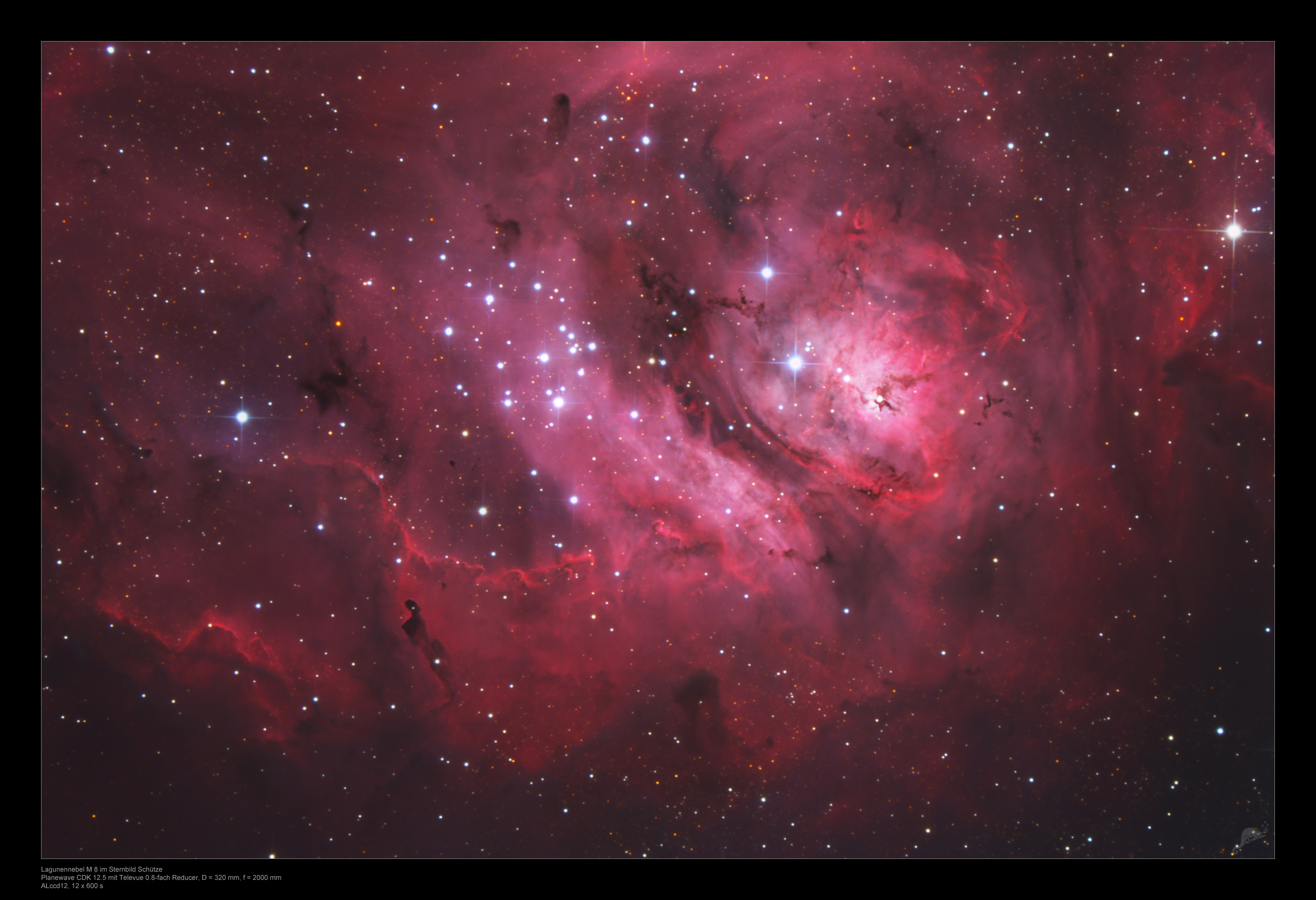 | Messier 8 - the Lagoon Nebula Image data 29.07.201 12 x 600, ALccd12 Telescope: Planewave CDK 12.5 with Televue 0.8-fach Reducer D = 320 mm, f = 2000 mm Location: Chamäleon Observatory, Onjala Lodge, Namibia Image processing: Nebulosity, Photoshop CS5 |