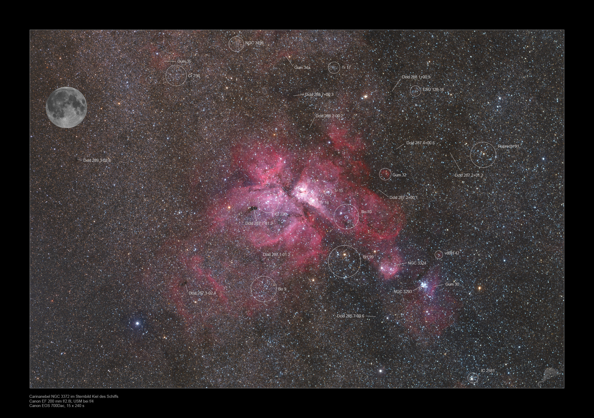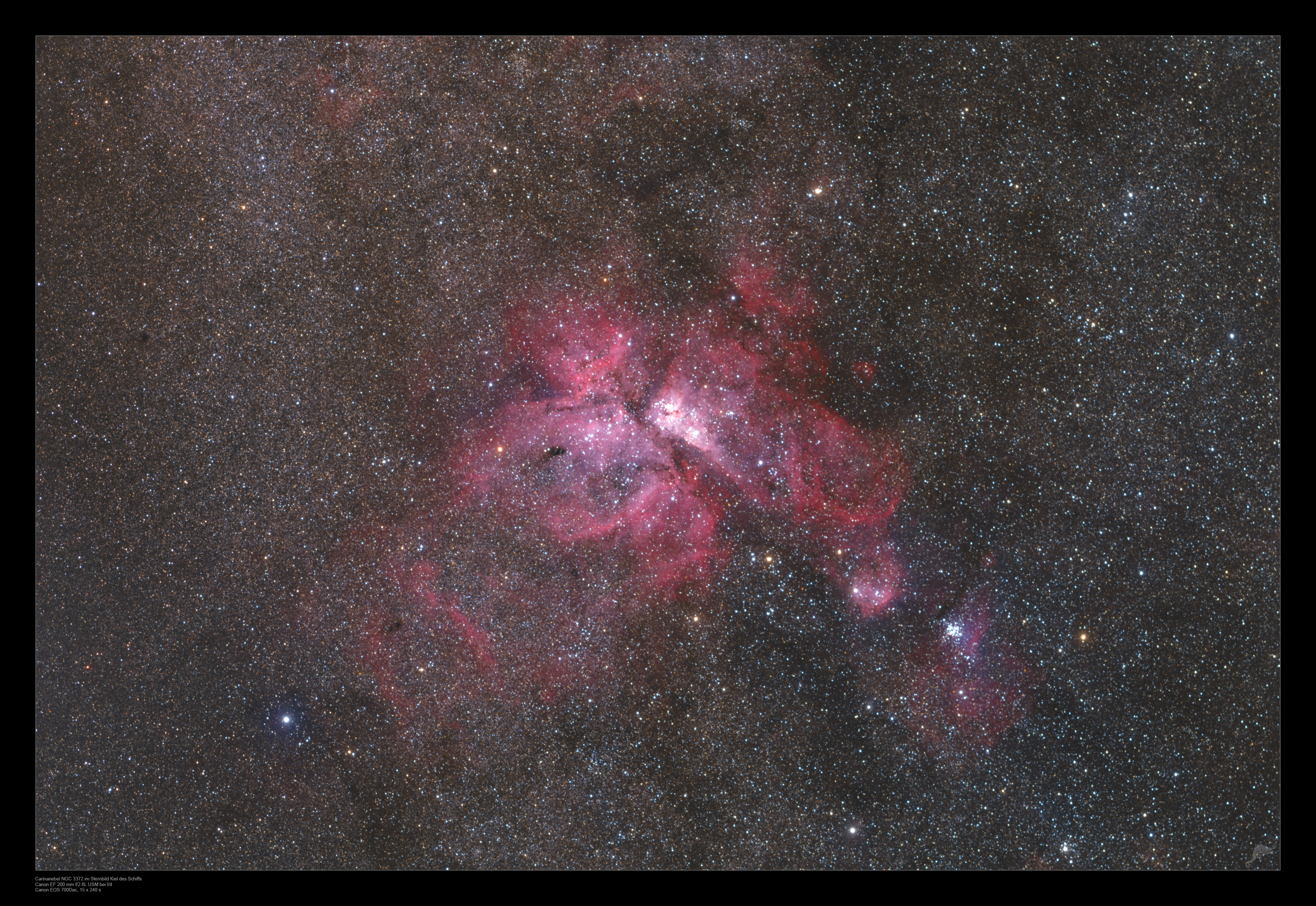 | Kurze Objektbeschreibung: In einer Entfernung zwischen 7500 und 10 000 Lichtjahren vom Sonnensystem entfernt, liegt - im Sternbild Carina (Kiel des Schiffs) - NGC 3372, der Carina Nebelkomplex, eines der größten Sternentstehungsgebiete in unser Galaxie. Der Nebelkomplex liegt im Sagittarius-Arm der Milchstraße. Als eine der größten HII-Regionen in unserer Galaxie stellt der Carinanebel ein riesiges Sternentstehungsgebiet, ähnlich dem Orionnebel, dar. Er enthält diverse offene Sternhaufen, darunter die Haufen Collinder 228, 232 und 234, Trumpler 14 Trumpler 15 und Trumpler 16 sowie Bochum 10 und Bochum 11. Die massereichen Sterne der offenen Sternhaufen im Inneren dieser H-II Region geben intensive Strahlung ab, die das umgebende Gas zum Leuchten anregt. Andere Regionen des Nebels enthalten dagegen dunkle Säulen aus Staub, die neugeborene Sterne verhüllen. Im Carina-Nebel tobt ein Kampf zwischen Sternen und Staub, den die neu gebildeten Sterne gewinnen sie erzeugen hochenergetische Strahlung und Sternwinde, die die staubigen Kinderzimmer der Sterne, in denen sie sich gebildet haben, verdampfen und auflösen. |