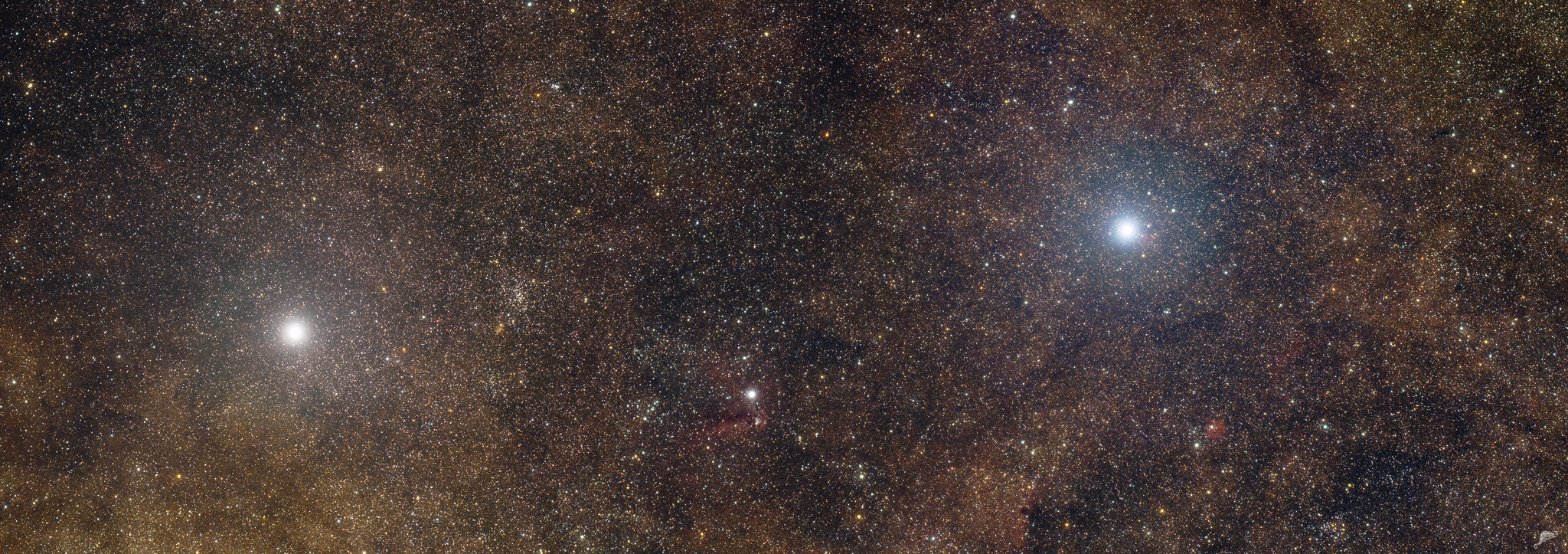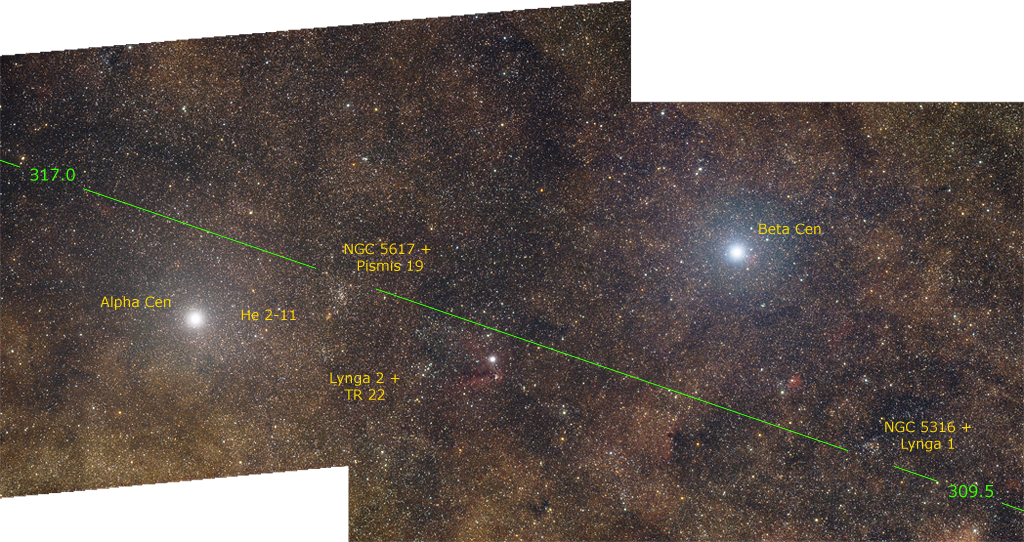 | Bescheibung des Mosaiks: Unser Mosaik zeigt den Bereich des galaktischen Äquators (grüne Linie) zwischen einer Länge von 308 bis 317 Grad (Sternbilder: Zentaurus). Das Mosaik besteht nur aus 2 Segmenten mit einer Gesamtbelichtungszeit von etwa 3 Stunden. Es schließt direkt an das Kreuz des Südens Mosaik an. Zum Laden großer Bilder mit ausführlichen Informationen zum Objekt klicken Sie einfach auf die in gelb markierten Objektnamen im Mosaik. Die in weißer Schrift markierten Objekte dienen nur der Orientierung im Mosaik. Eine Kurzbeschreibung zu den hier gezeigten Objekten finden Sie weiter unten auf der Seite. Mosaik mit 2048 Pixel Breite laden Mosaik 50% Originalgröße laden (4.096 pxl) |
