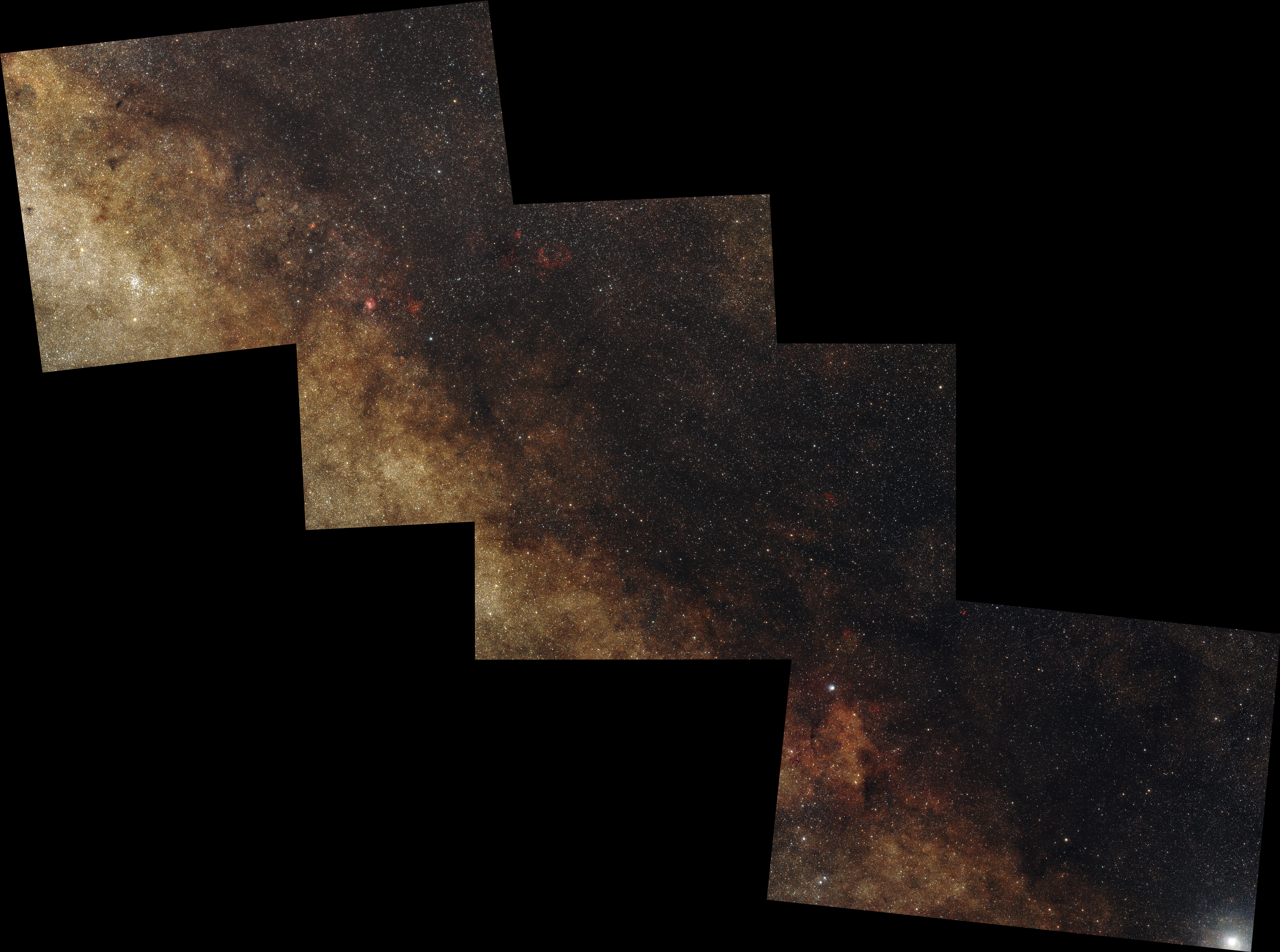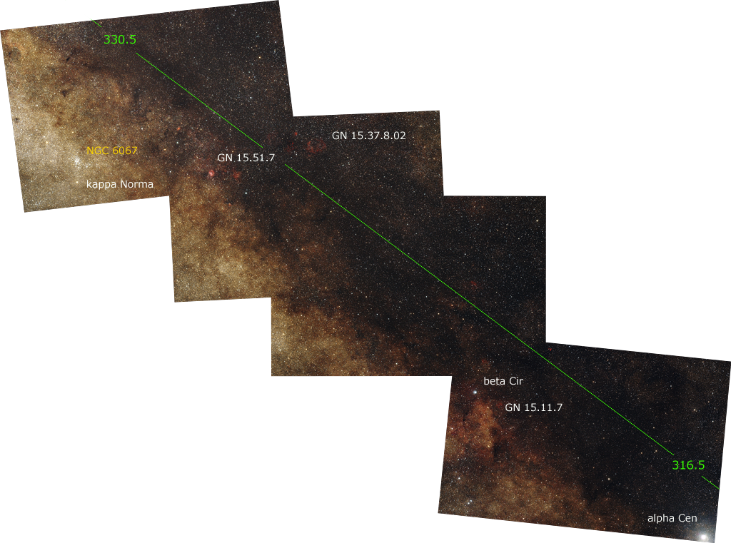 Das Mosaik zeigt eine eher unauffällige Region des galaktischen Äquators, indem wir auch nur ein Objekt in höherer Auflösung zeigen können. In dieser Region zwischen NGC 6067 (Norma) und dem Sternbild Circinus gibt es wenig auffällige Objekte. |