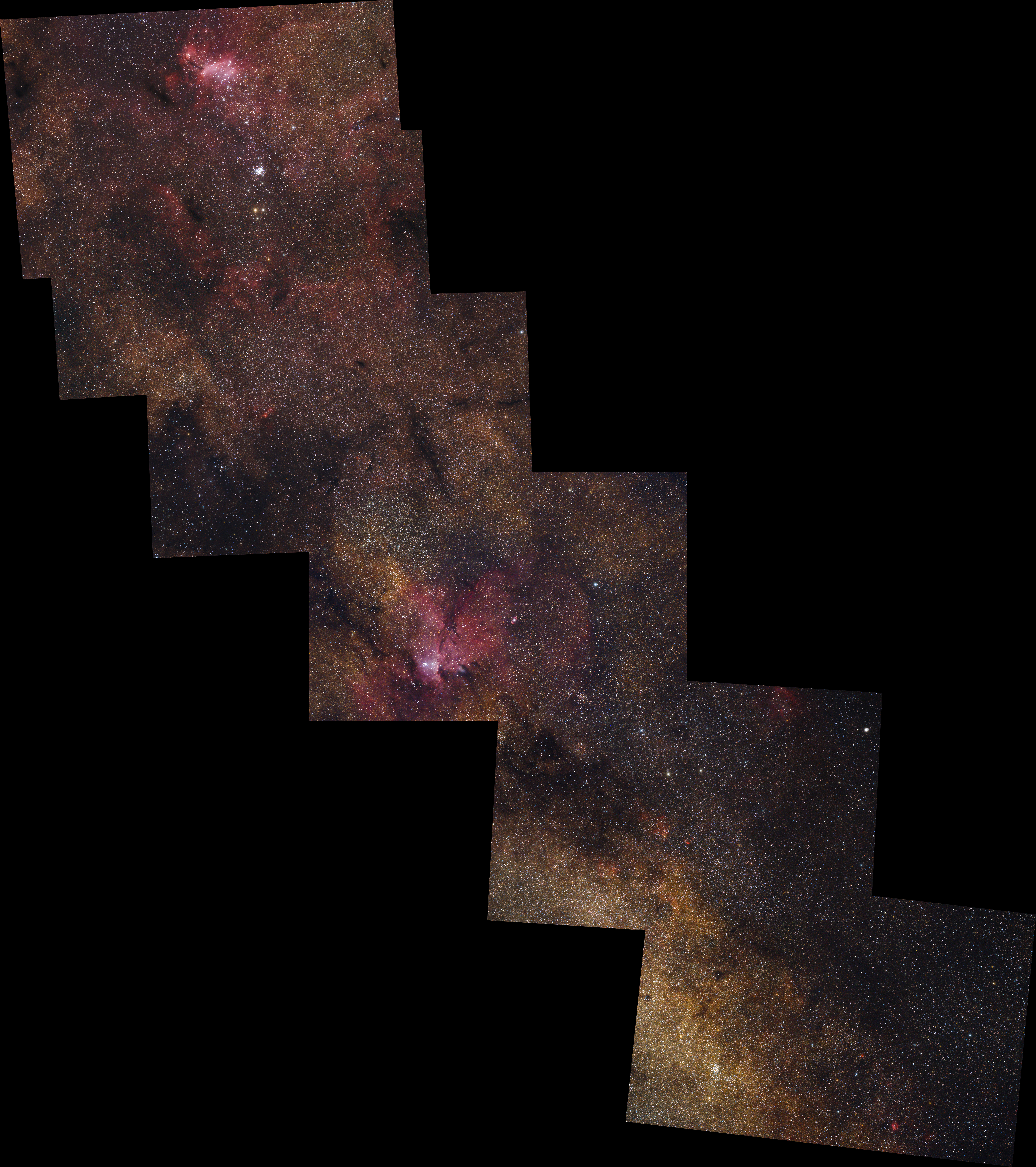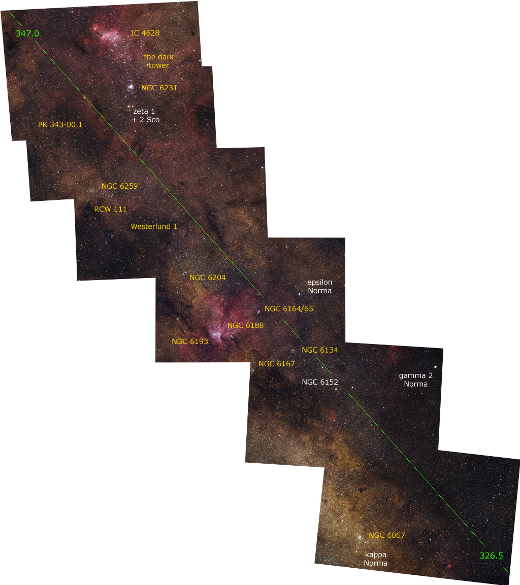 | Bescheibung des Mosaiks: Unser Mosaik zeigt den Bereich des galaktischen Äquators (grüne Linie) zwischen einer Länge von 326.5 bis 347 Grad (Sternbilder: Norma (Winkelmaß) und Skorpion). Das Mosaik besteht 7 Segmenten mit einer Gesamtbelichtungszeit von etwa 8 Stunden. Es schließt direkt an das Mosaik Centaurus, Circinus und Norma an. Zum Laden großer Bilder mit ausführlichen Informationen zum Objekt klicken Sie einfach auf die in gelb markierten Objektnamen im Mosaik. Die in weißer Schrift markierten Objekte dienen nur der Orientierung im Mosaik. Eine Kurzbeschreibung zu den hier gezeigten Objekten finden Sie weiter unten auf der Seite. Mosaik mit 2048 Pixel Breite laden Mosaik 50% Originalgröße laden |
