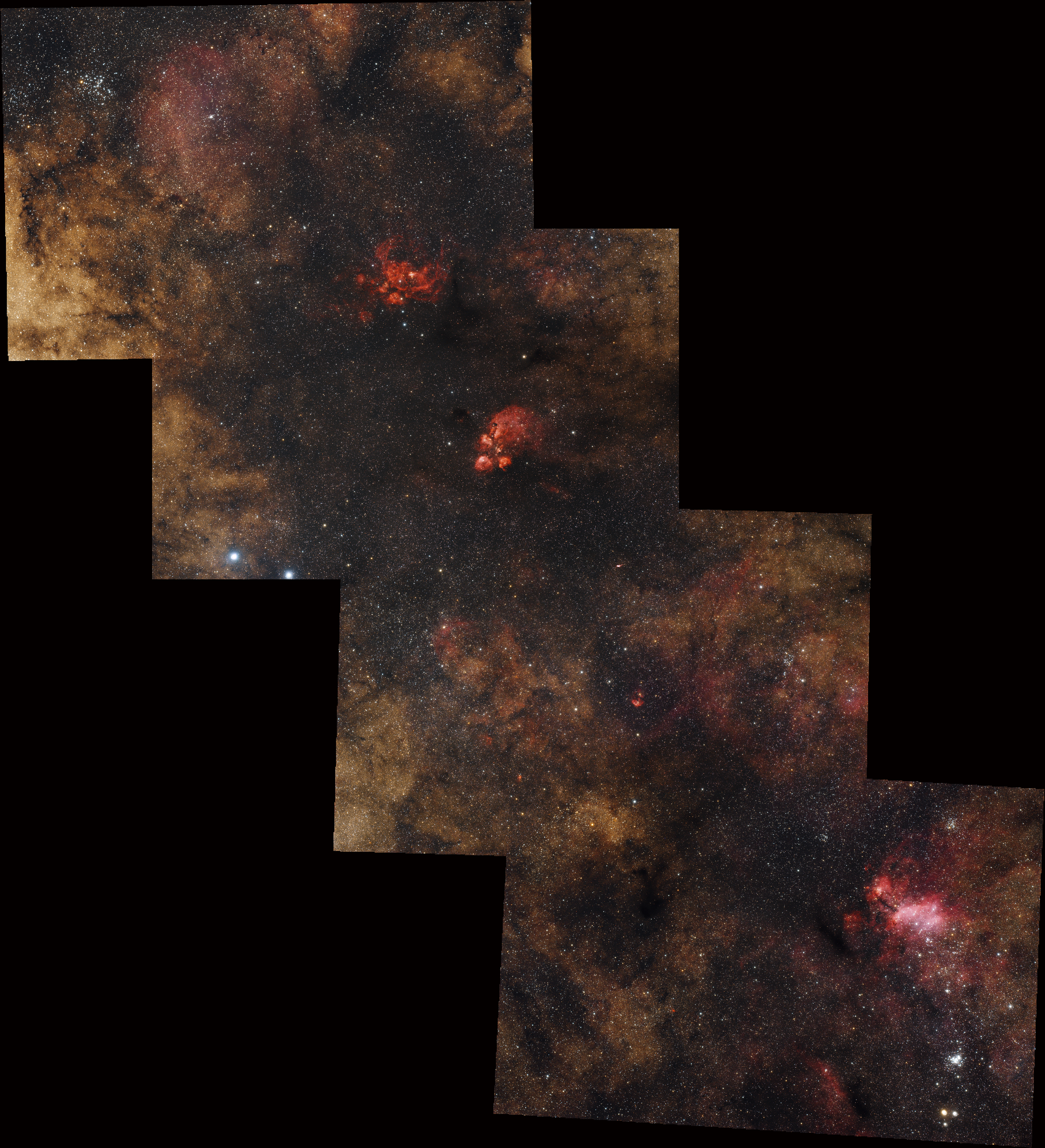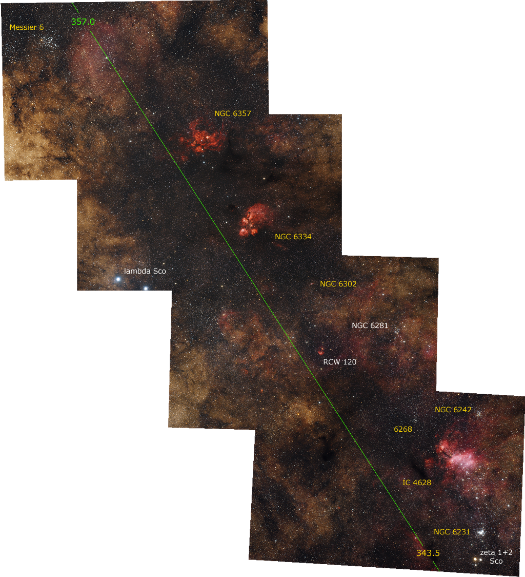 | Bescheibung des Mosaiks: Unser Mosaik zeigt den Bereich des galaktischen Äquators (grüne Linie) zwischen einer Länge von 343.5 bis 357 Grad (Sternbild: Skorpion). Das Mosaik besteht 4 Segmenten mit einer Gesamtbelichtungszeit von etwa 6 Stunden. Es schließt direkt an das Mosaik Norma und Skorpion an. Zum Laden großer Bilder mit ausführlichen Informationen zum Objekt klicken Sie einfach auf die in gelb markierten Objektnamen im Mosaik. Die in weißer Schrift markierten Objekte dienen nur der Orientierung im Mosaik. Eine Kurzbeschreibung zu den hier gezeigten Objekten finden Sie weiter unten auf der Seite. Mosaik mit 2048 Pixel Breite laden Mosaik 50% Originalgröße laden |