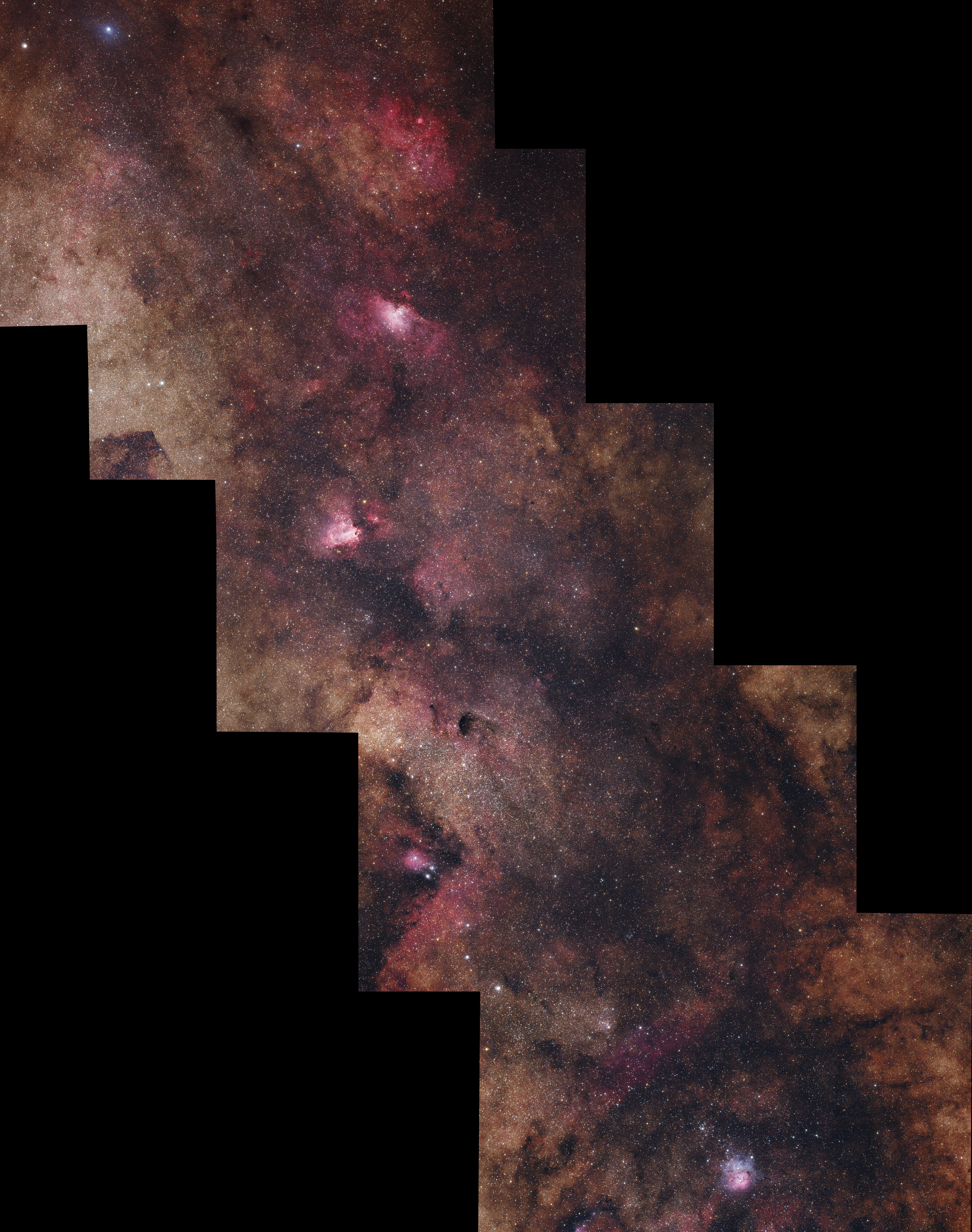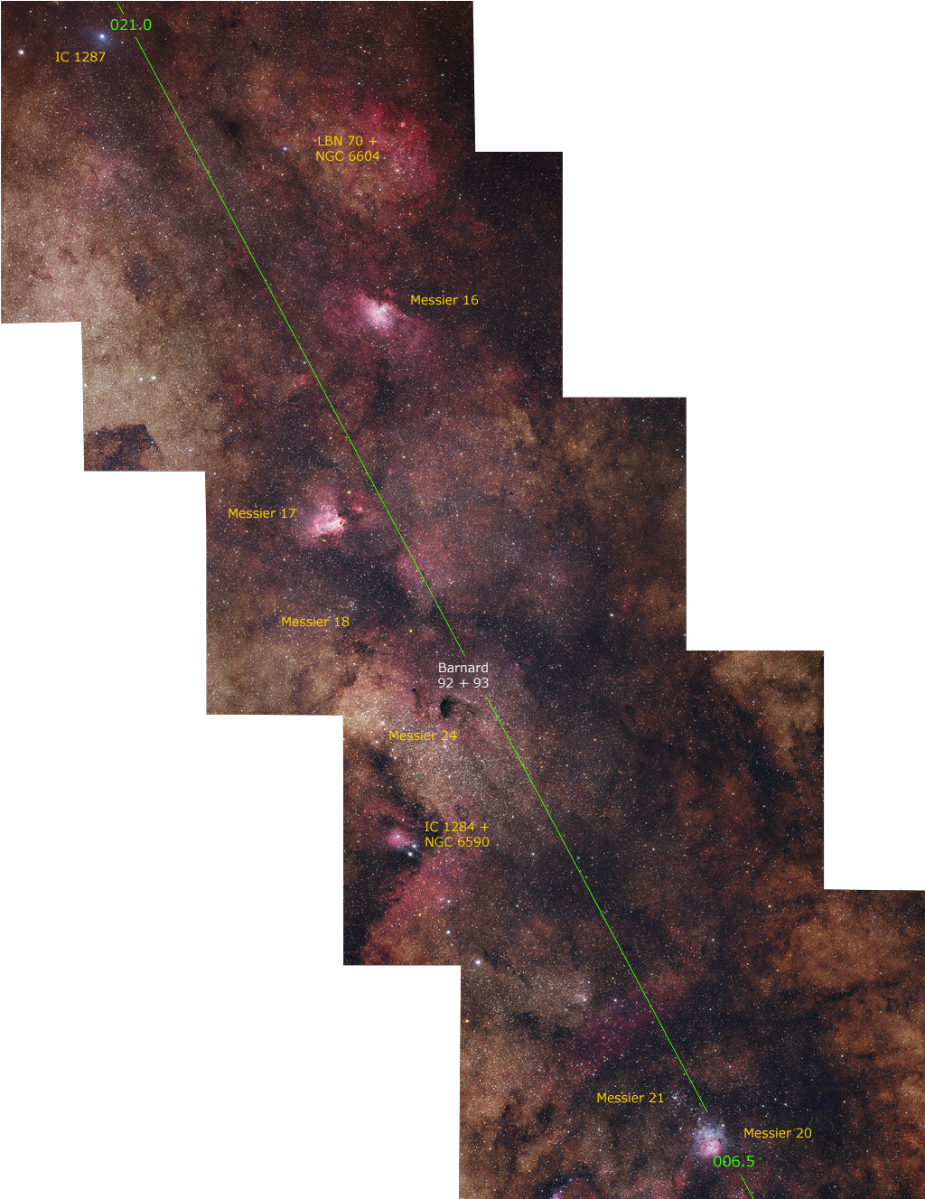 | Bescheibung des Mosaiks: Unser Mosaik zeigt den Bereich des galaktischen Äquators (grüne Linie) zwischen einer Länge von 006.5 bis 021.0 Grad (Sternbilder: Schütze (Sagittarius), Scutum (Schild) und Serpens (Schlange)). Das Mosaik besteht 5 Segmenten mit einer Gesamtbelichtungszeit von etwa 7 Stunden. Es schließt direkt an das Mosaik des galaktischen Zentrums an. Zum Laden großer Bilder mit ausführlichen Informationen zum Objekt klicken Sie einfach auf die in gelb markierten Objektnamen im Mosaik. Die in weißer Schrift markierten Objekte dienen nur der Orientierung im Mosaik. Eine Kurzbeschreibung zu den hier gezeigten Objekten finden Sie weiter unten auf der Seite. Mosaik mit 2048 Pixel Breite laden Mosaik 50% Originalgröße laden |