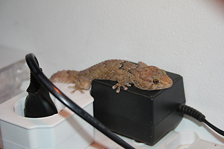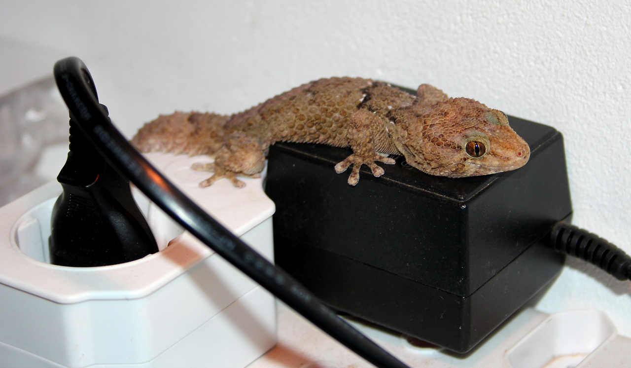 Unser Kuppelgecko wärmt sich in kalter Nacht auf einem Steckernetzteil ... |