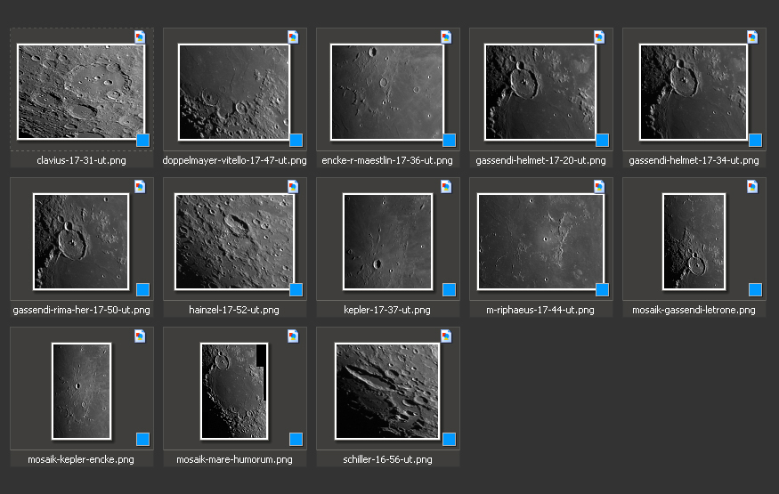 | Seitenanfang Die folgenden Aufnahmen stammen vom 16. August 2013. Die Aufnahmezeit ist in UT gegeben und wird aus den Filenamen ersichtlich. Das Mondalter betrug knapp 9,8 Tage und die Mondphase 75,2% beleuchtet. |