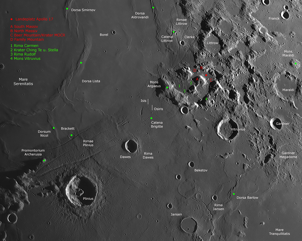 Meter D: Family Mountain = 3.400 Meter, der Krater Ching Te (grün 2) hat 3.700 Meter Durchmesser. Westlich von Ching Te liegt der Kleinstkrater Stella mit nur 400 Meter Durchmesser (helle Struktur direkt links neben der 2). Es ist ein sehr junger Krater mit einem kleinen, aber extrem hellen Strahlensystem, welches sich im Bild als heller Fleck zeigt. Die kleinsten - deutlich sichtbaren - Strukturen, die im Bild sichtbar sind, sind die beiden so genannten lunare Cones Osisris und Isis. Osiris = 950 Meter und Isis = 600 Meter Bilddaten: Aufnahme am 2. April 2017 - 16:51 UT Mondalter: 5.6 Tage, Beleuchtung: 38%, Cologitude: 341.5 Grad Celestron C14 fokal (f = 3.900mm) mit Baader IrPassfilter Celestron SkyRis Videomodul 445 Mono 2.000 Einzelbilder, davon 10% aufadiert mit AviStack Bildbearbeitung: Photoshop CS 2 Bildorientierung: Norden oben, Osten rechts Hier klicken zum Laden einer größeren Darstellung des Bildes |