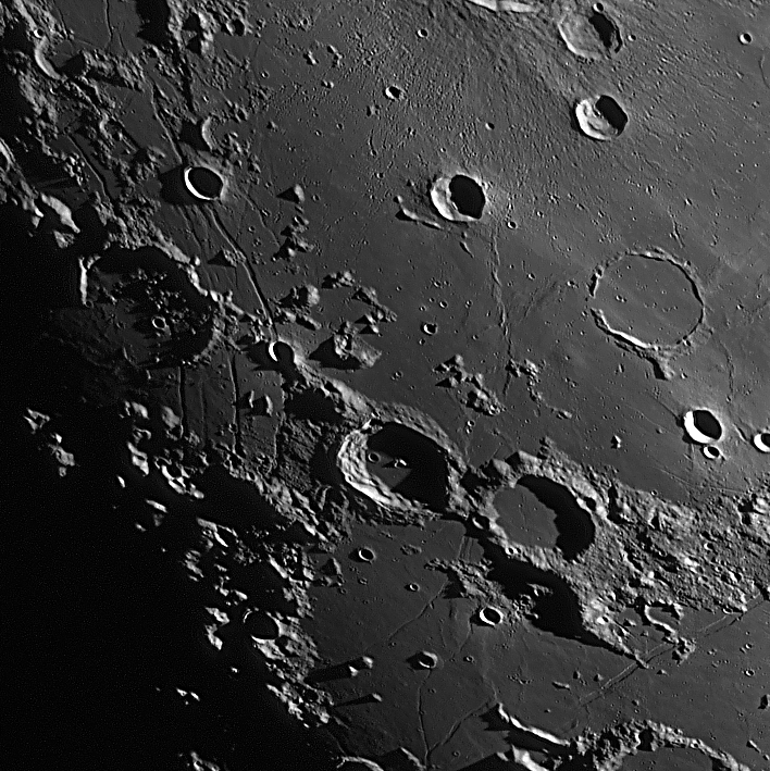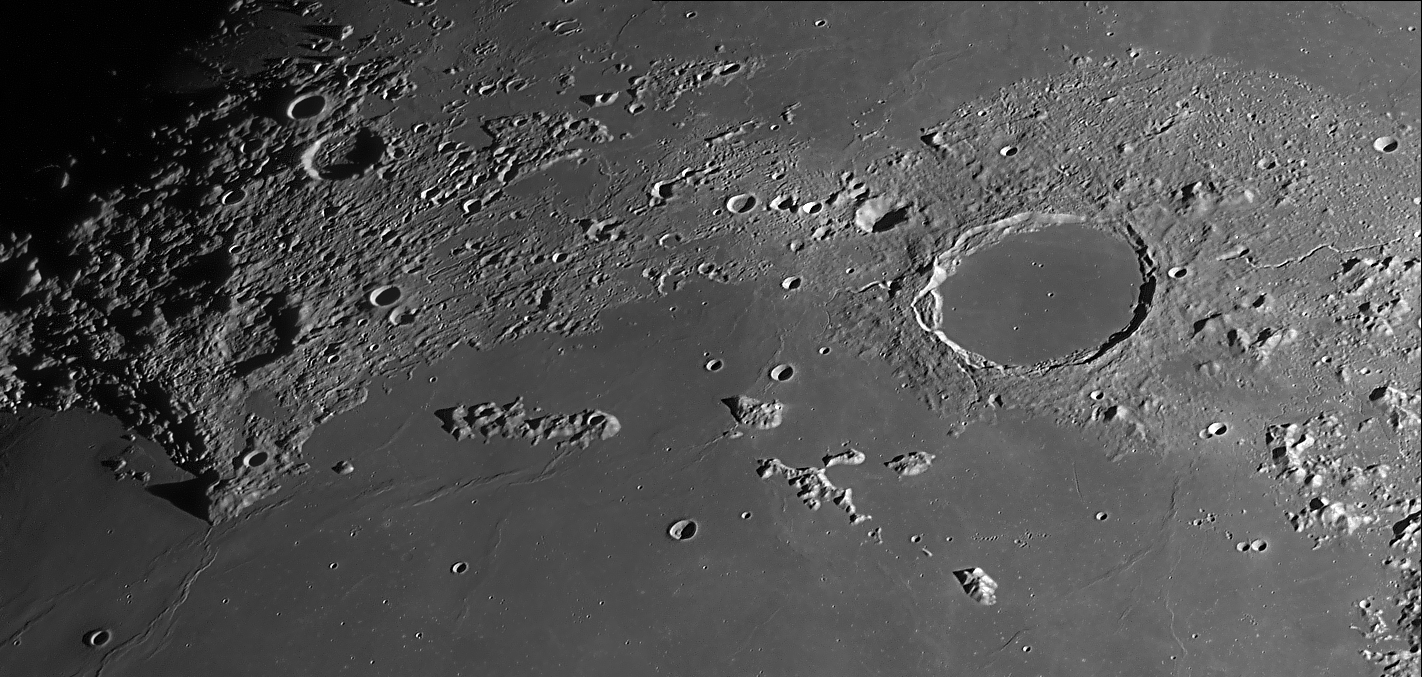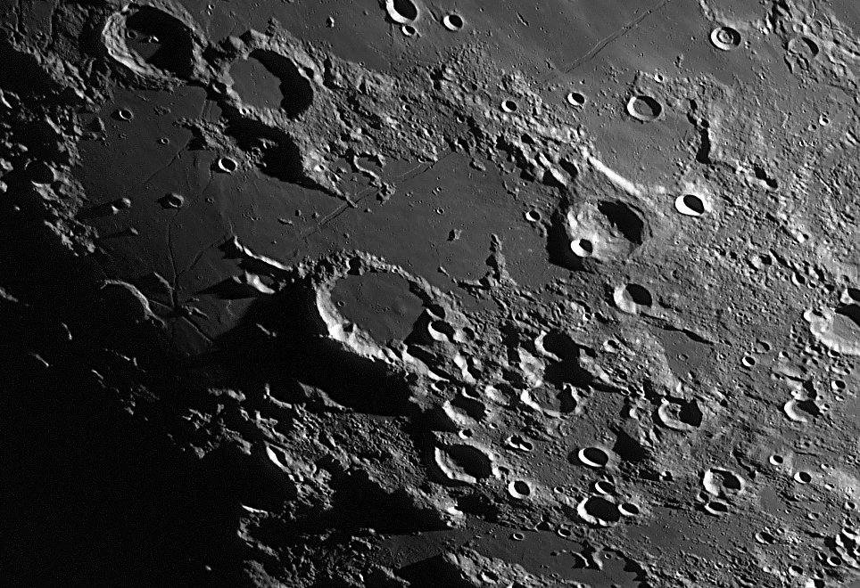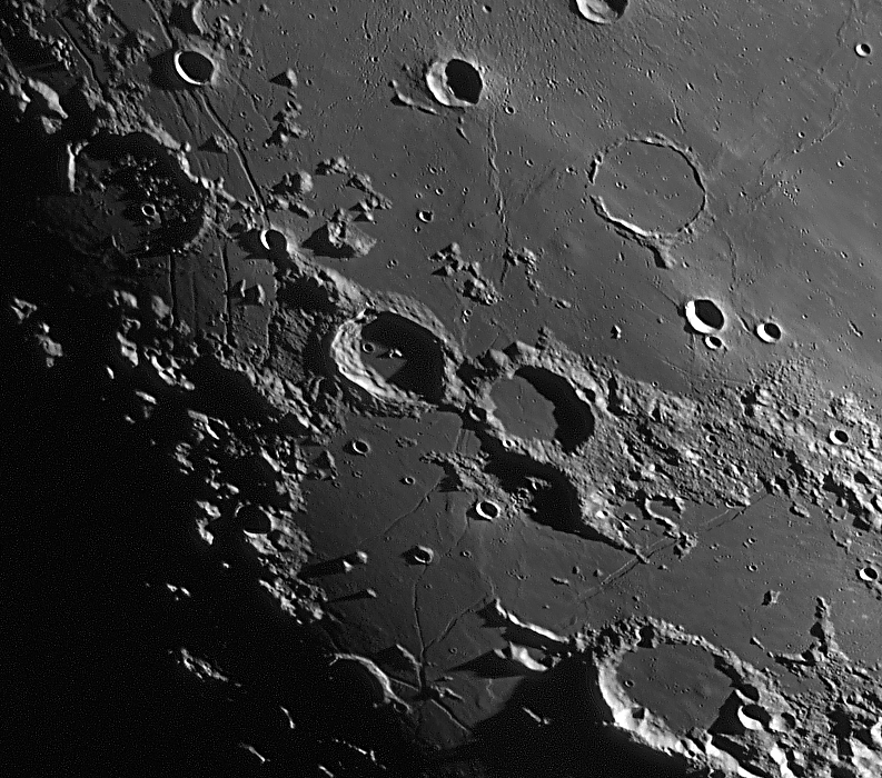 Lange Wand bis Agatharchides Mare Serenitatis, Posidonius Clavius, Moretus Clavius, Tycho Deslandres, Stöffler Mercator, Campanus Palus Epidimarium Bullialdus, Pitatus Kopernikus, Stadius, Erastosthenes Hortensius, Kopernikus, Erastosthenes, Stadius Plato, Montes Recti, Montes Teneriffe Cassini, Alpne, Alpental Fra Mauro, Mare Nubium Wilhelm, Longomontanus Clavius, Moretus Bullialdus Kopernikus, Karparten