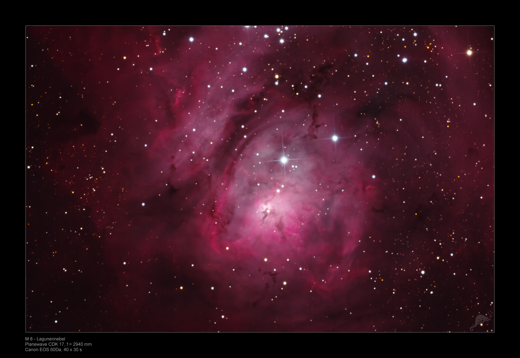 | Objektbeschreibung: Eine der ersten Testaufnahmen mit dem neuen Teleskop auf der Rooisand Desert Ranch in Namibia. Für die relativ kurze Einzel- und auch Gesamtbelichtungszeit, ist das Ergebnis sehr ordentlich. M 8 (der Lagunennebel) gehört zu den hellsten Emissionsnebeln am Himmel und kann bereits ohne optische Hilfsmittel inmitten einer Dunkelwolke der Milchstraße gesehen werden, der Anblick bei schwacher Vergrößerung im 17" CDK PlaneWave ist wahrlich atemberaubend. Das riesige Sternentstehungsgebiet befindet sich etwas mehr als 5000 Lichtjahre entfernt im Sternbild Schütze. Der kleine, helle Zentralteil wird wegen seiner Form auch Stundenglasnebel genannt. Das Bildfeld überdeckt etwa einen halben Monddurchmesser. Der Lagunennebel verdankt seinen Namen einem dunklen Staubband, welches den Nebel in zwei Teile trennt. Der Lagunennebel ist der Prototyp eines Emissionsnebels und ähnelt in seiner Physik und Struktur dem großen Orionnebel, der aus unseren Breiten im Winter schon mit dem bloßen Auge zu sehen ist. Allerdings findet man im Lagunennebel auch die anderen Typen galaktischer Nebel; absorbierende Dunkelwolken, Bok-Globulen und Reflexionsnebel. Der Lagunennebel ist auch heute noch ein aktives Sternentstehungsgebiet. In einem Teil des Nebels liegt der offene Sternhaufen NGC 6530, dessen Alter auf "erst" 2 Millionen Jahre geschätzt wird. Die sehr heißen Sterne des Haufens erzeugten einst einen Großteil der energiereichen UV-Strahlung, die das Wasserstoffgas des Lagunennebels zum Leuchten anregen. In heutiger Zeit sind diese Sterne abgelöst worden von dem Stern 9 Sagittarii. Es ist der hellste Stern im Gesichtsfeld des Teleskops. Sein langweiliger Katalogname wird der Tatsache nicht gerecht, daß er zu dem halben Dutzend leuchtkräftigster Sterne gehört, die wir in unserer Galaxis kennen. Der Stern strahlt mehr Energie ins All als eine Million sonnenähnlicher Sterne. Seine Gesamtmasse beträgt mehr als das 100fache unserer Sonne und die Oberflächentemperatur ist mit 60.000 Kelvin 10mal höher als die unserer Sonne. Obwohl der Stern etwa 6.000 Lichtjahre entfernt ist, kann man ihn leicht mit dem bloßen Auge beobachten. Unsere Sonne - in diese Entfernung zur Erde gestellt - könnten wir nur mit den sehr großen Teleskopen sichtbar machen. 9 Sagittarii hat in unserer Zeit die Rolle aller Sterne des Sternhaufens übernommen. Seine Energie reicht aus, um große Teile des Lagunennebels zu ionisieren. Auf der anderen Seite des Nebels - dem Sternhaufen gegenüberliegend - findet sich an der hellsten Stelle ein weiteres Superlativ der Astronomie. Dort verbirgt sich - zusammen mit einem kleinen Nebel - einer der jüngsten Sterne, die die Astronomen kennen, der Stern Herschel 36. Dieser Stern ist höchstens 10.000 Jahre alt und noch teilweise von der Gaswolke verborgen, aus der er entstanden ist. Der Nebel selbst hat eine charakteristische Form, die Astronomen nennen ihn den Sanduhrnebel. Langbelichtete Aufnahmen zeigen, daß der Lagunennebel sehr weit ausgedehnt ist. NGC 6559, sowie IC 1274, IC 1275 und IC 4685 gehören ebenfalls zum Komplex (Emissions-, Reflexions- und Dunkelnebel. Diese Region wird auch "die Faust" genannt). |