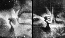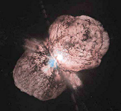 | "Herschels Schlüssellochnebel" Direkt neben Eta Carinae steht "Herschels Schlüssellochnebel" . Sein optischer Anblick ist mit den Helligkeitsvariationen von Eta Carinae eng verknüpft. Das Schlüsselloch besteht teilweise aus Dunkelwolken, die den Blick auf dahinterliegende Regionen verdecken. Die dunkle halbkreisförmige obere Struktur scheint eher eine Aushöhlung in der Dunkelwolke zu sein. Diese Aushöhlung scheint sich auszudehnen und hat einen eigenen Namen, der Eta Carinae-II-Ring. Herschel sah 1843 noch helle Nebelpartien im südlichen Teil des Nebels, welche heute vollständig verschwunden sind. Heute interpretiert man sie als Reflexionsnebel, die damals noch durch Eta Carina direkt beleuchtet wurden. |