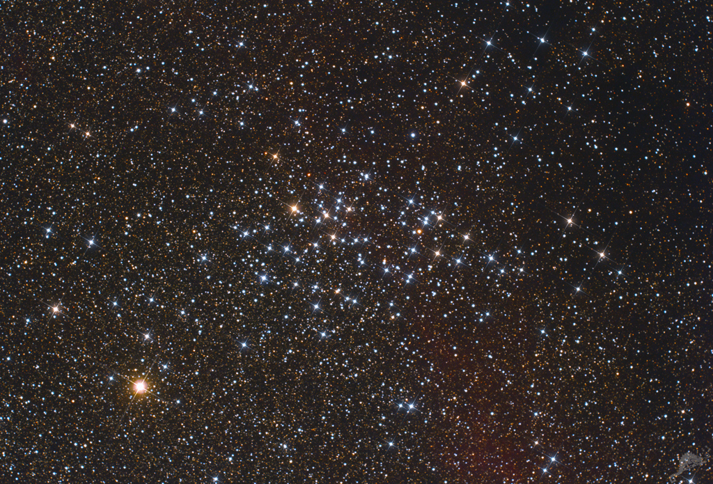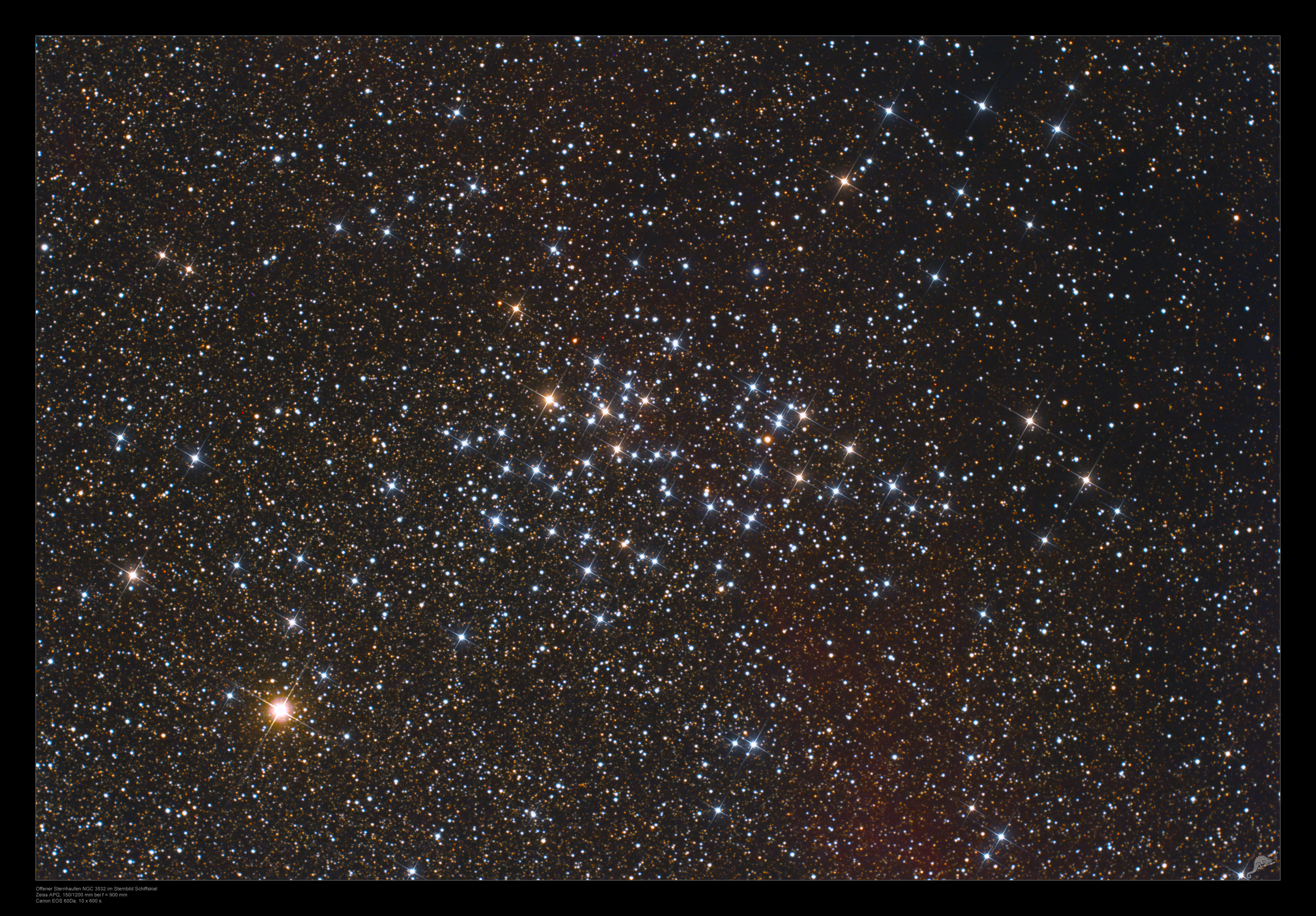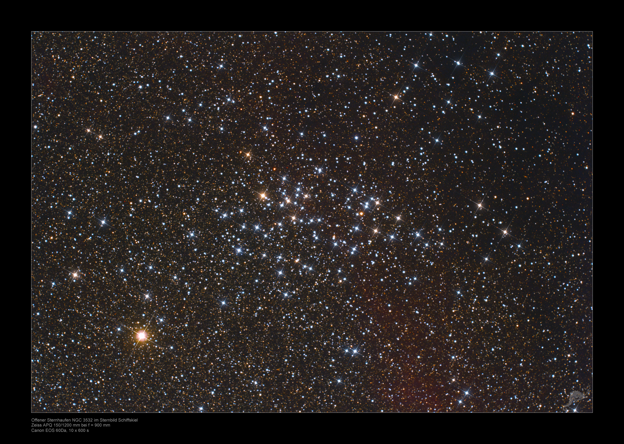 | Object description: The open star cluster NGC 3532 is located in the constellation Carina (Ship's Keel) and can already be seen with the naked eye as a nebulous patch at the edge of the Milky Way in a dark location. The informal name is "Wishing Well Cluster", as it resembles the bottom of a coin-covered well sparkling in the sunlight. Because of its elongated shape, it is also known as the Football Cluster. NGC 3532 covers slightly more than the area of the moon in the sky (45 arcminutes) and consists of about 400 stars. According to Trumpler, it is classified as type II 1 m. Recent data from the Gaia observations suggest a distance of just under 1600 light years, giving a true diameter of about 22 light years. The age of the stars in NGC 3532 is estimated to be about 300 million years, and an overall mass estimate gives a lower value of about 2000 solar masses. The bright star - in our image below left - is HD 96 918, also catalogued as the variable X Carinae. It is a classical Cepheid of the type Delta Cephei, is about 3.8 mag bright and classified as spectral type G5. The reddish region in the right half of the image belongs to the faint emission nebulae in the background, which cover the entire sky region in this area of the Milky Way. In the upper right corner, northwest of the cluster, the stellar density is much lower. Here, dark nebulae in front attenuate the stars in the background.Translated with www.DeepL.com/Translator (free version) |
