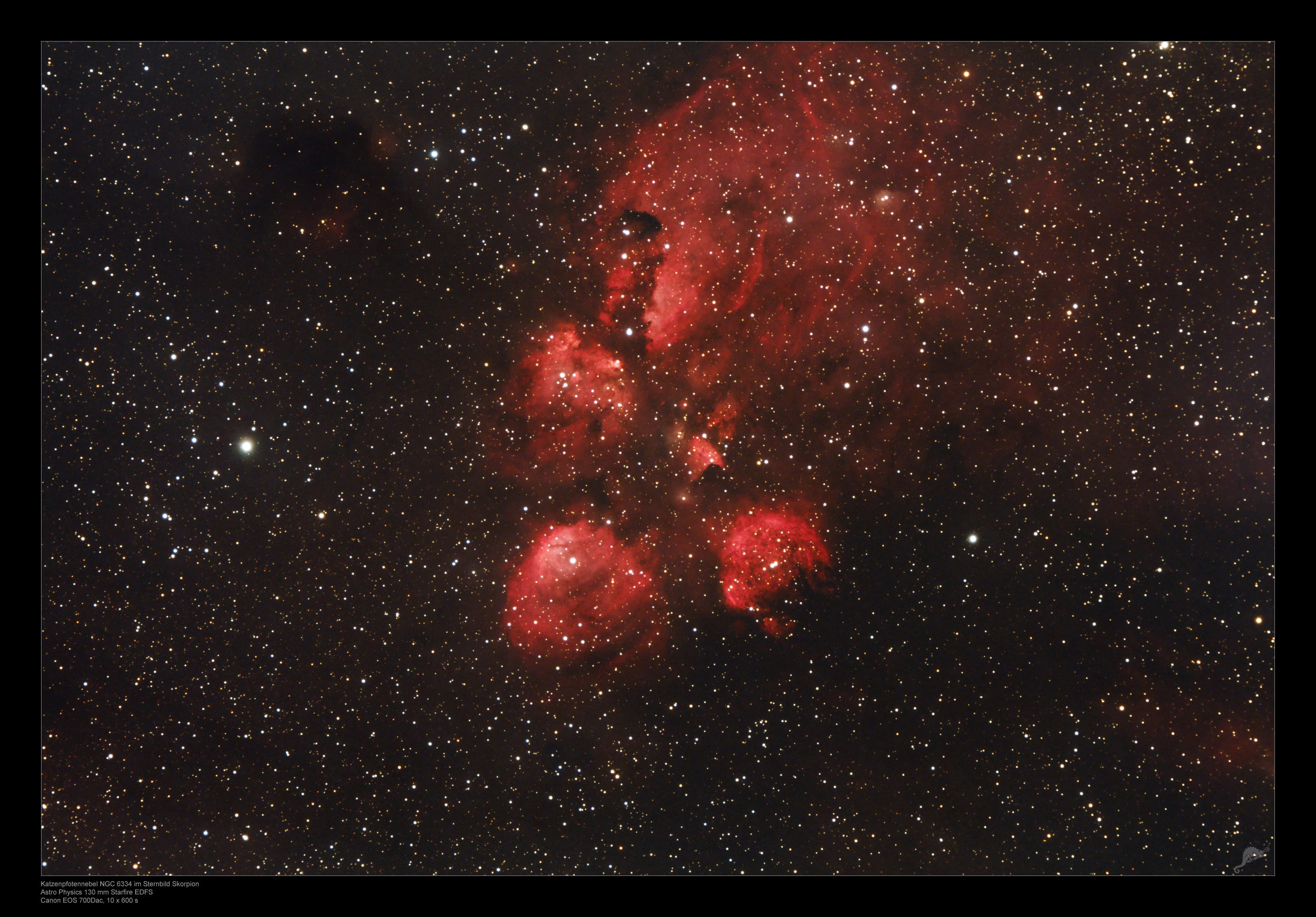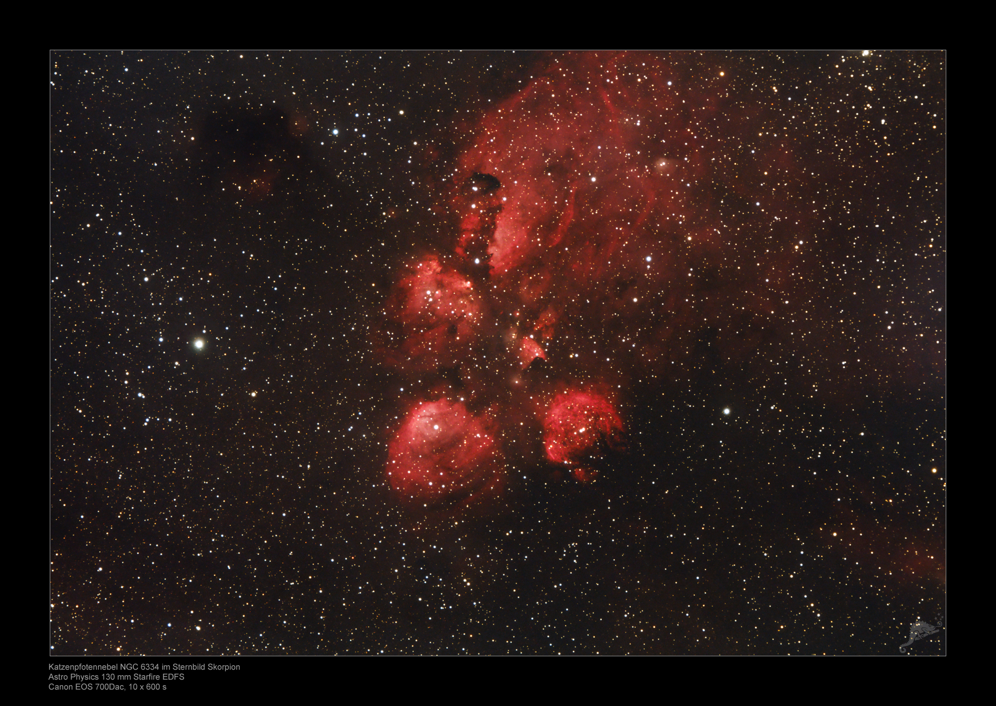 The cat's paw nebula, located in the constellation scorpius (the scorpion), is one of the most beautiful nebula in the southern sky. The whole nebula is a huge star forming region at a distance of 5500 lightyears. The diameter of this region is about 50 lightyears, corresponding to the apparent angular diameter of the moon in the sky.