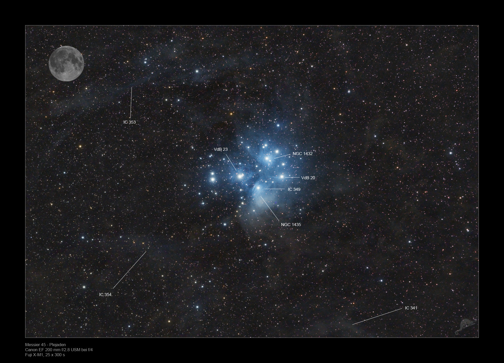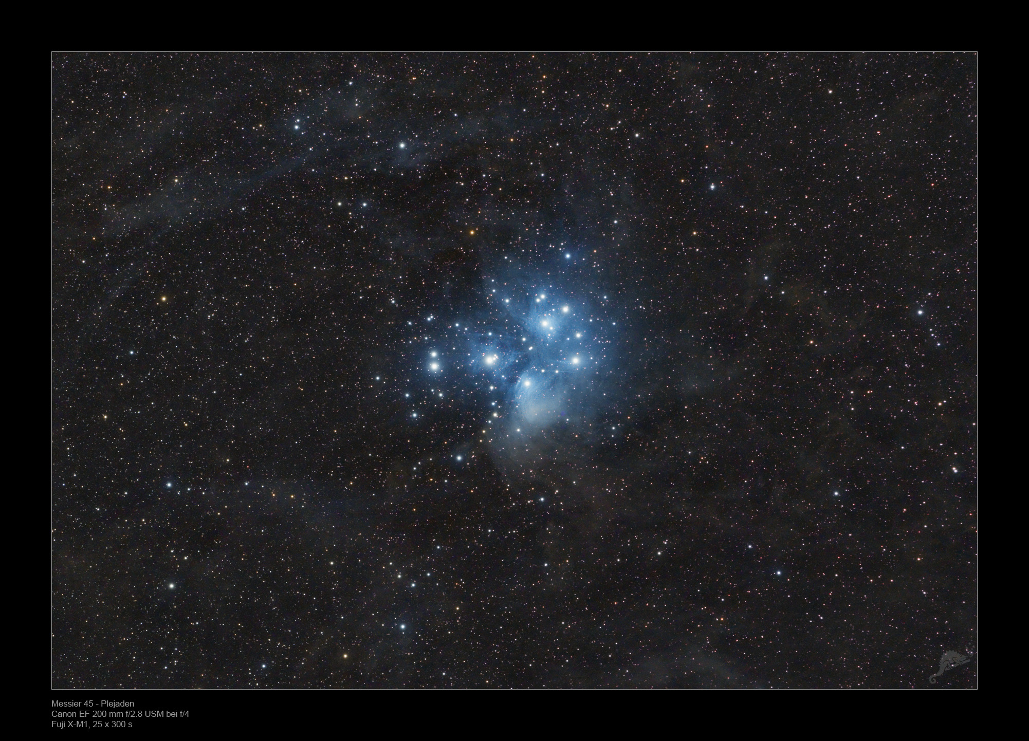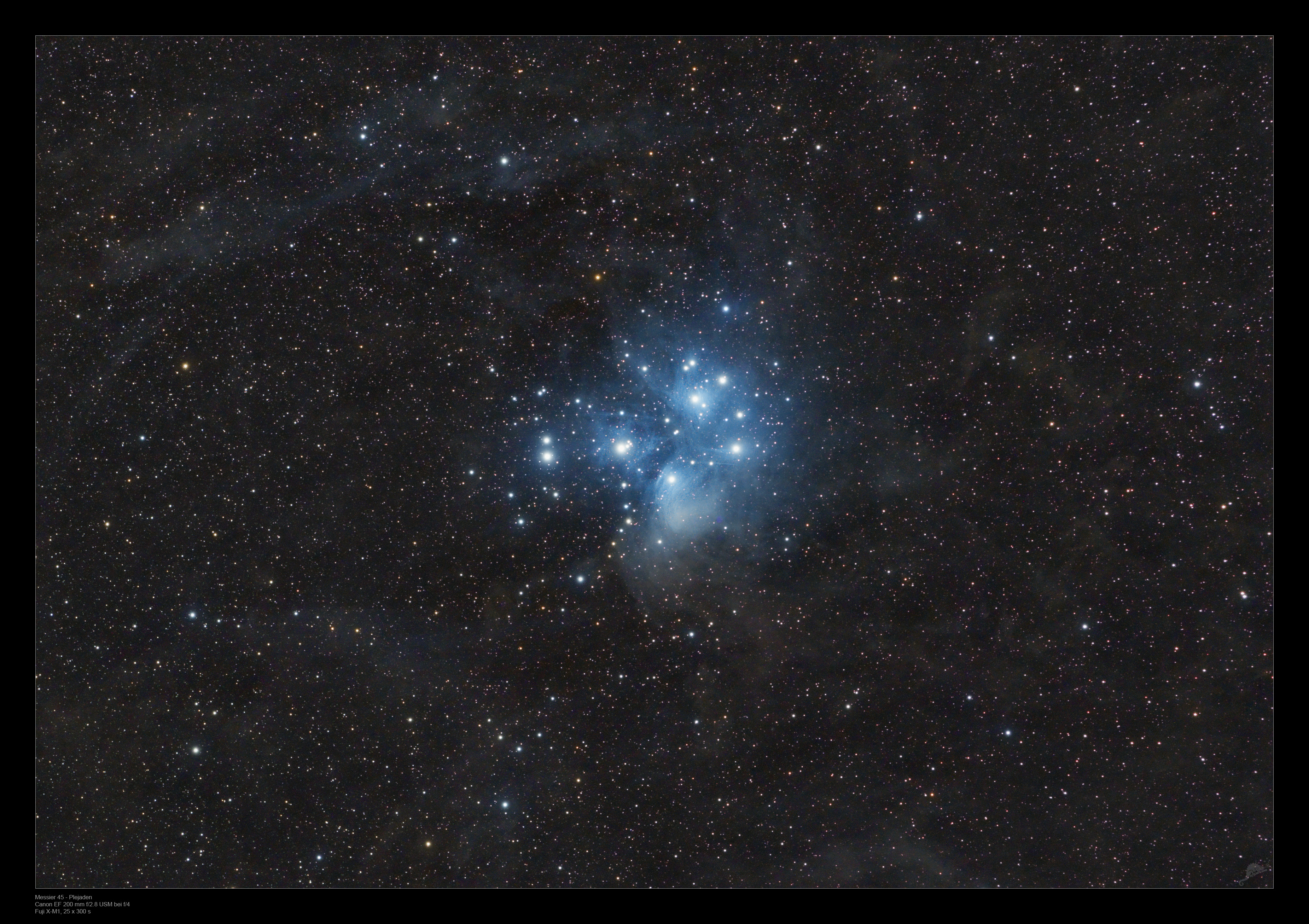 The Pleiades appear with an extension of about 2° about four times as large as the moon seen with the naked eye. The star cluster is about 445 light years away from the solar system and contains at least 1200 stars which are on average about 125 million years old. Thus it is one of the youngest open star clusters in our Milky Way and due to its proximity to the solar system also one of the best explored.