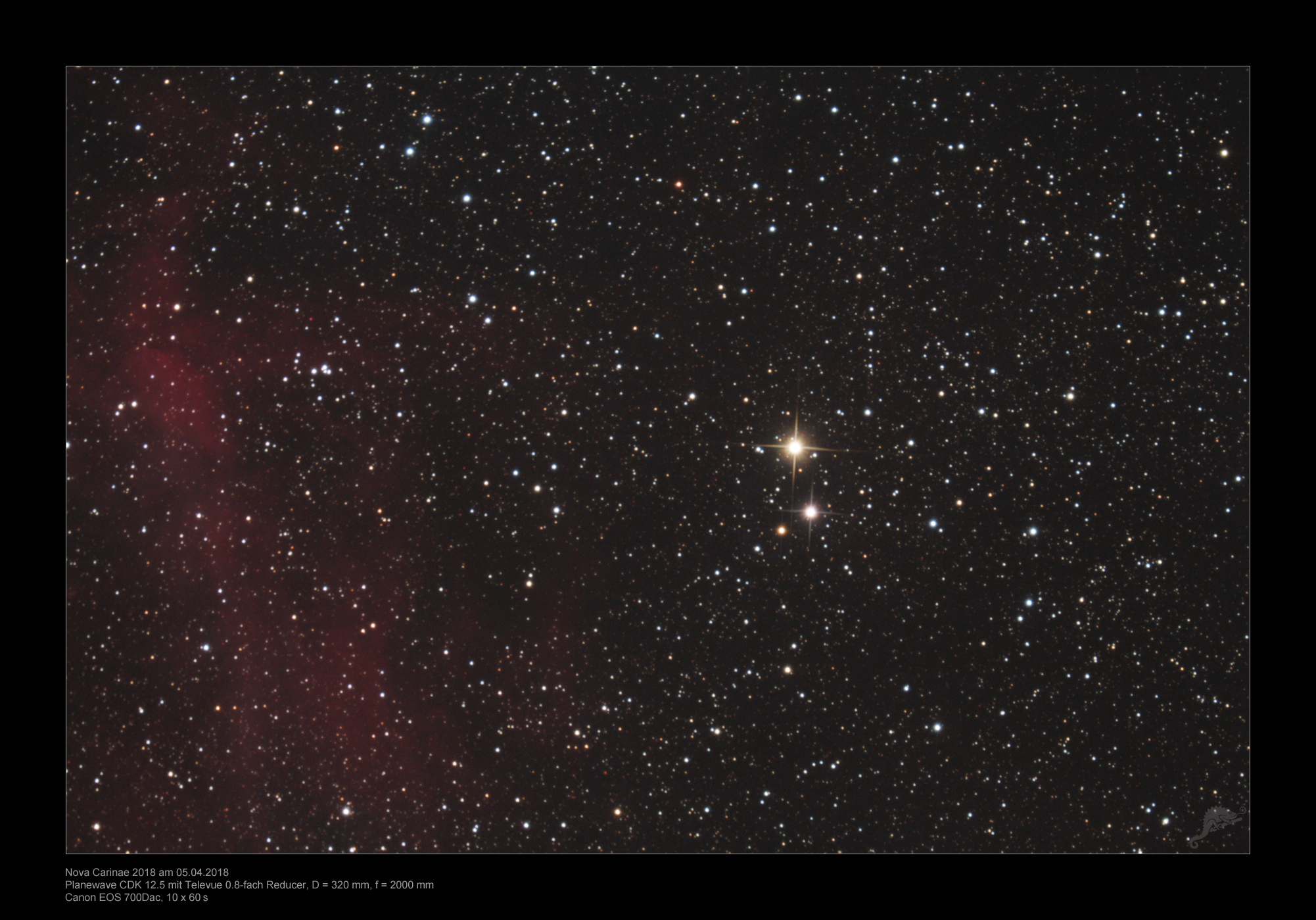 designation ASASSN-18fv The Nova Carinae was discovered on images taken on 20 March 2018 with a telescope of the project "All Sky Automated Survey for SuperNovae" (ASAS-SN). ASAS is a system of several automated, web-controlled telescopes distributed all over the world, so that the sky can be monitored from both the northern and southern hemispheres. The system is mainly used to search for novae, supernovae and other events where astronomical objects change their brightness within a short time. At the time of discovery, the brightness of the Nova was brighter than 10th magnitude. The star is positioned just west of the large Carina star formation area NGC 3372 and directly south of the star HD 92 063 of the 5th magnitude. The celestial coordinates of the Nova (epoch J 2000) are: Rectacension: 10h 36m 13.7s, Declination: -59° 35´55". We were very lucky that one of us (Paech) was in Namibia from March 21 to April 20. Despite the still prevailing rainy season, some good pictures of the Nova Carinae could be taken on two clear nights. |