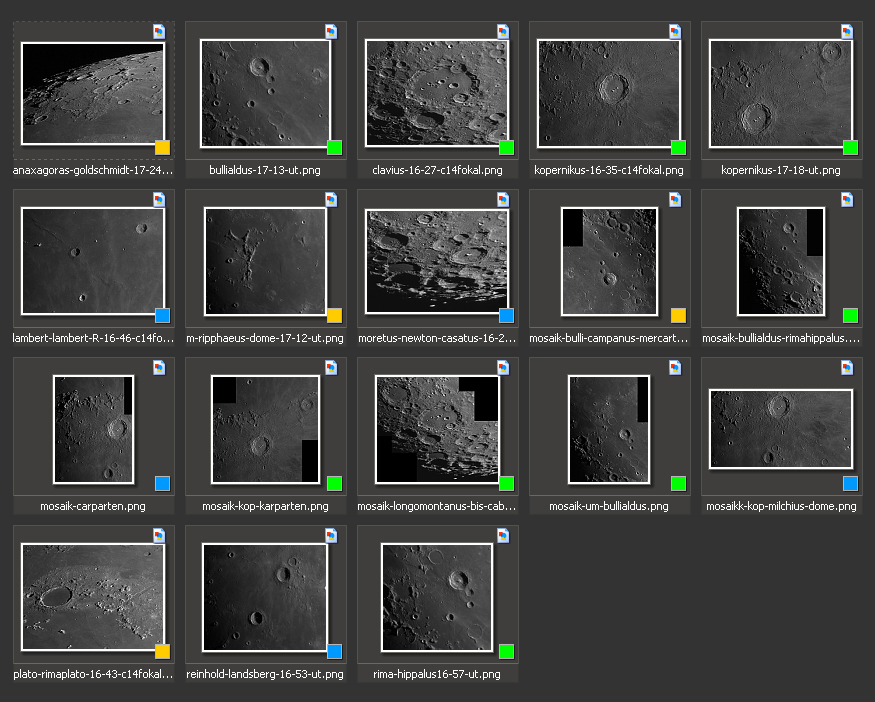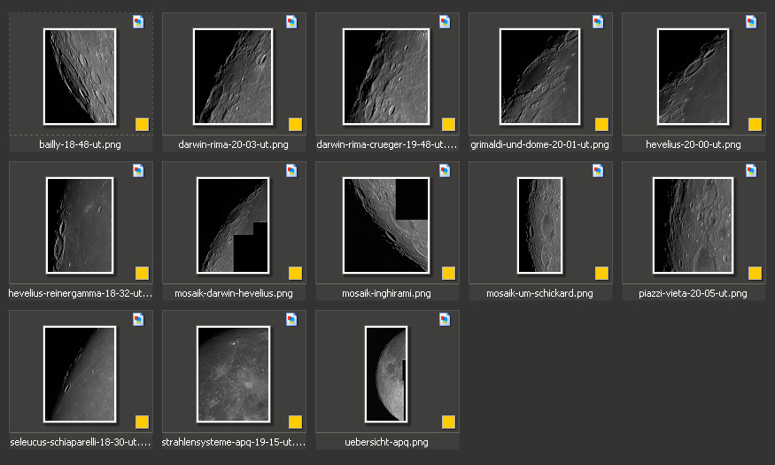 page The following images were taken on August 17, 2013. The acquisition time is given in UT and can be read from the filename. The phase of the moon was waxing, 10.8 days with an illumination of 84.7%. |