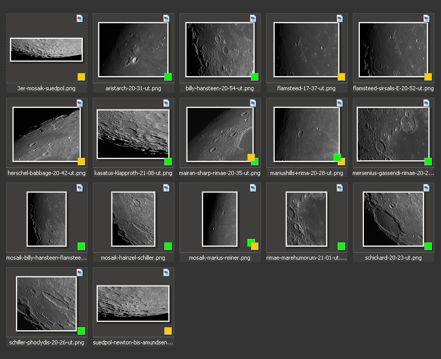 page The following images were taken on August 16, 2013. The acquisition time is given in UT and can be read from the filename. The phase of the moon was waxing, 9.8 days with an illumination of 75.2%. |