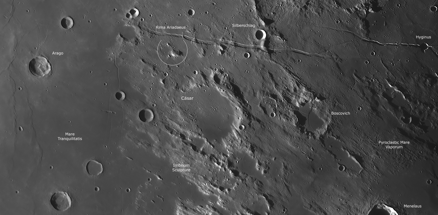 of the image is the 220km long and up to 7km wide groove Rima Ariadaeus. It is