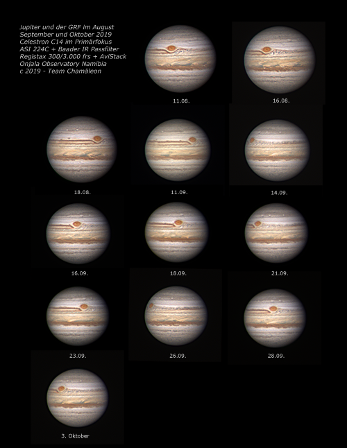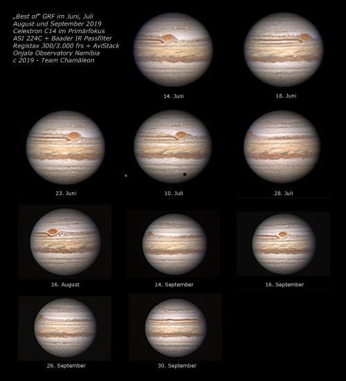 On 10 June 2019 Jupiter was in opposition to Earth. At a distance of only 641 million km from Earth, the planet appeared with an apparent diameter of 46 arc seconds. At our observation site in Namibia, Jupiter culminated at an altitude of up to 89 degrees above the horizon.