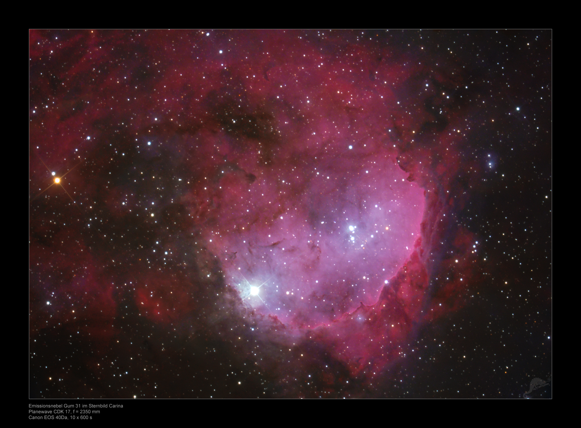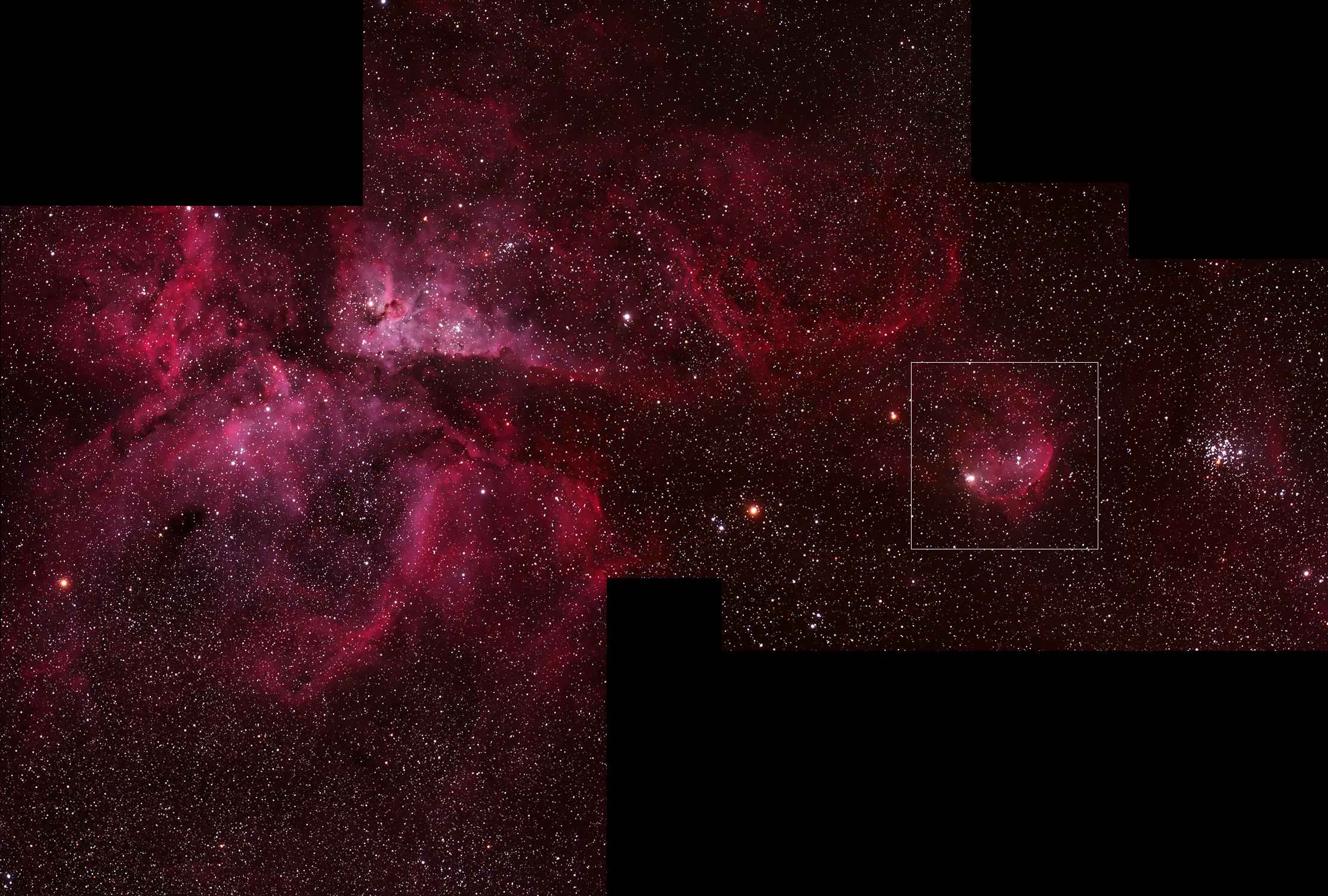 Gum 31 can be found directly northwest of the well-known Eta Carinae Nebula and