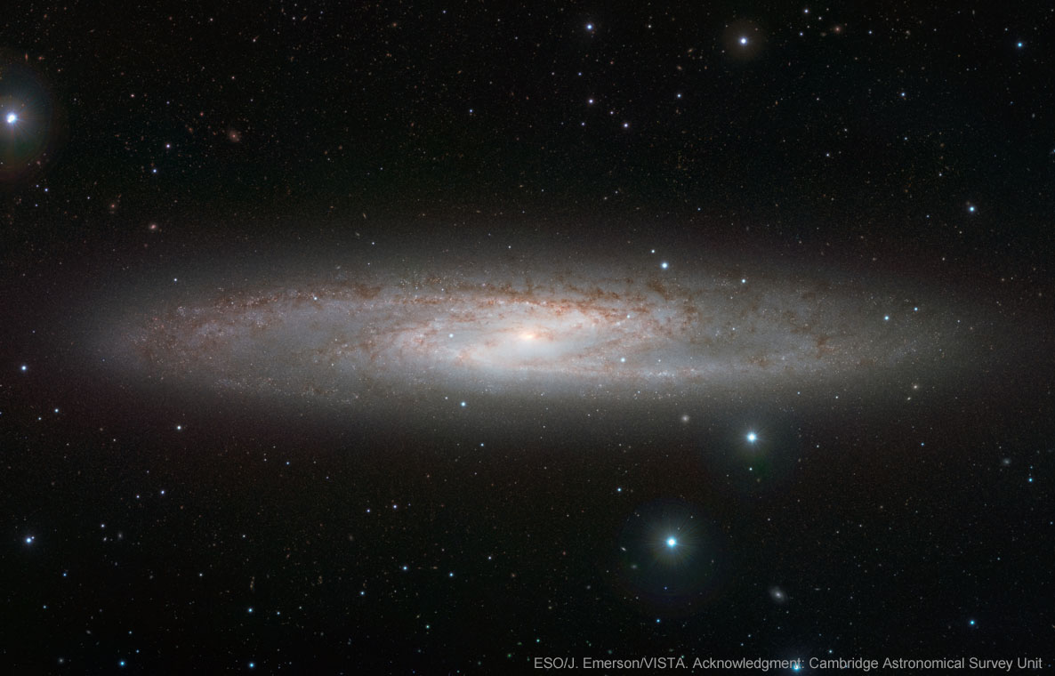 253 is a spiral galaxy with a central bar, which we see under a very shallow