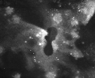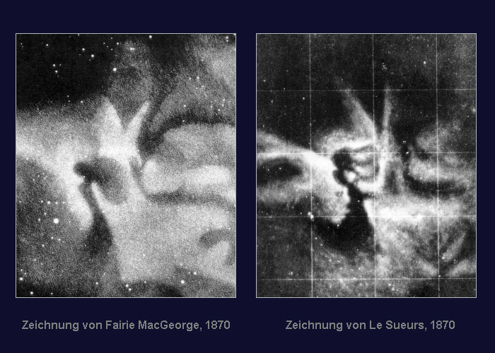 | "Herschel's Keyhole Nebula" "Herschel's Keyhole Nebula" is right next to Eta Carinae. Its optical appearance is closely connected to the brightness variations of Eta Carinae. The keyhole partly consists of dark clouds which block the view to regions behind. The dark semi-circle shaped upper structure seems to be more of deepening of the dark clouds. This deepening seems to expand and has its own name - the Eta Carinae-II-Ring. In 1843 Herschel also saw bright nebula parts in the southern part of the nebula which are completely vanished today. They are interpreted as reflection nebula which were directly illuminated by Eta Carina back at the time. |