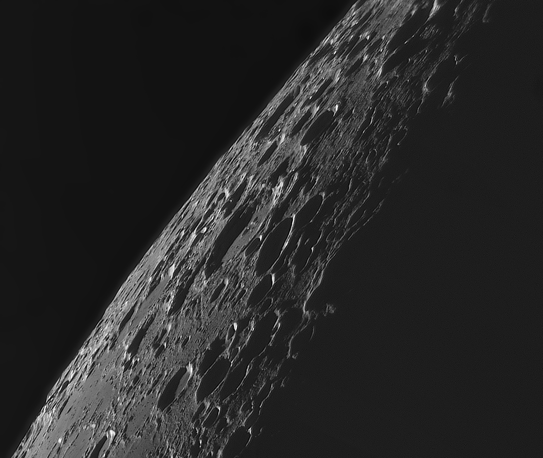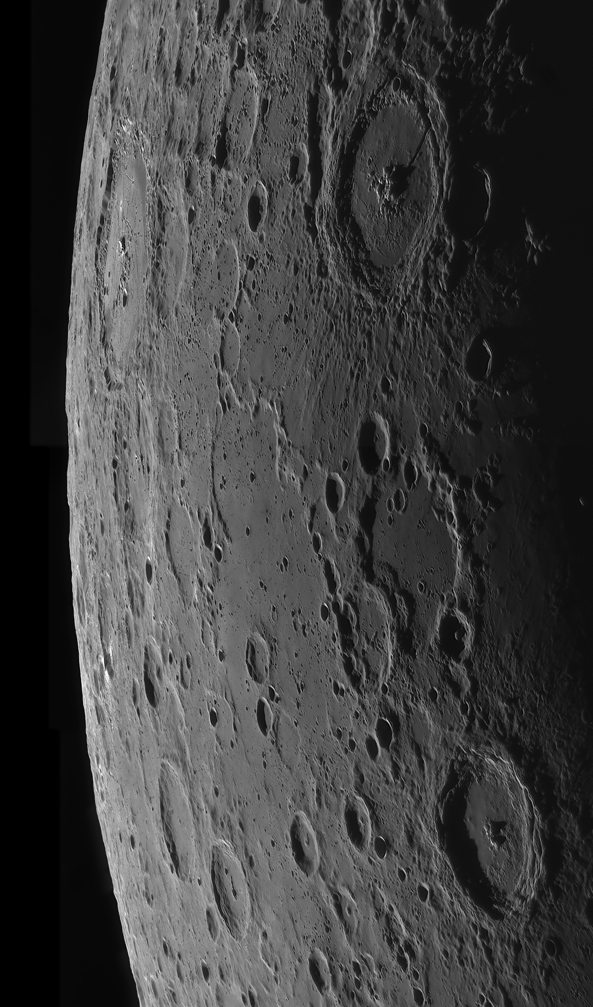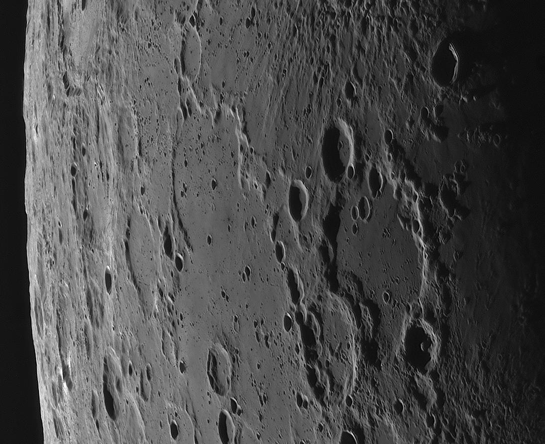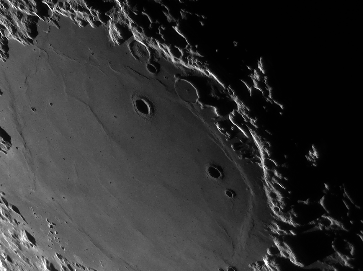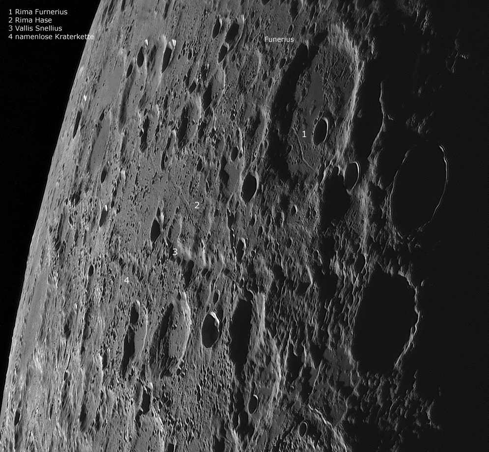 details Image 0003 - shows Mare Crisium at sunrise. Image quality is not so good but one can see the complete mare ridge system in Crisium Image 0001 - shows the crater Furnerius at the southeaster limb. Some more structures are visible; Rimae Hase, Vallis Snellius and a short nameless crater chain (all labelled in the image). Rimae Hase may be an extension of the large rille in the crater Petavius, see also theLRO (Lunar Reconnaissance Orbiter) image in an äquidistant projektion with a image resolution of 125m/pxl. Image 0005 B - shows the Mare Marginis with the Marginis Swirl (marked in the image), one of the few of these "mysterious" patterns on the front of the moon.. LRO image of the Marginis Swirl at a resolution of 125m/pxl ( Lunar Reconnaissance Orbiter) Detailed descriptions of other exceptional or unique structures at this moon age you can find in this pdf-file |