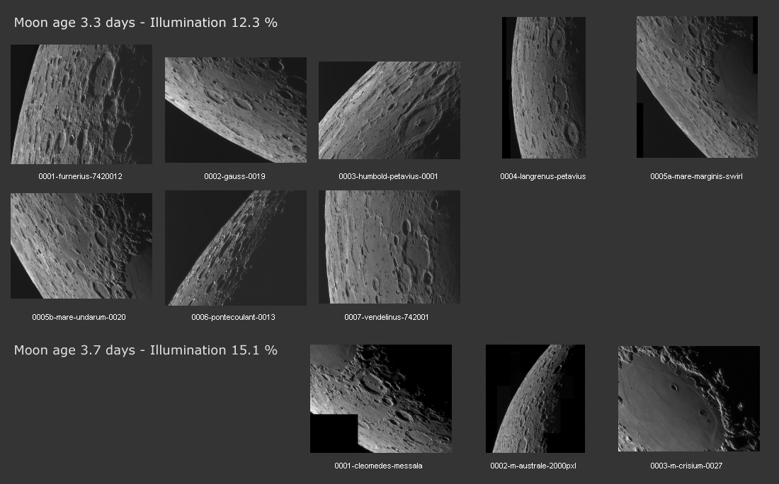 | Please note: Some of the images - taken at a moon age between 3.3 and 3.7 days - don't reach the normal high quality of the atlas. This is caused by the short angular distance between Sun and Moon and the low elevations of the moon. We include it in the atlas because they are rare images which also show some very interesting structures of the Moon. Such images only in near infrared successful. We used a Baader IR pass filter, which opens at a wavelength of 685 nanometers. All video files were taken about 1 hour before sunset and are completely from the year 2016. | |||||||||||||||||||||||||||||||||||||||||||||||||||||||||