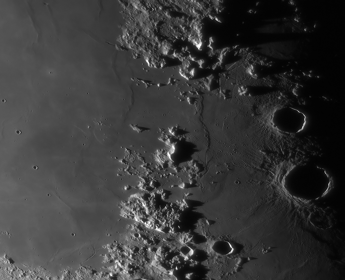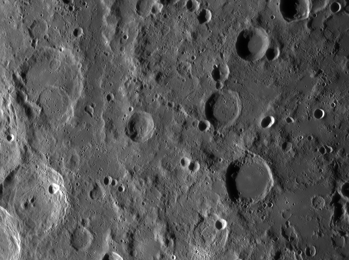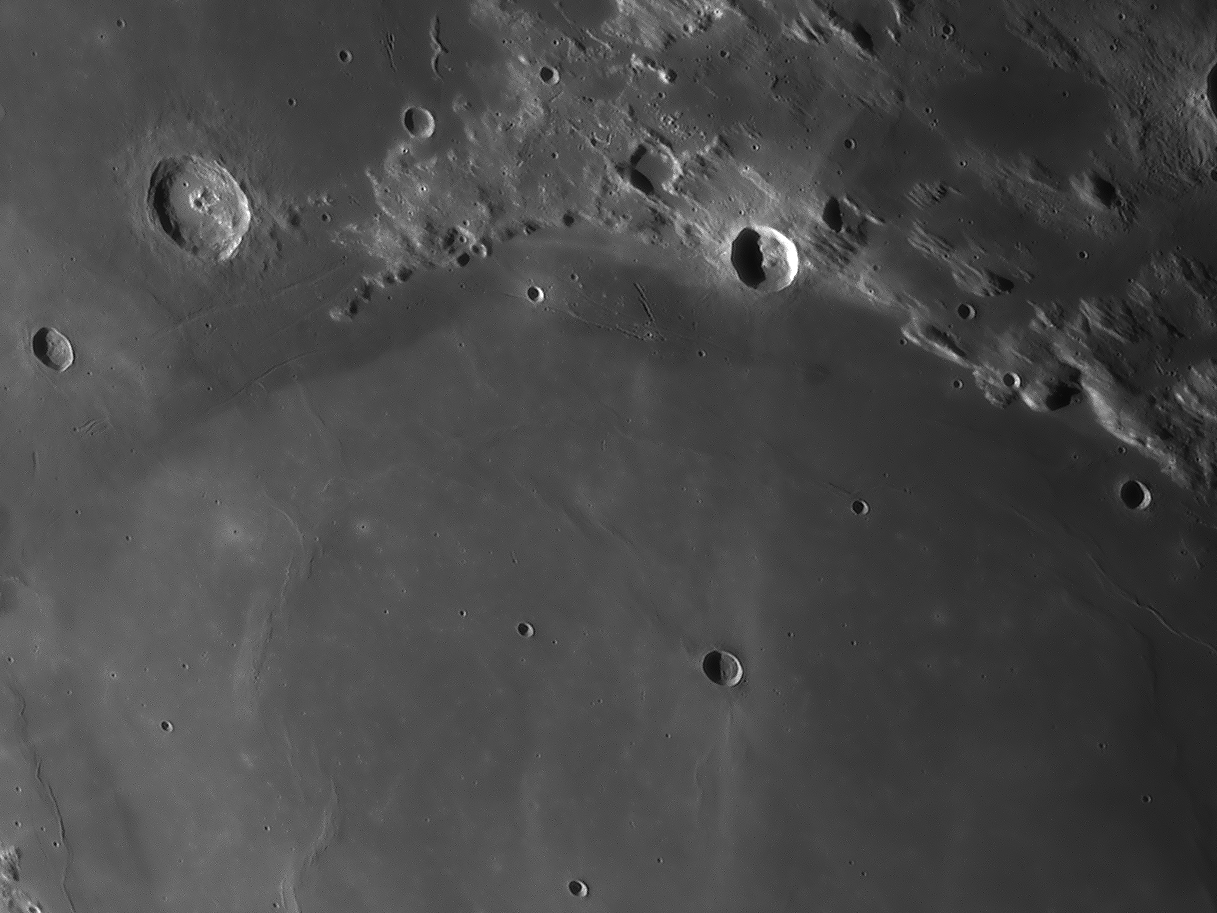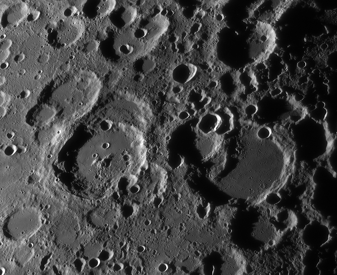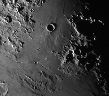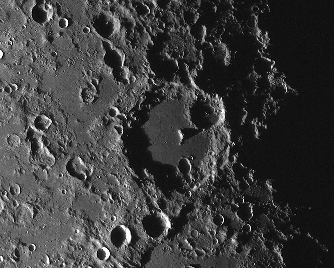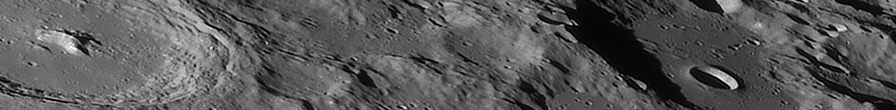 | Interesting image details Image 003 - shows the crater chain Catena Abulfeda which presumably originated from a fragmented comet Image 007 - shows Caldera Hyginus, Rima Hyginus and further to the north the large pyroclastic ash field Mare Vaporum NEW 2016 - Das Bild 0013 - shows the crater Albategnius. On the crater floor are some shallow depressions that are visible only in a narrow time window of illumination around a Moon age of 7.8 days. NEW 2016 - Das Bild 0032 - shows the strange crater Heraclitus. In the central part there is an elongated montain ridge that divides the crater. There are only two similar craters on the near side of the moon: Schiller and Delaunay. To the north lie the great craters Stöffler and Maurolycus. The moon age was 7.8 days. Detailed descriptions of other exceptional or unique structures at this moon age you can find in this pdf-file |