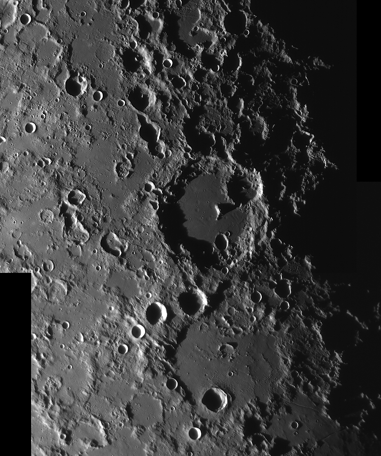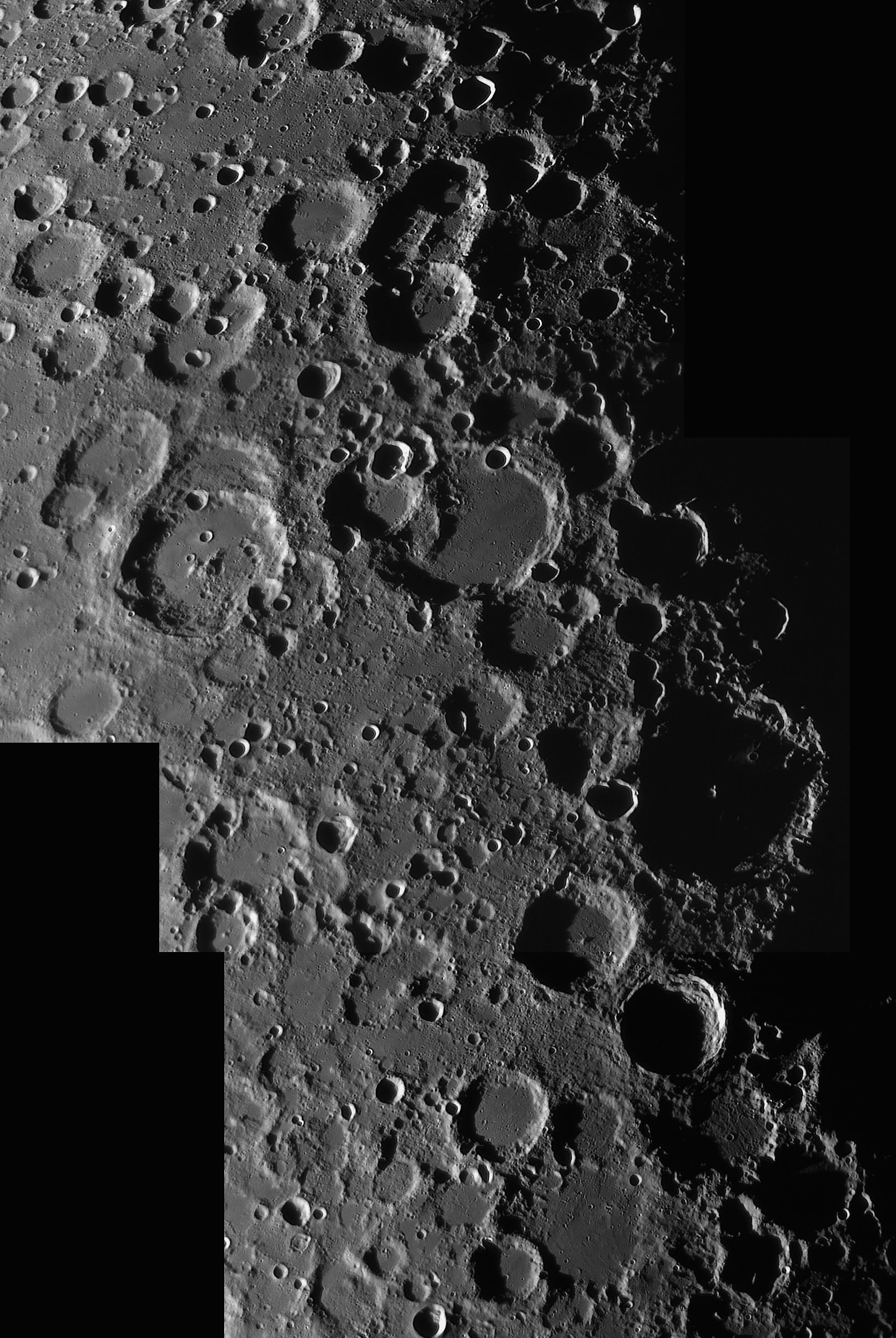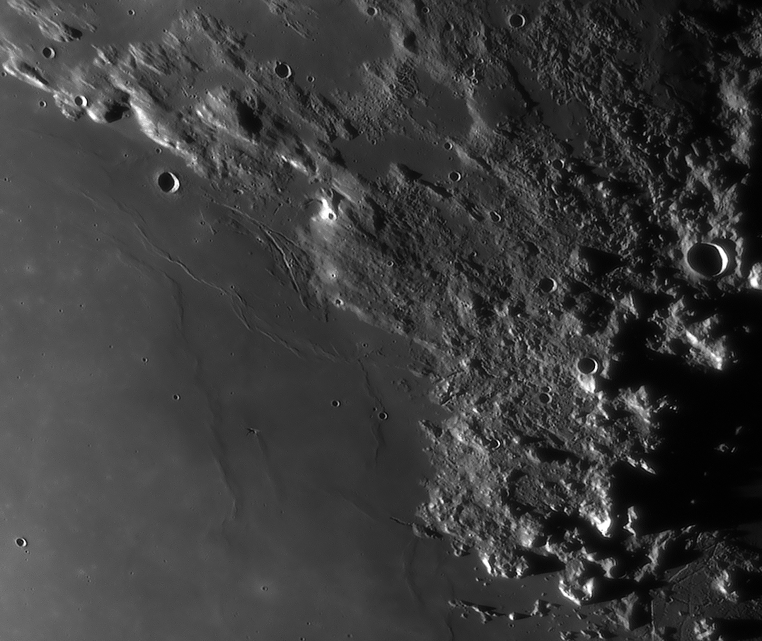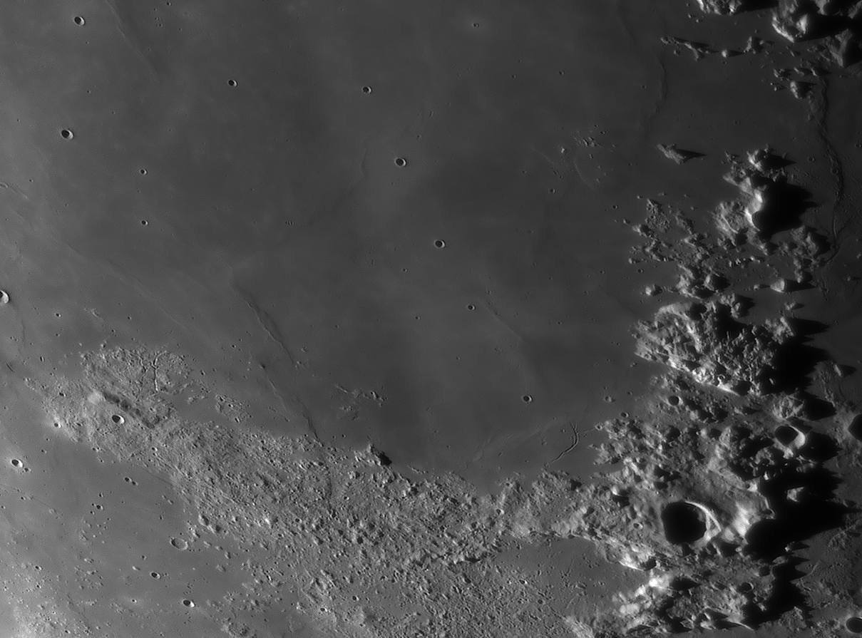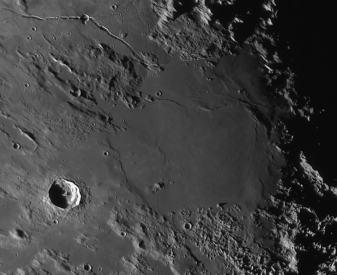 | Interesting image details Image 003 - shows the crater chain Catena Abulfeda which presumably originated from a fragmented comet Image 007 - shows Caldera Hyginus, Rima Hyginus and further to the north the large pyroclastic ash field Mare Vaporum NEW 2016 - Das Bild 0013 - shows the crater Albategnius. On the crater floor are some shallow depressions that are visible only in a narrow time window of illumination around a Moon age of 7.8 days. NEW 2016 - Das Bild 0032 - shows the strange crater Heraclitus. In the central part there is an elongated montain ridge that divides the crater. There are only two similar craters on the near side of the moon: Schiller and Delaunay. To the north lie the great craters Stöffler and Maurolycus. The moon age was 7.8 days. Detailed descriptions of other exceptional or unique structures at this moon age you can find in this pdf-file |